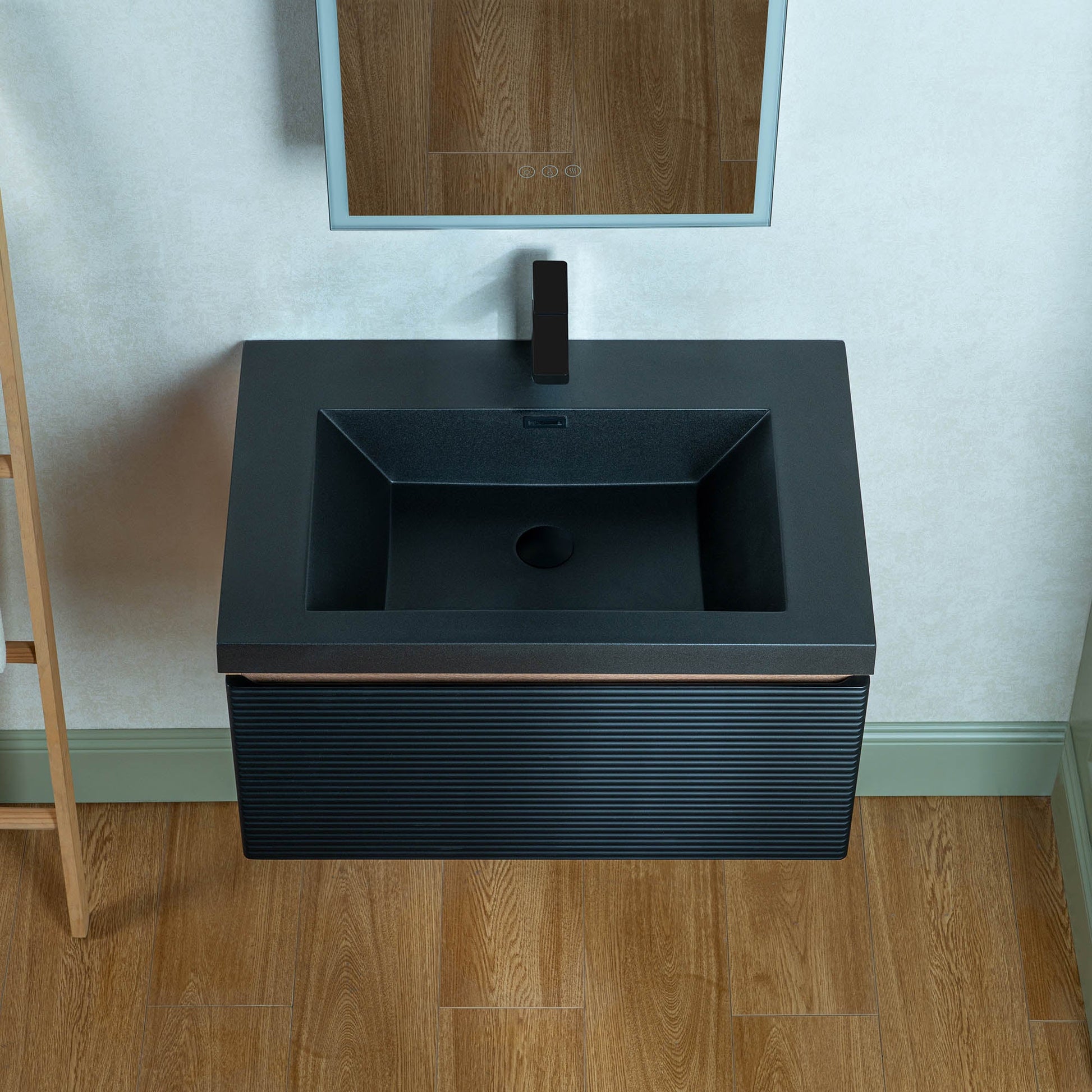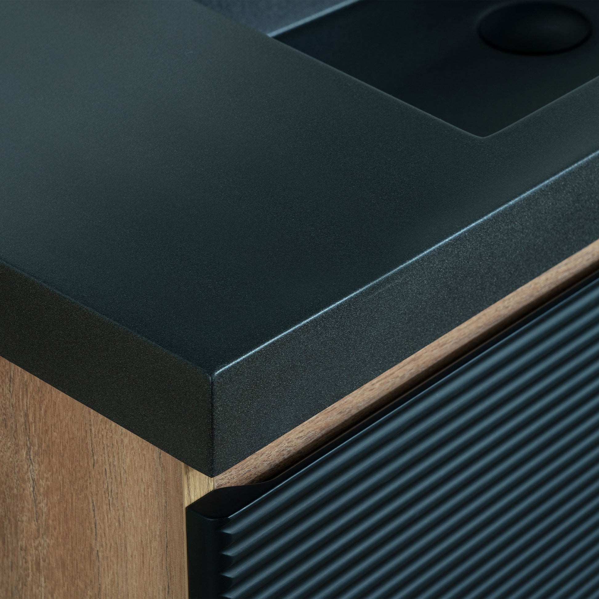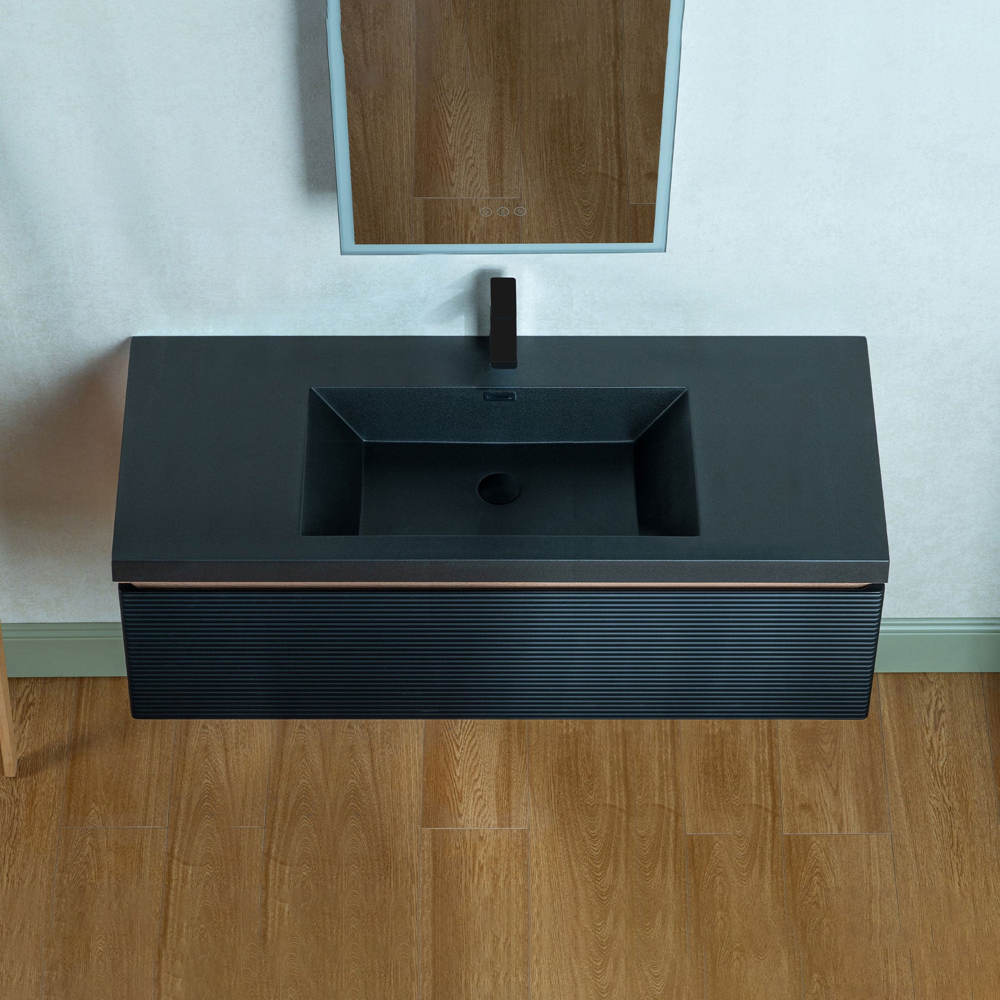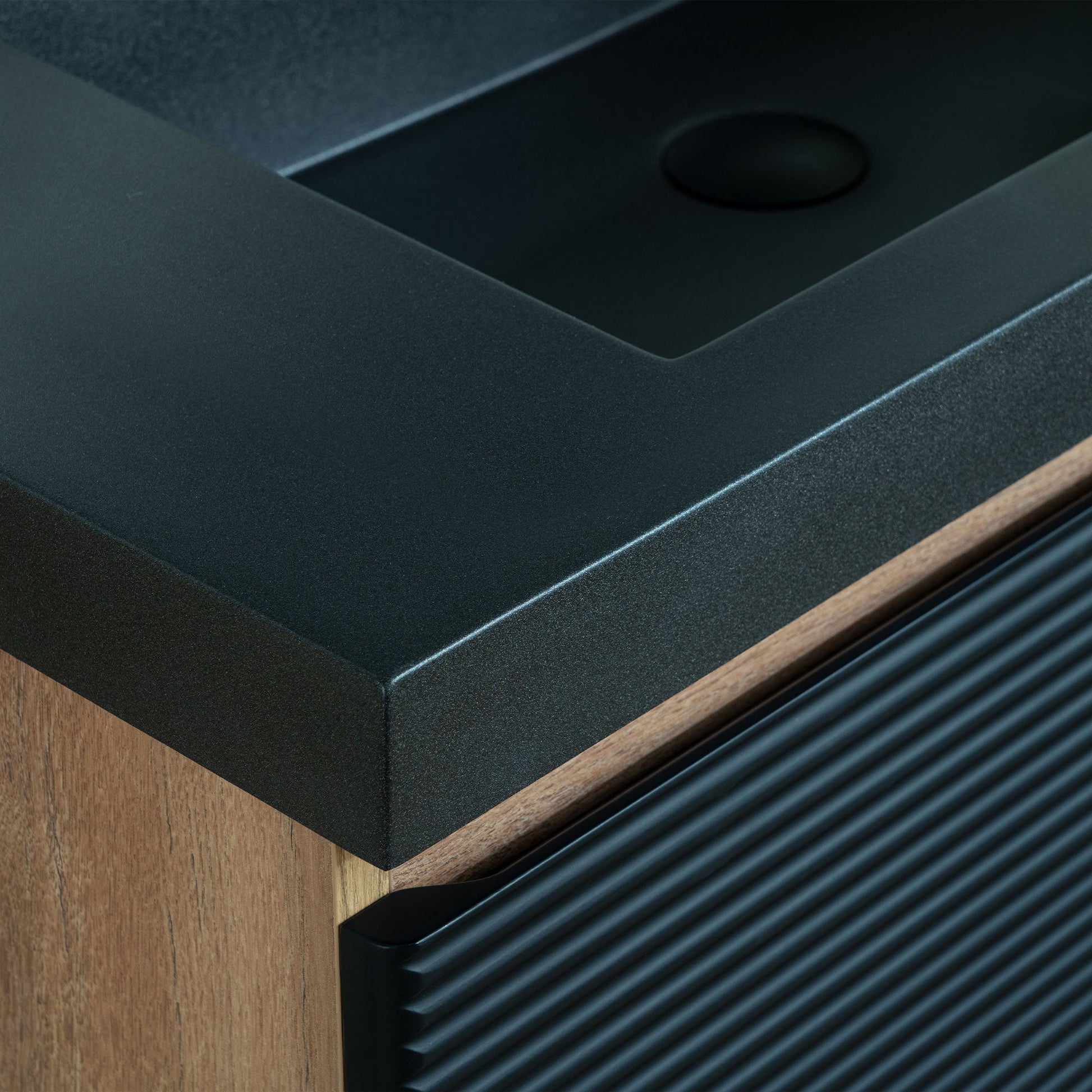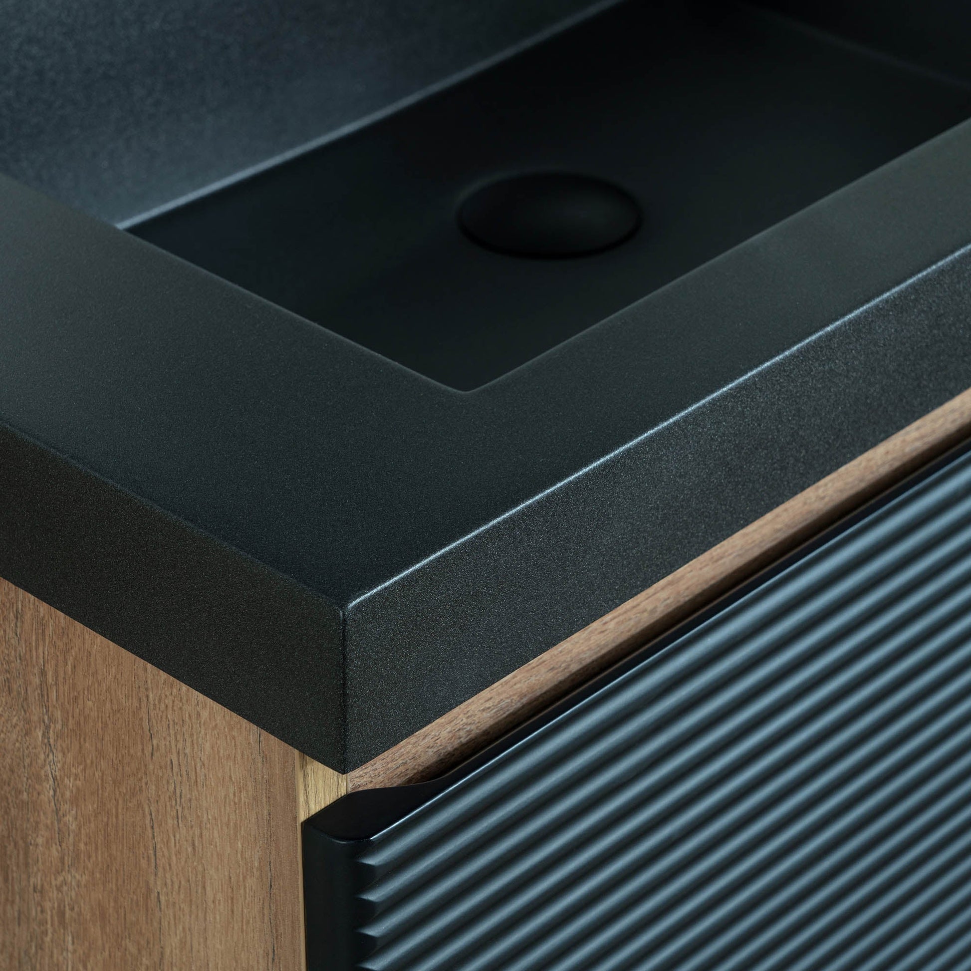 ? [TEXTURED FRONT PANEL]: The front of the cabinet features horizontal ridges, creating a textured visual effect that enhances its modern aesthetic. The black color of the panel complements the sink.