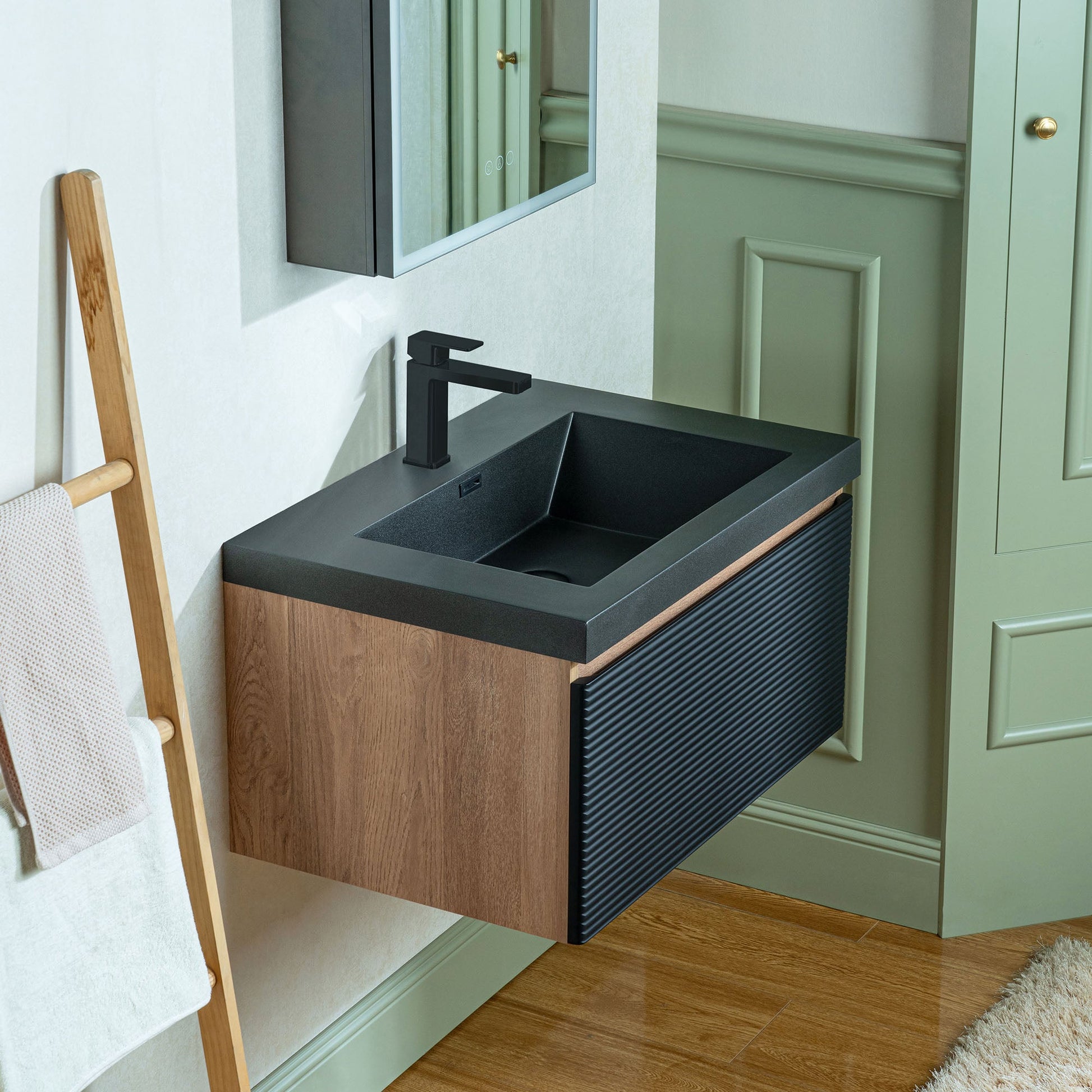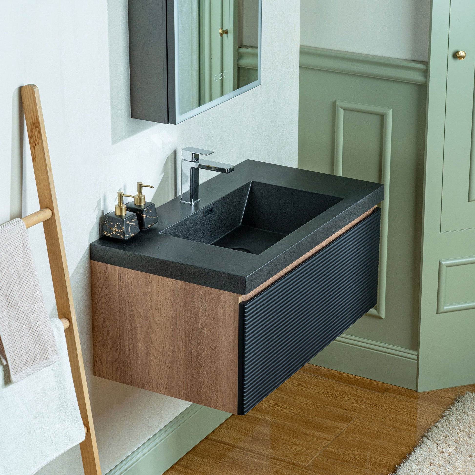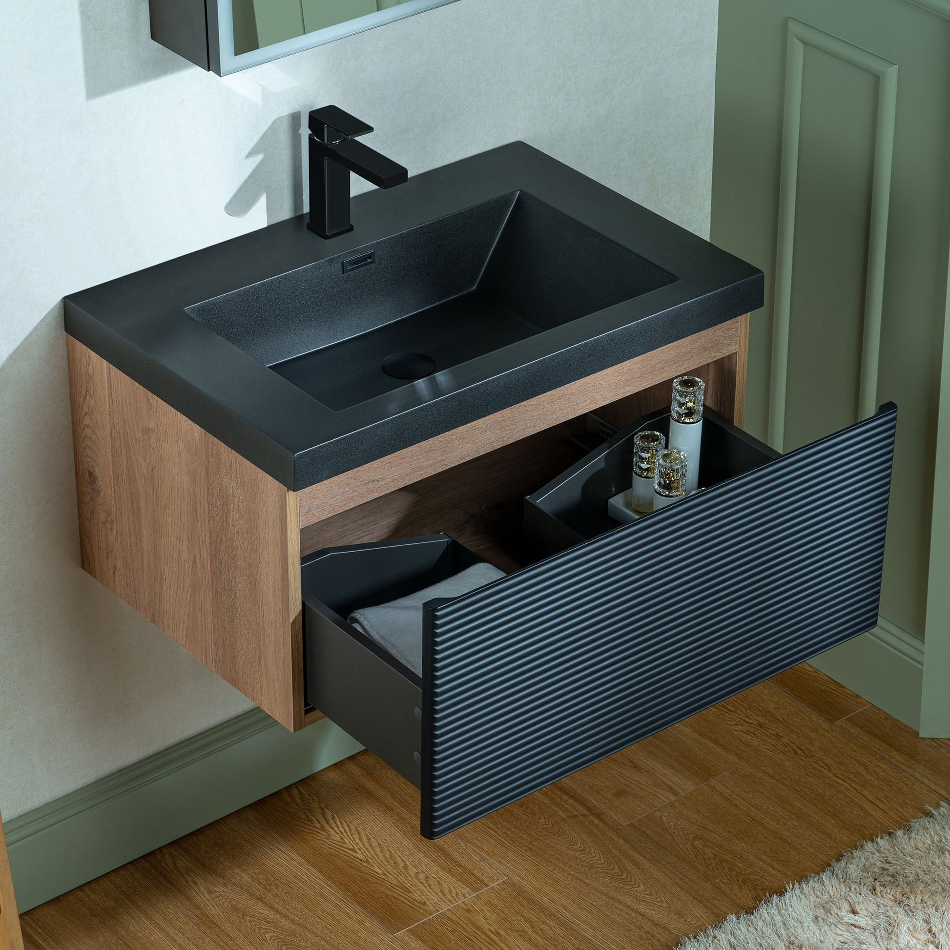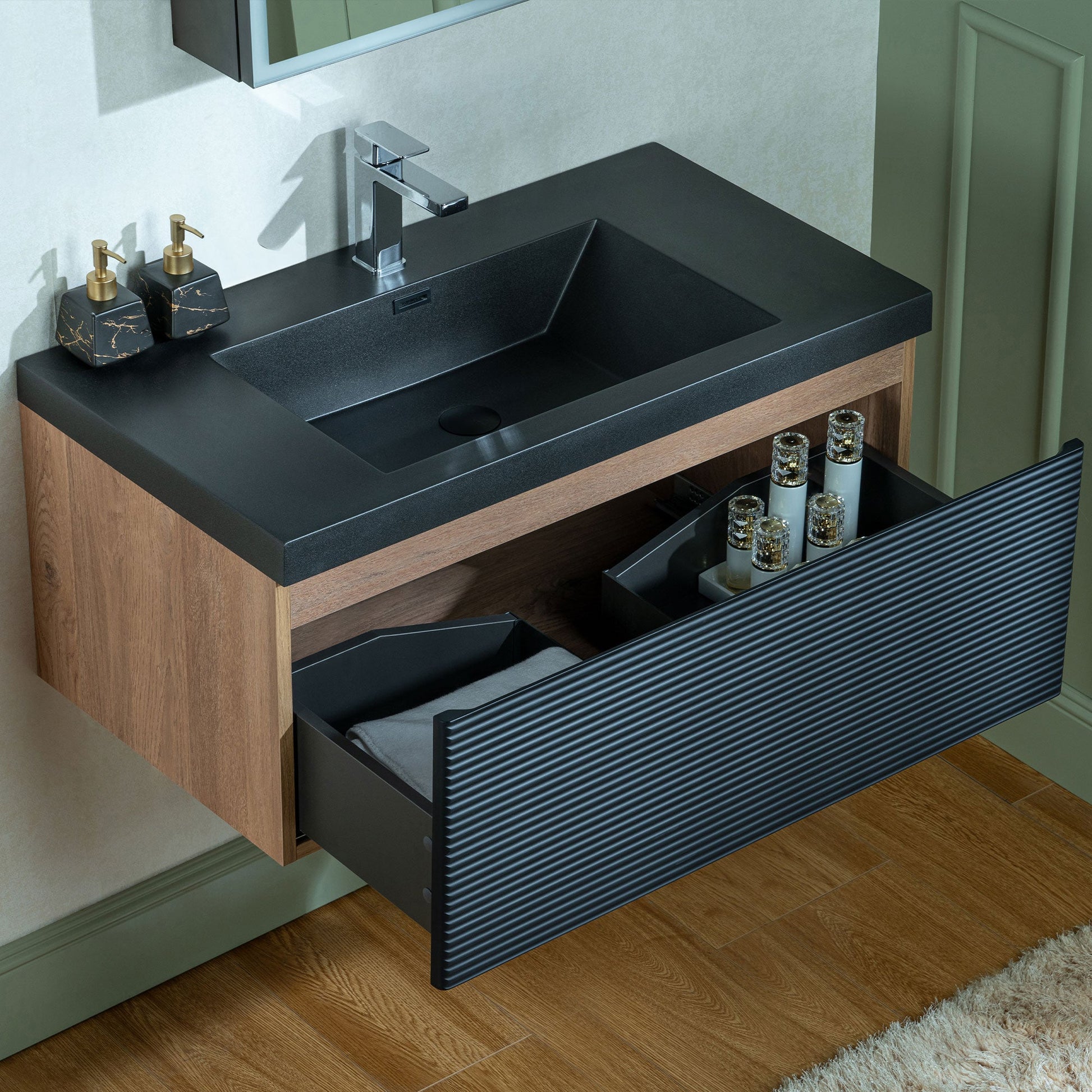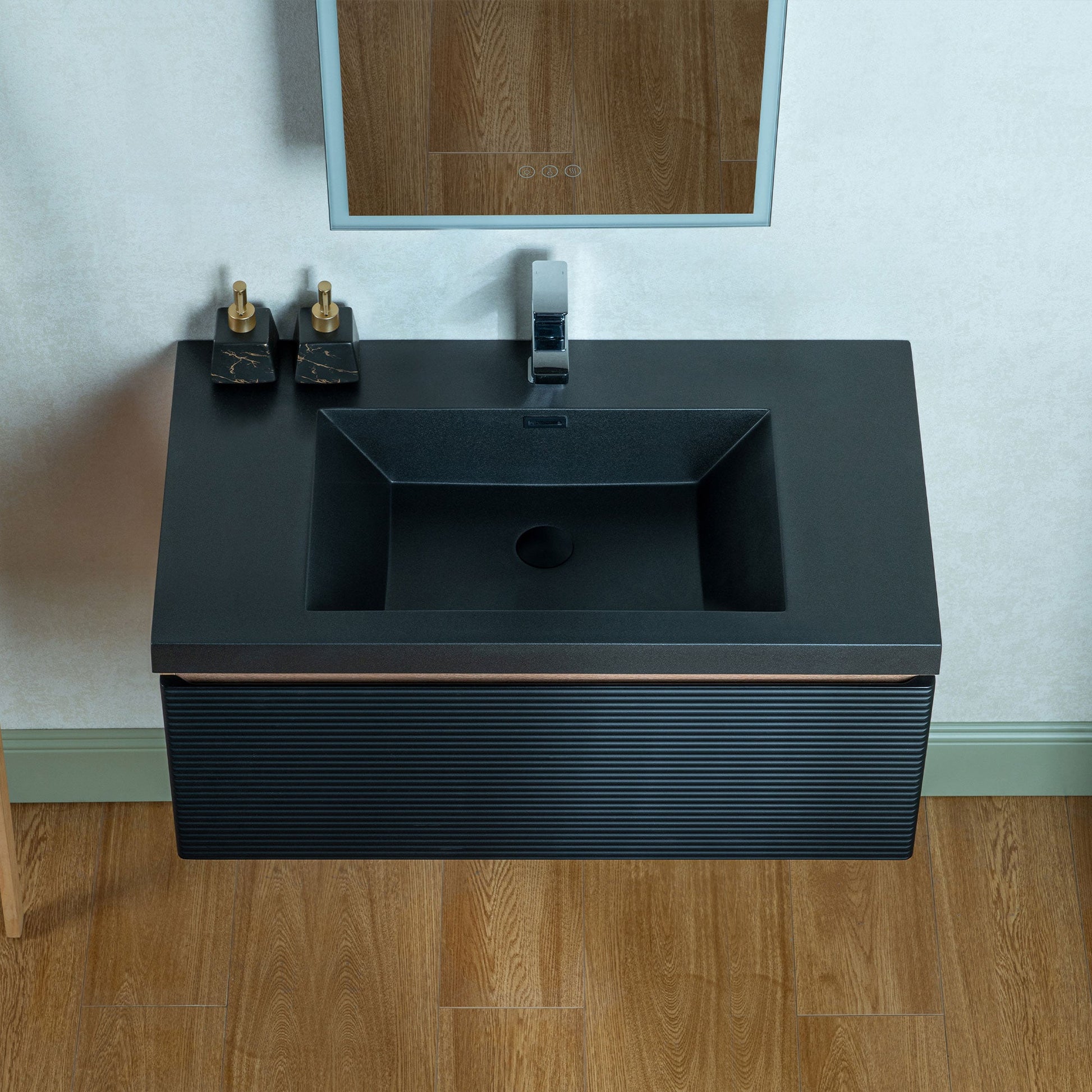 ? [TEXTURED FRONT PANEL]: The front of the cabinet features horizontal ridges, creating a textured visual effect that enhances its modern aesthetic. The black color of the panel complements the sink.
