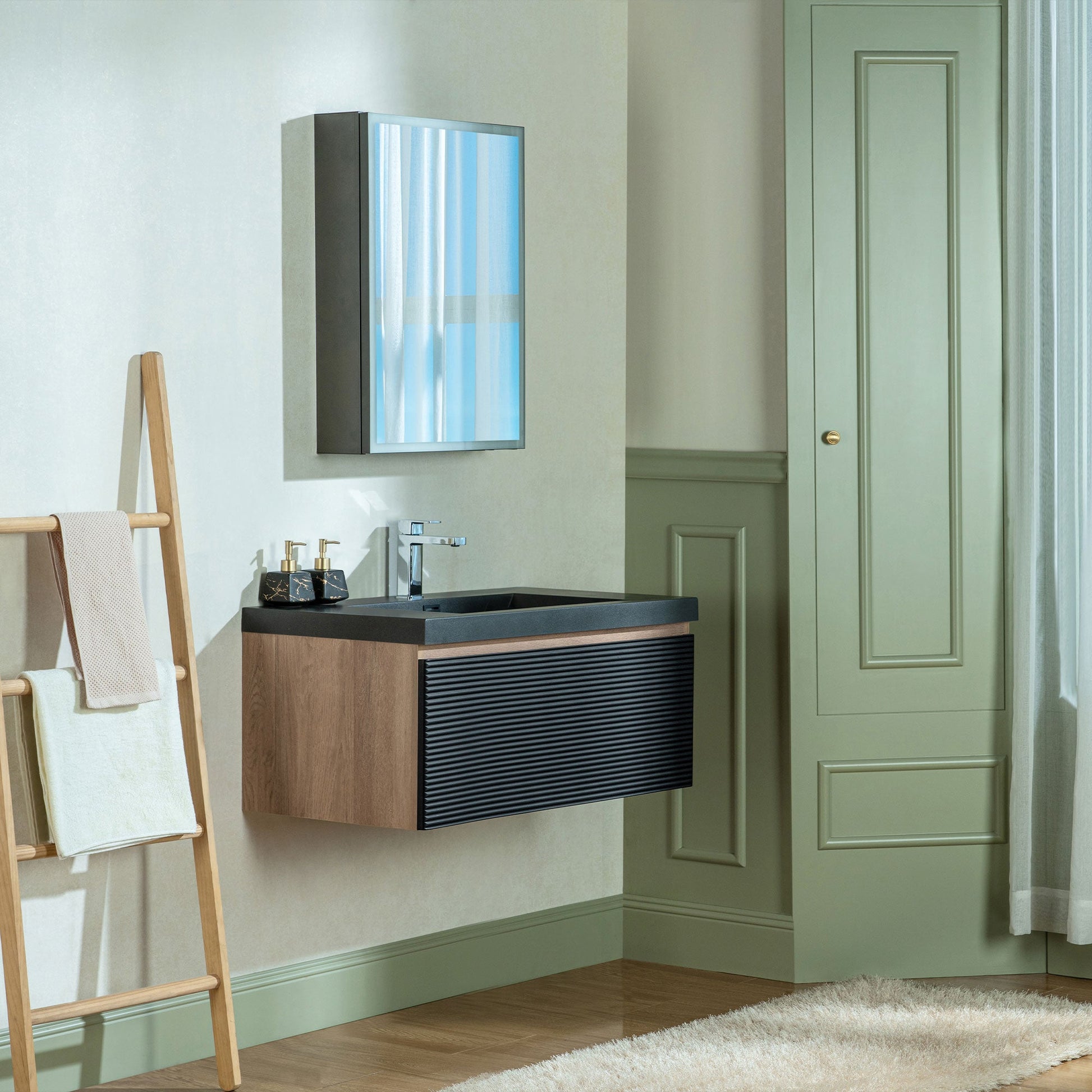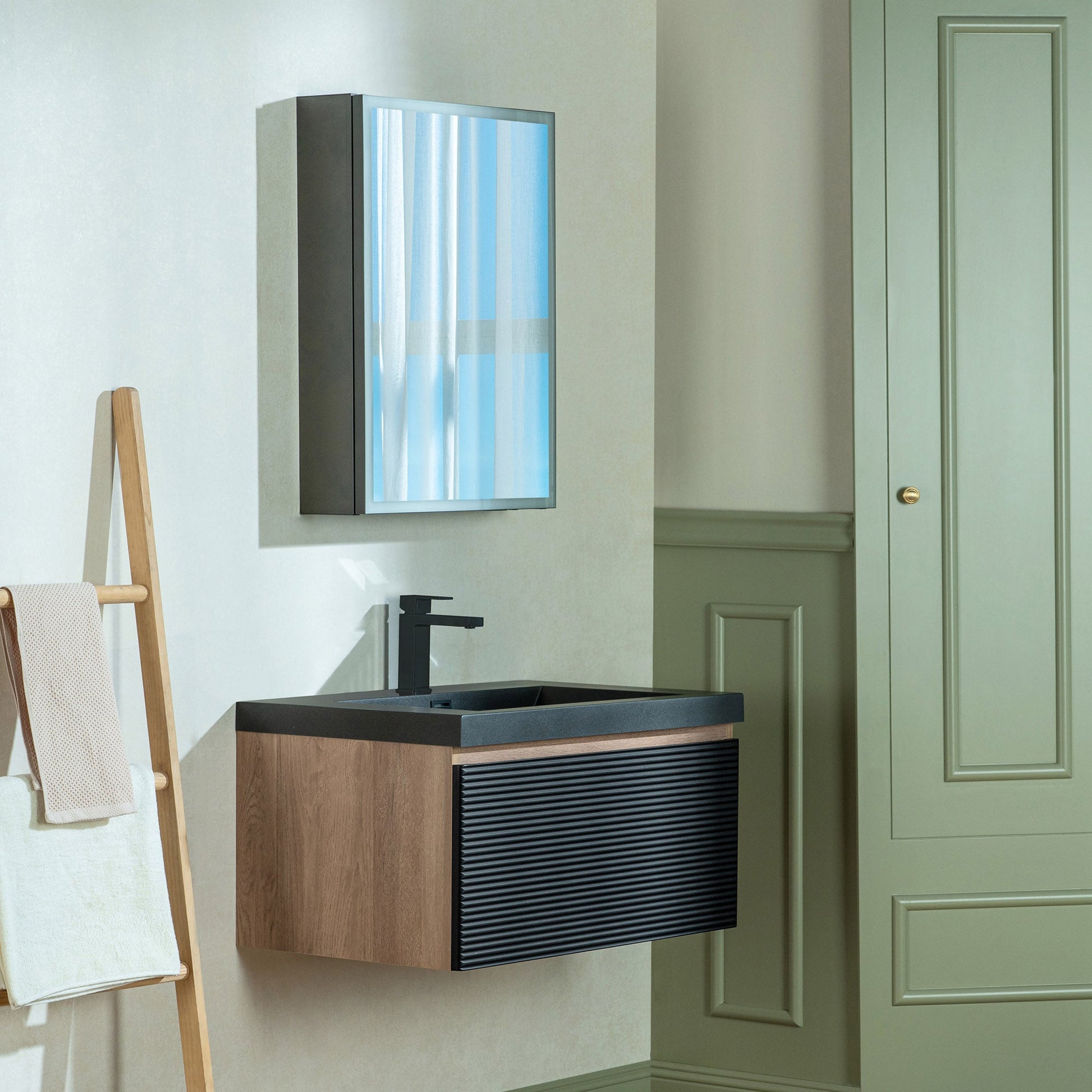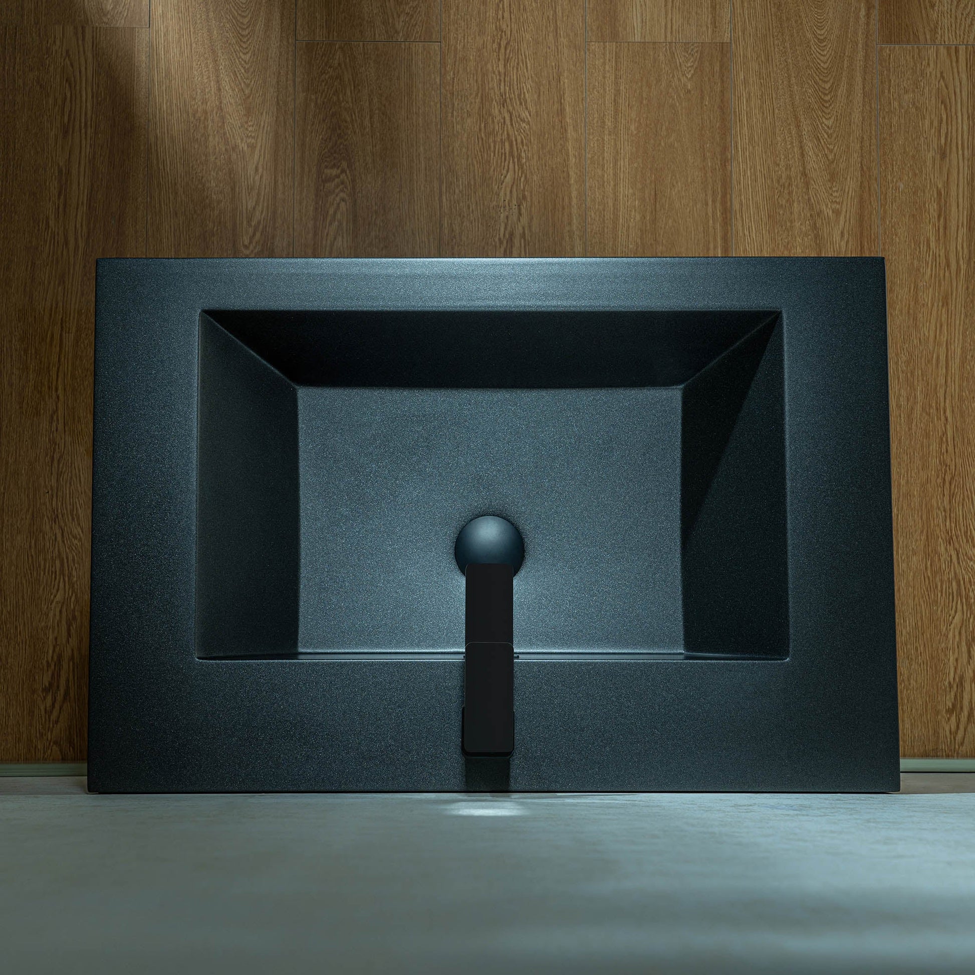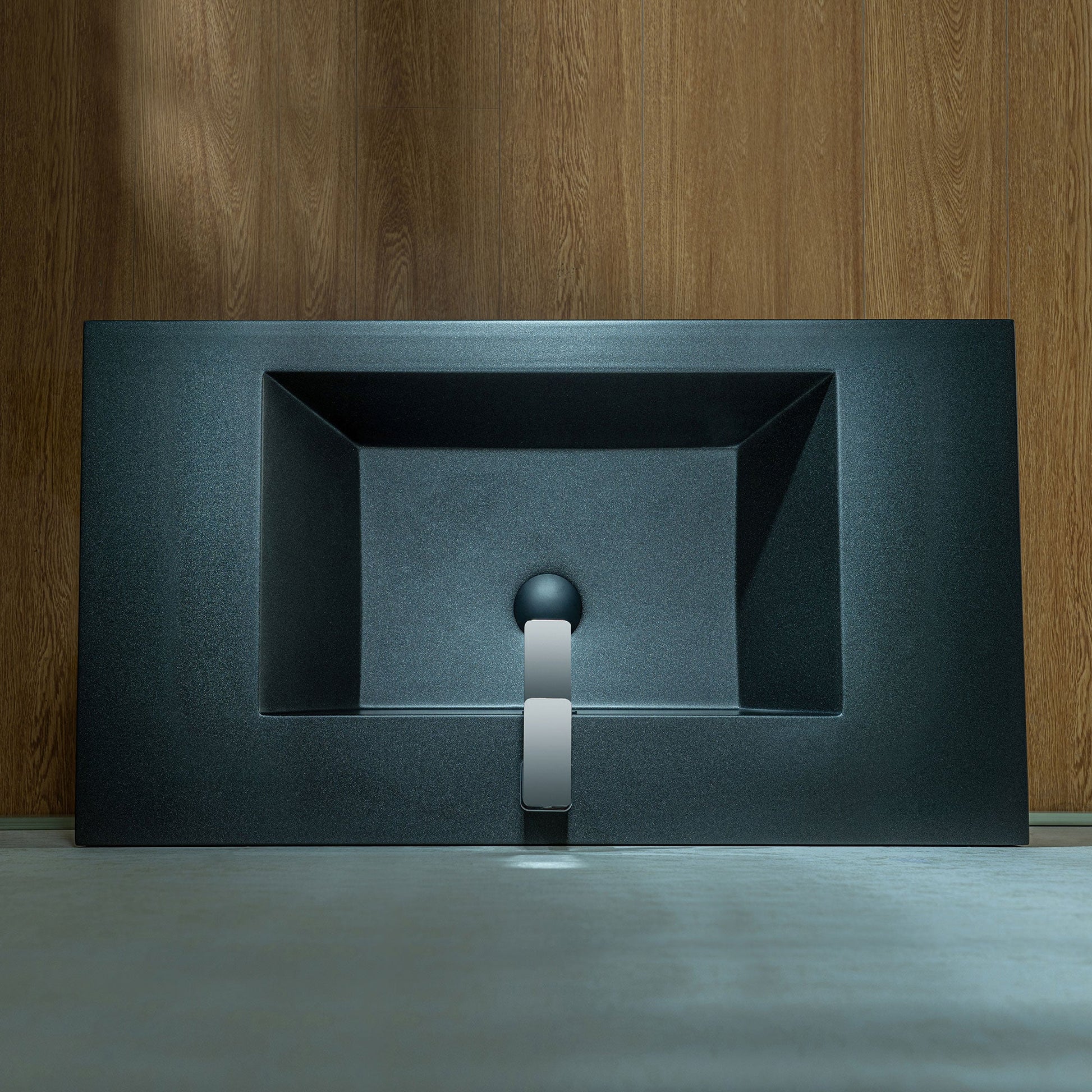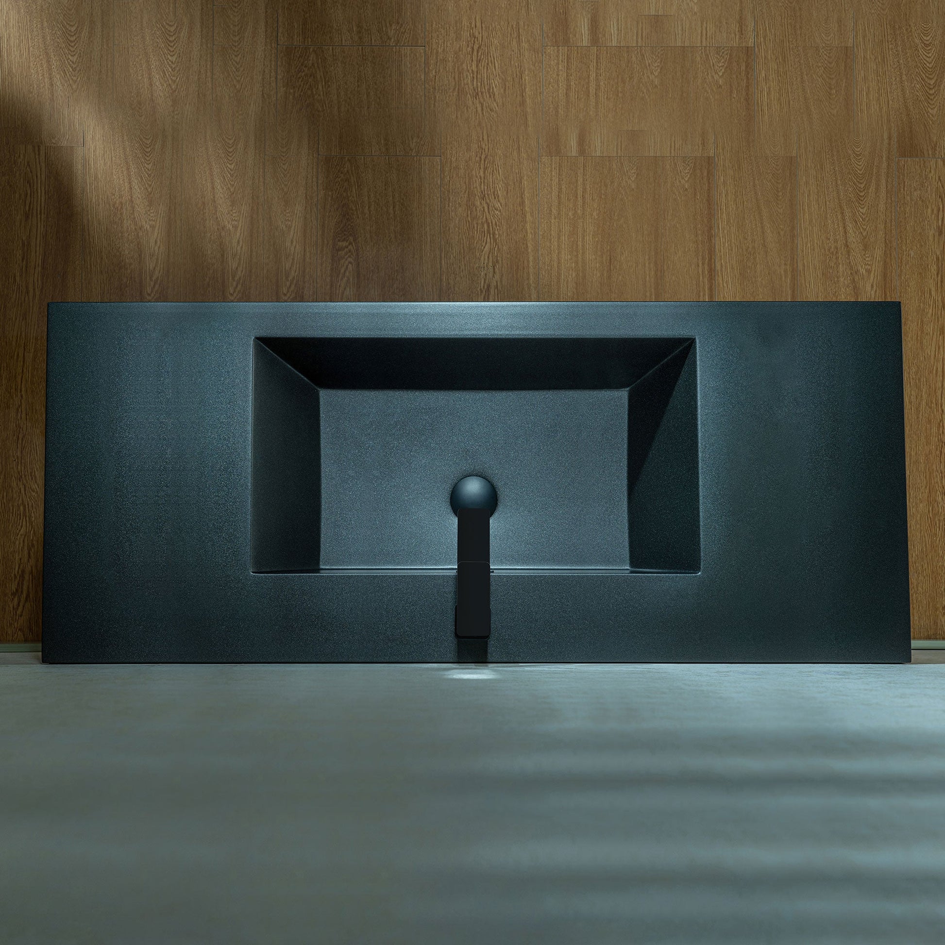 ? [TEXTURED FRONT PANEL]: The front of the cabinet features horizontal ridges, creating a textured visual effect that enhances its modern aesthetic. The black color of the panel complements the sink.