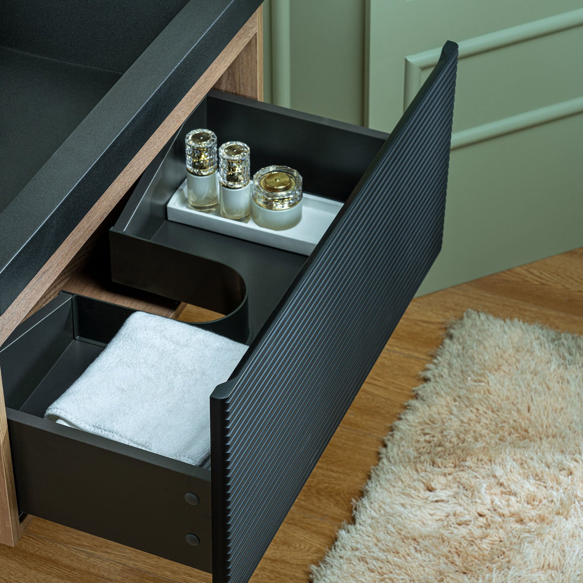 [QUIET & SLEEK DRAWER DESIGN]: Enjoy the convenience of the soft-closing drawer slides for a quiet, slam-free operation. Both drawers feature 45° beveled invisible handles, providing a sleek and ergonomic design that fits perfectly to your fingers.