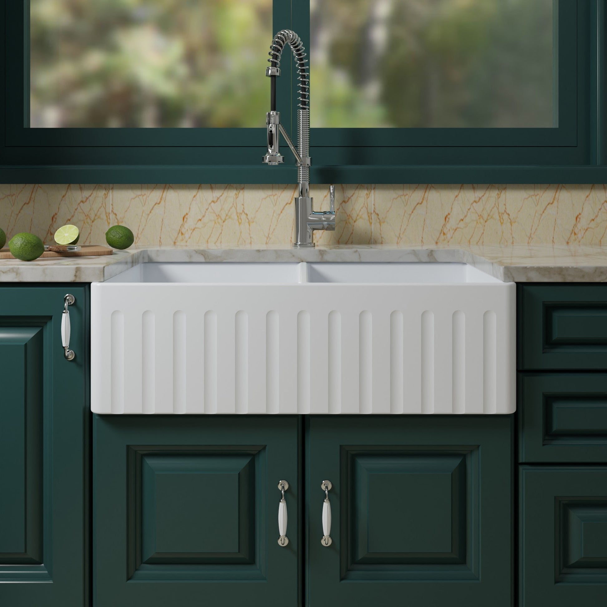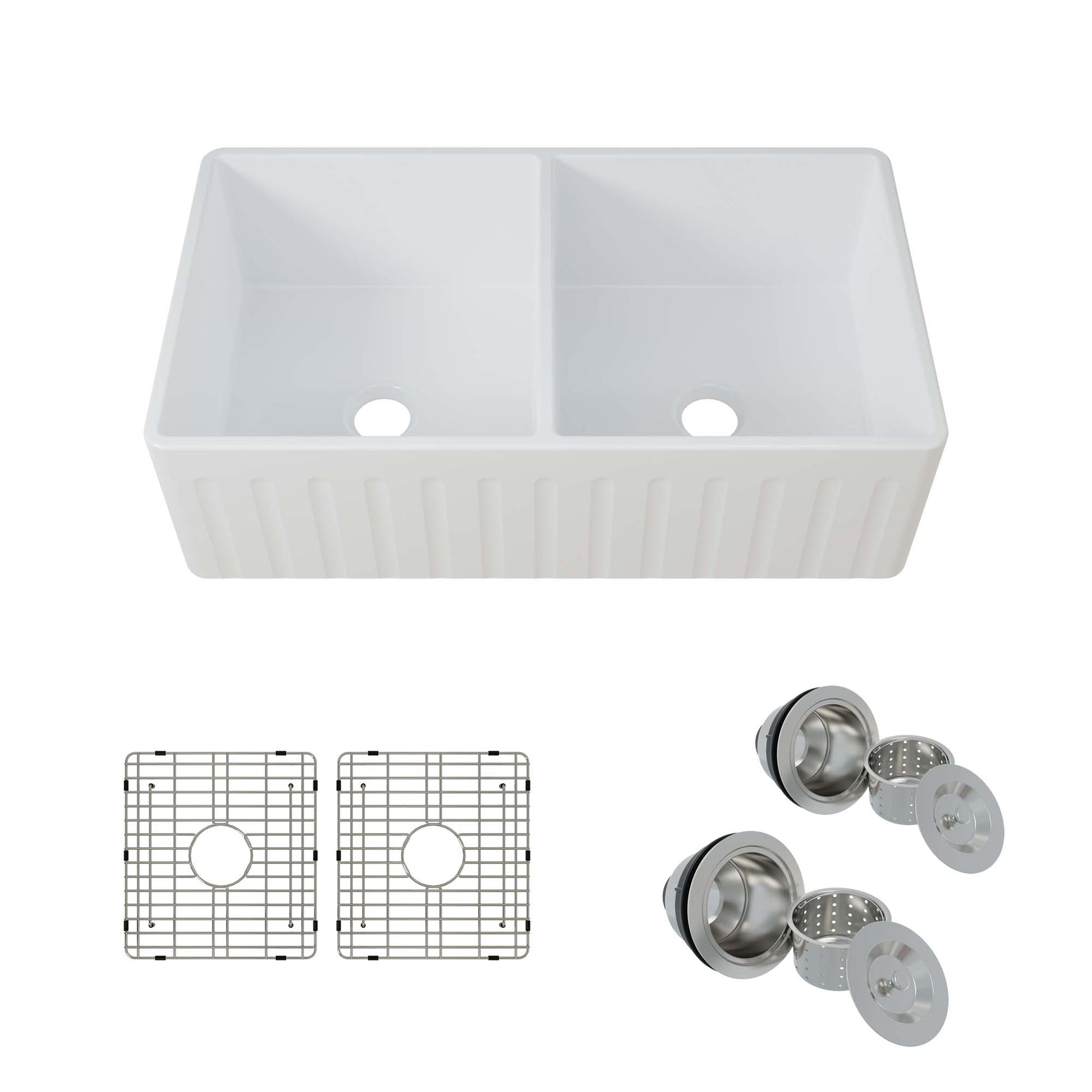 [Strong and Durable Design]: Handcrafted from Durable and fine fireclay construction, heat resistant, and guaranteed not to chip, crack, stain, fade and rust at all; comes with two US standard basket strainers in stainless steel finish and matching sink grid to protects sink bottom.