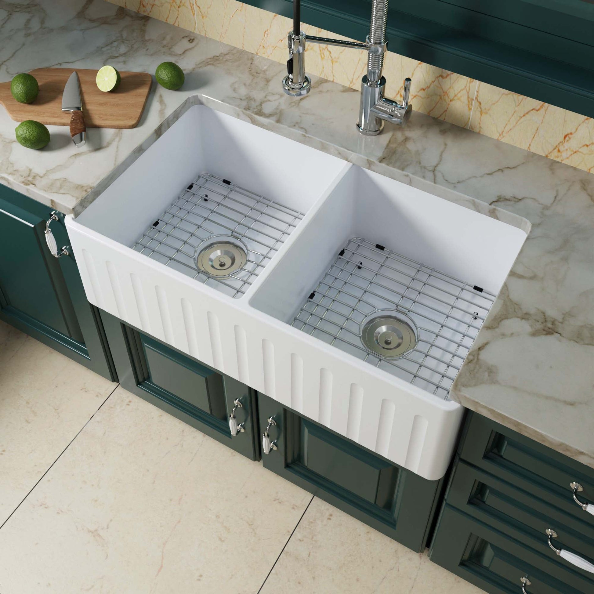WOODBRIDGE 33" X 18" White Fireclay Double Bowl Farmhouse Apron Front Kitchen Sink with Strainers and Sink Protector Grid