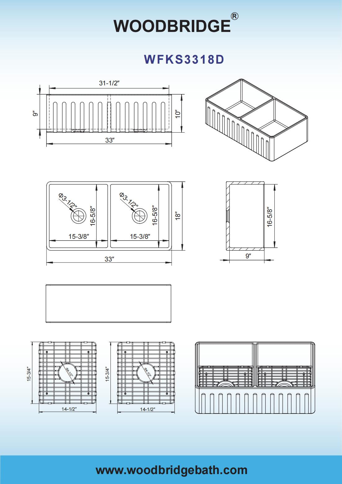 ? [Dimensions and Specification]: Outer Size (L) 33" x (W) 18" x (H) 10", Inner Size (L) 31" x (W) 16" x (D) 9", Bowl Size: (L)15" x (W)16" x (D)9" ; Minimum Cabinet Size: 33"; Drain Size: 3.5" Diameter, Installation: Farmhouse