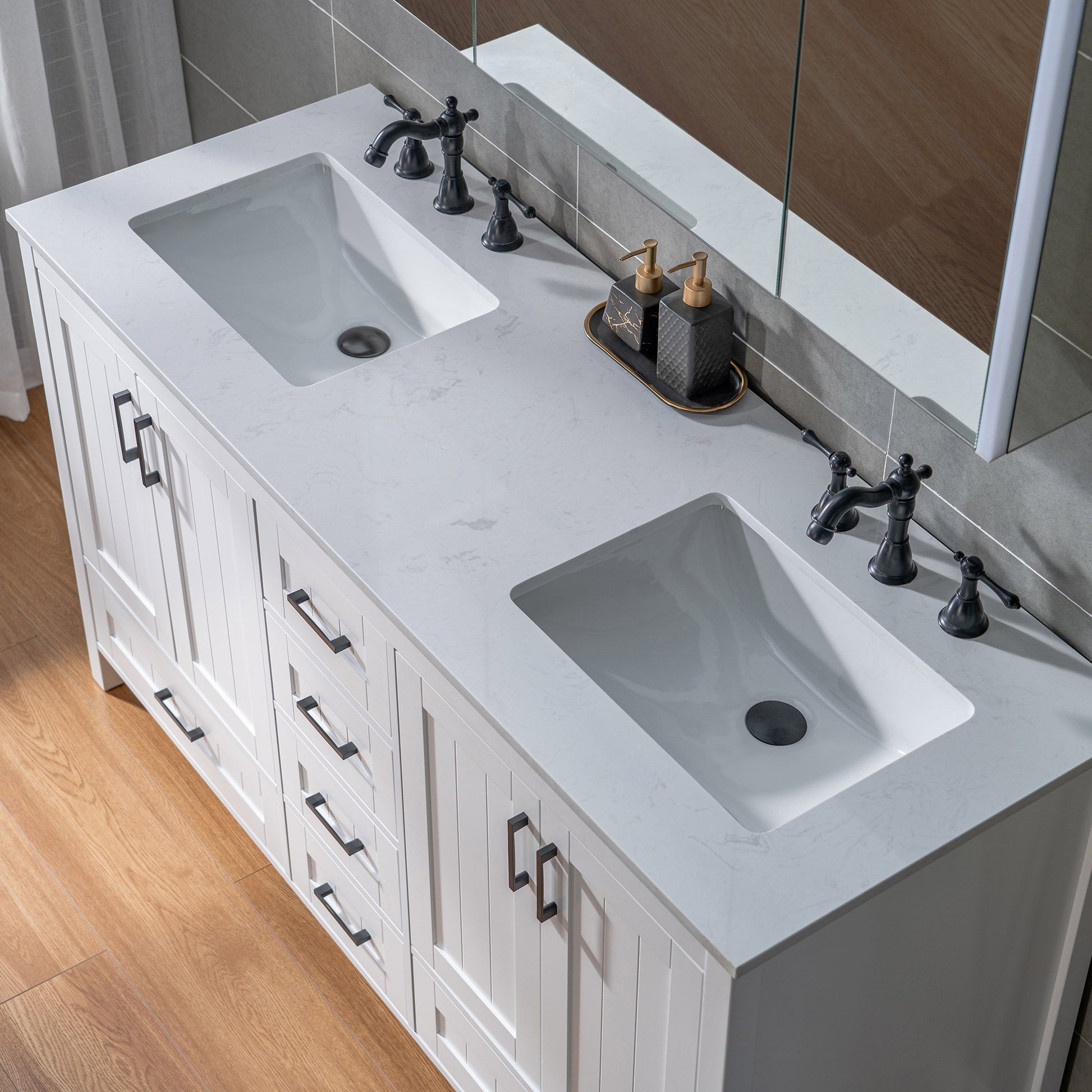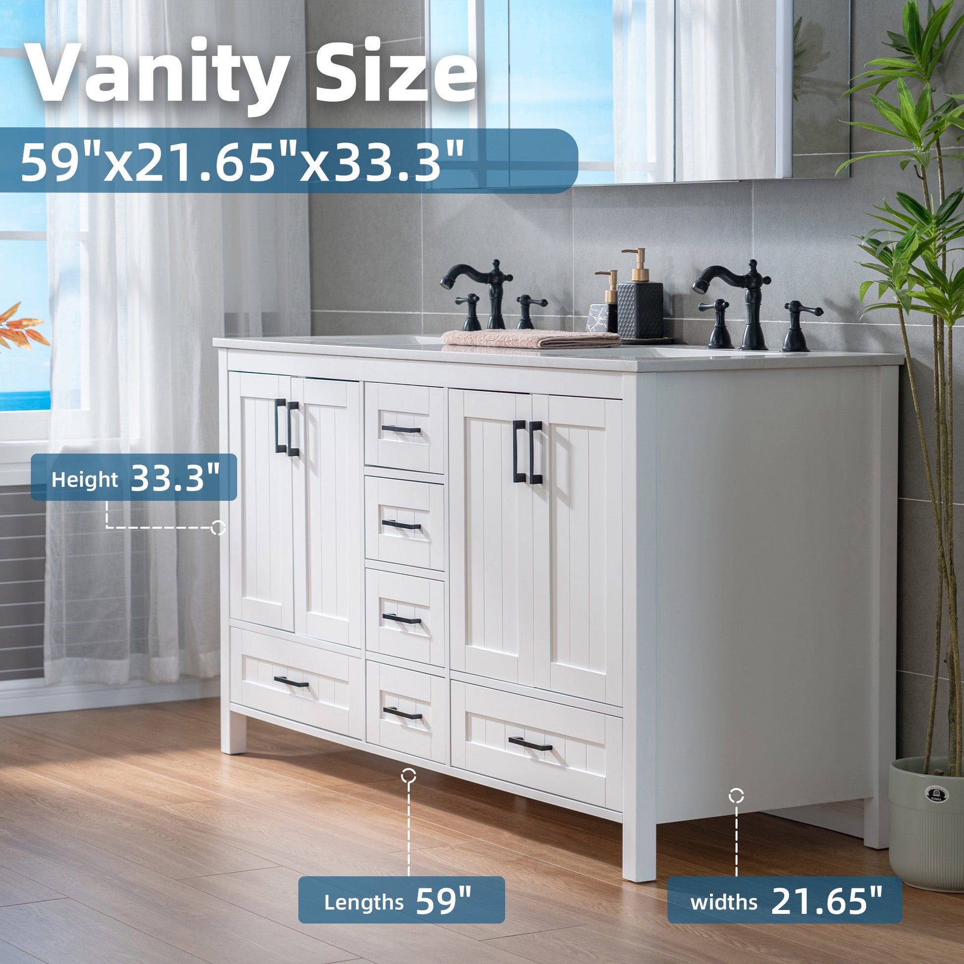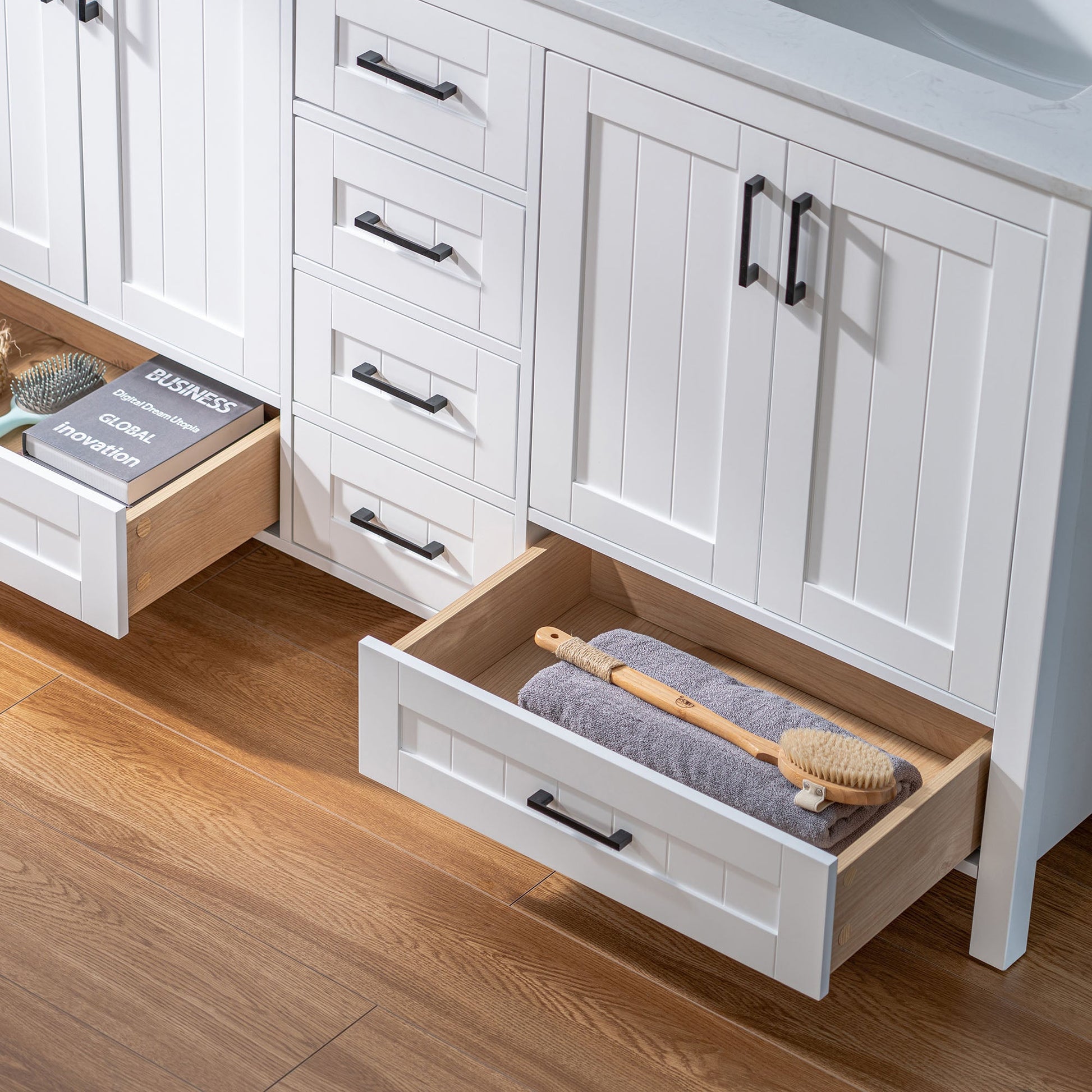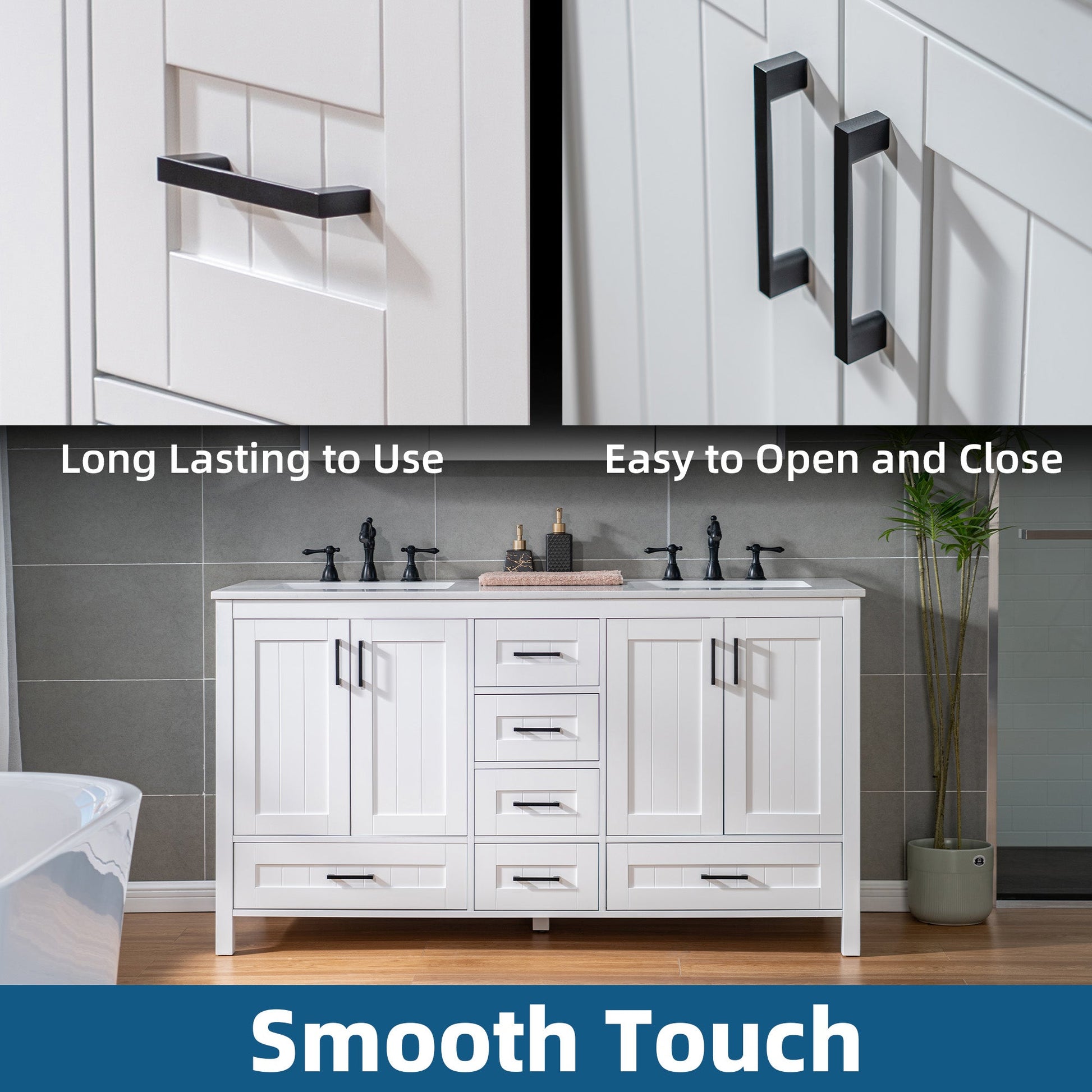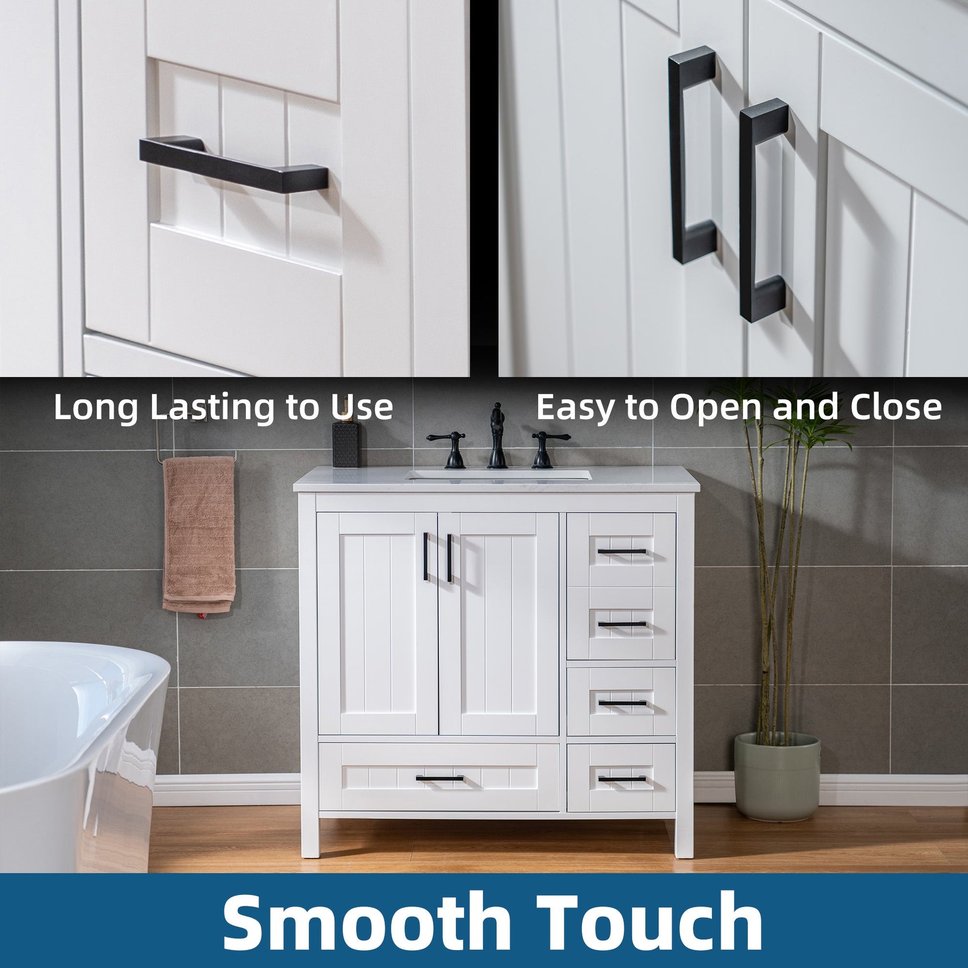 [Stylish Storage Solutions]: Provides ample storage with soft-close drawers and doors, helping to keep your bathroom clutter-free and organized.
