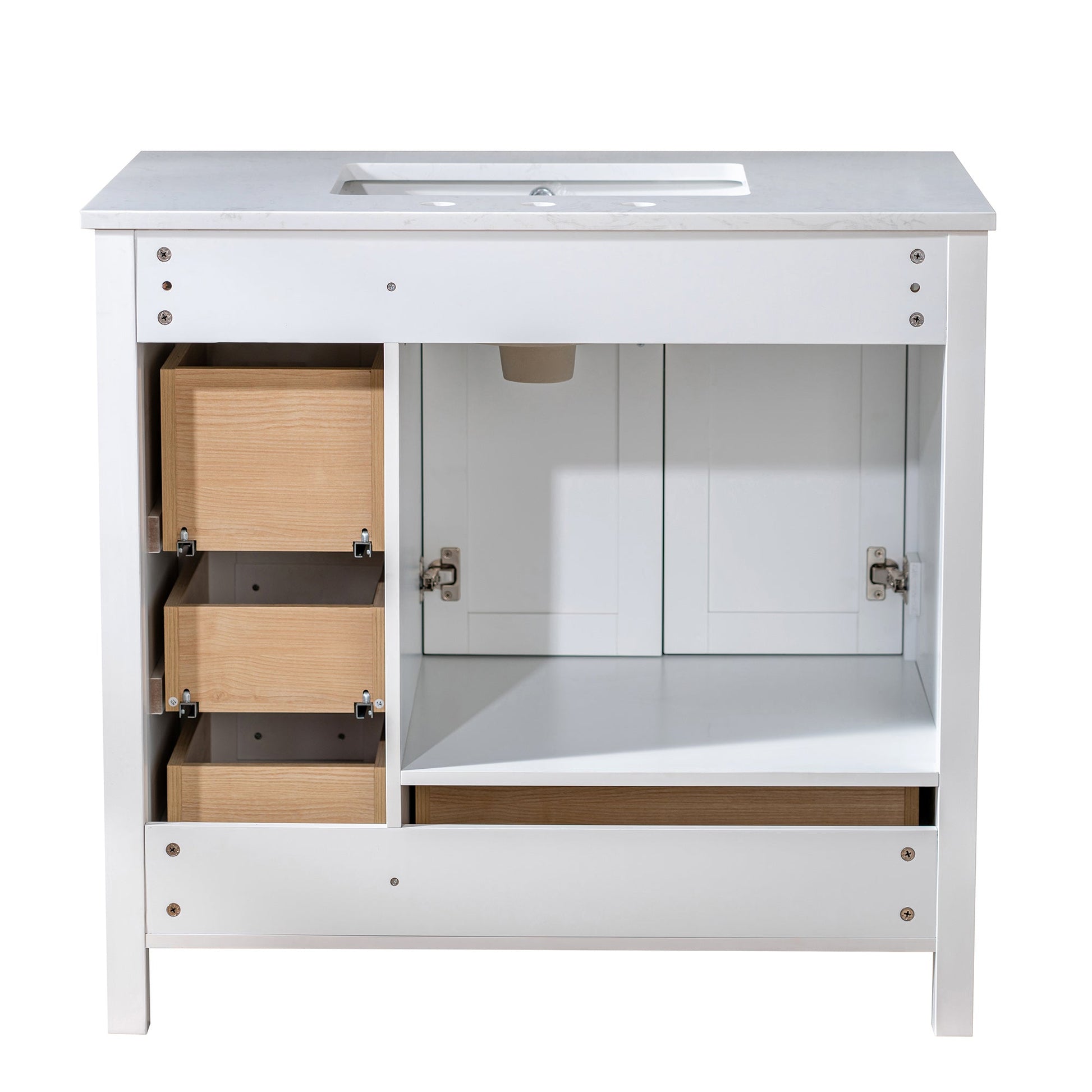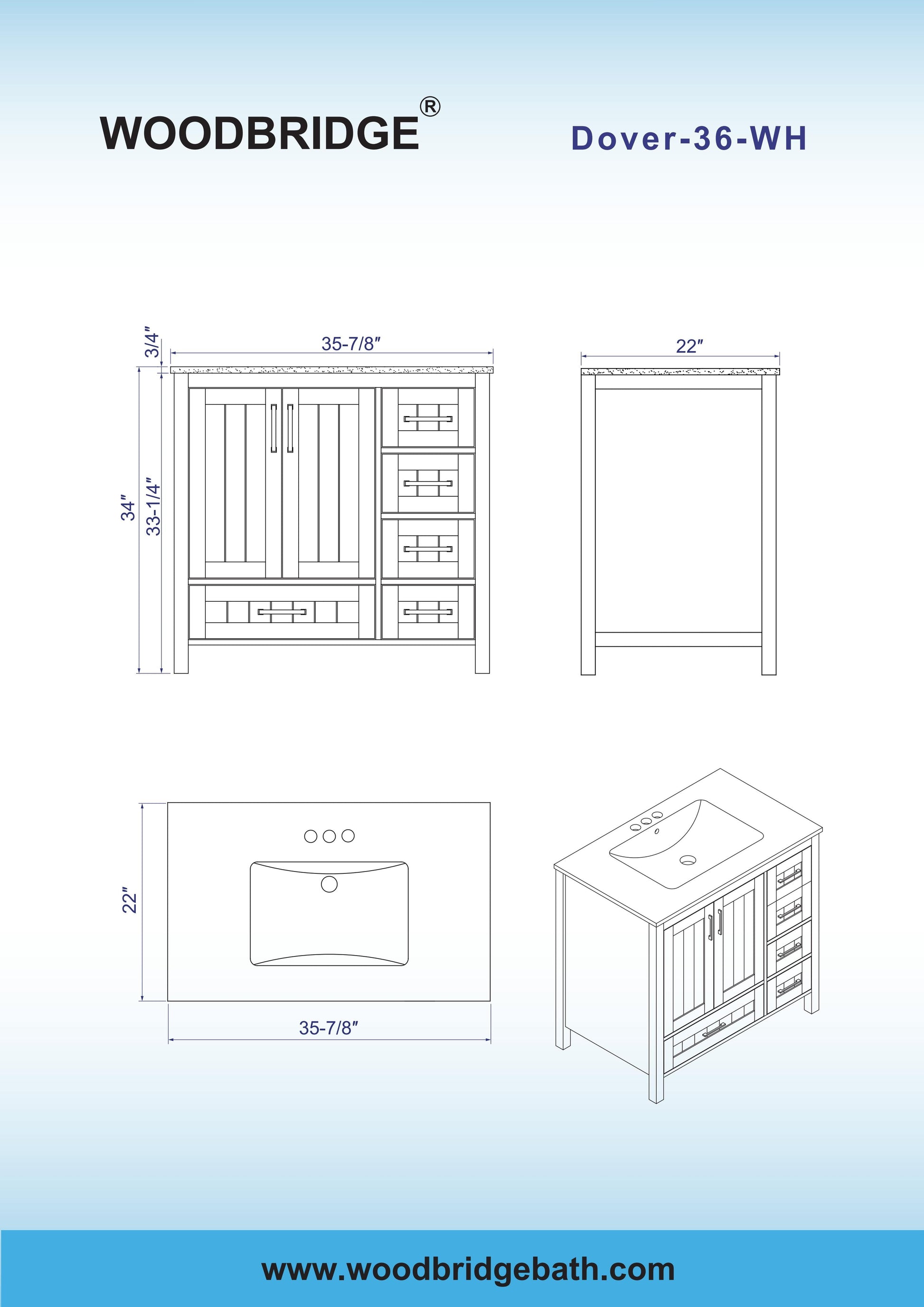 WOODBRIDGE 35-7/8" Floor Mounted Freestanding Single Basin Vanity Set with Rubberwood Cabinet and Stone Vanity Top with Pre-installed Undermount Rectangle Bathroom Sink, Pre-Drilled 3-hole for 8-inch Widespread Faucet, DOVER-36-WH