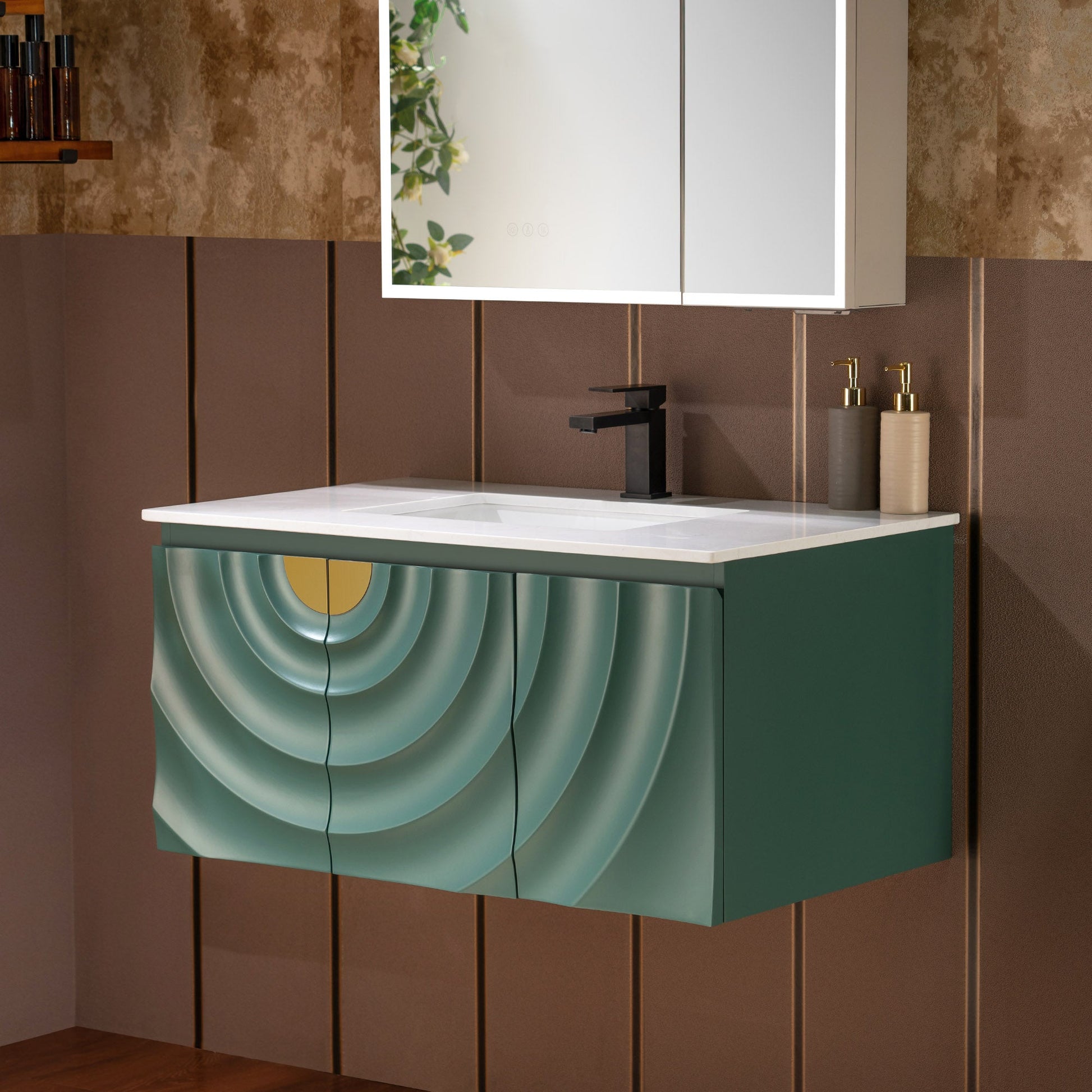 WOODBRIDGE 36"X22" Wall Mounted Floating Bathroom Vanity in Green with Single Ceramic Undermount Sink, White Engineered Stone Vanity Top– 3D Wave Pattern Doors, Space-Saving for Modern Living