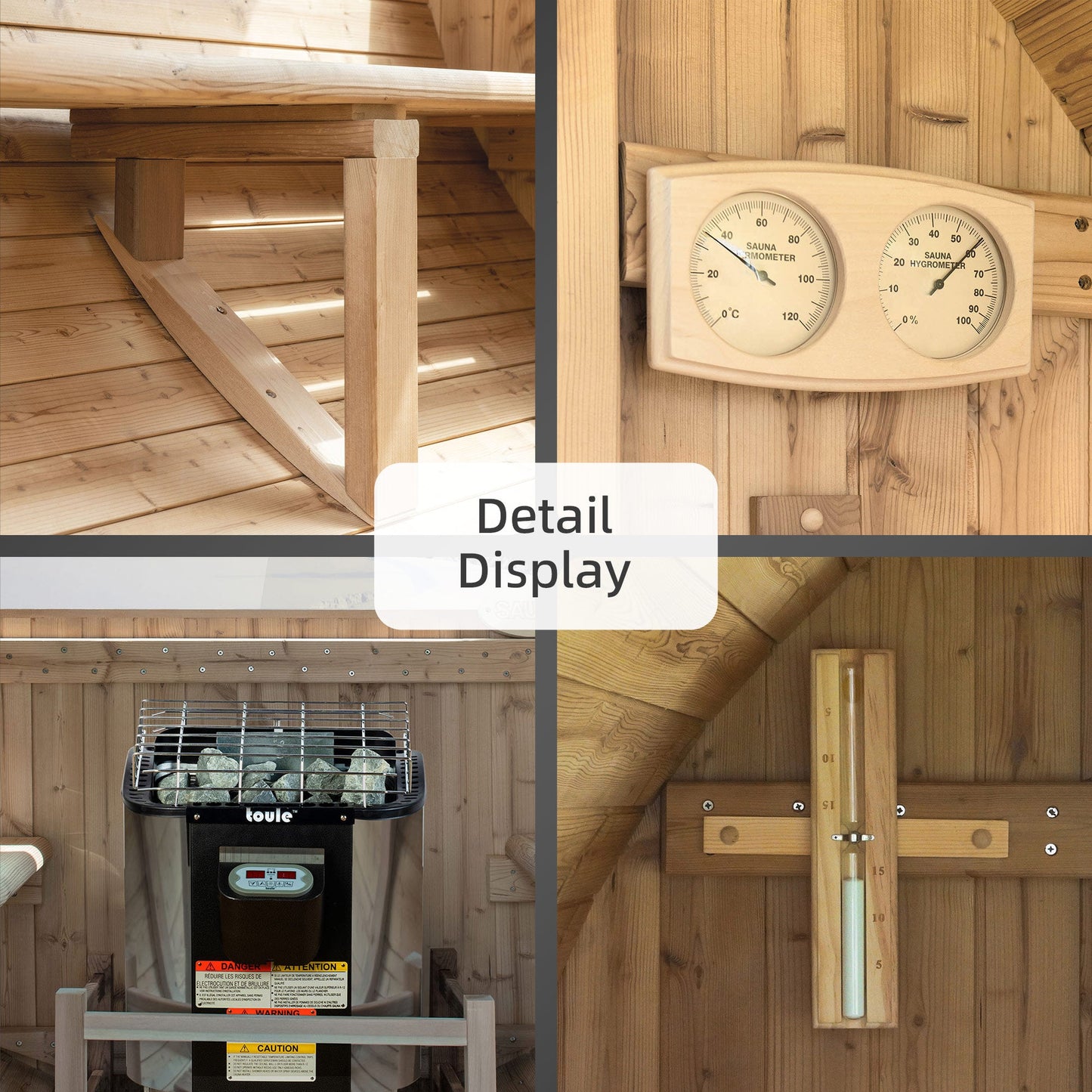 [RIGID SSTAINLESS STEEL BANDS]: 304 grade stainless steel barrel band reinforce the structure of the sauna room more stable and tighter, increase tightness of the room and preventing air out from sauna room.