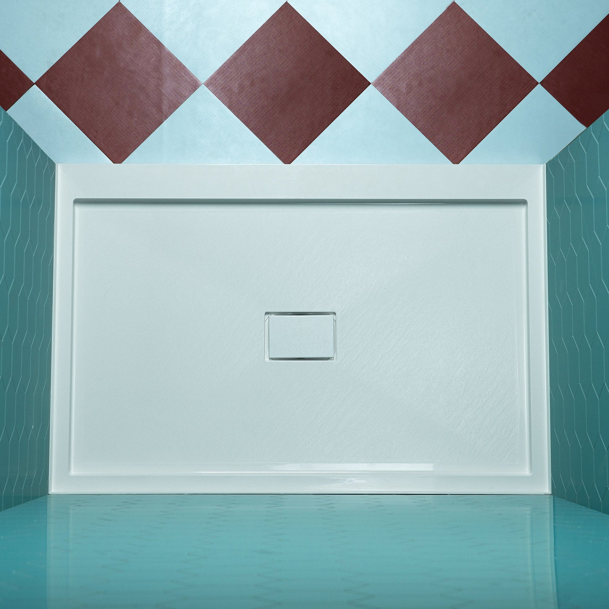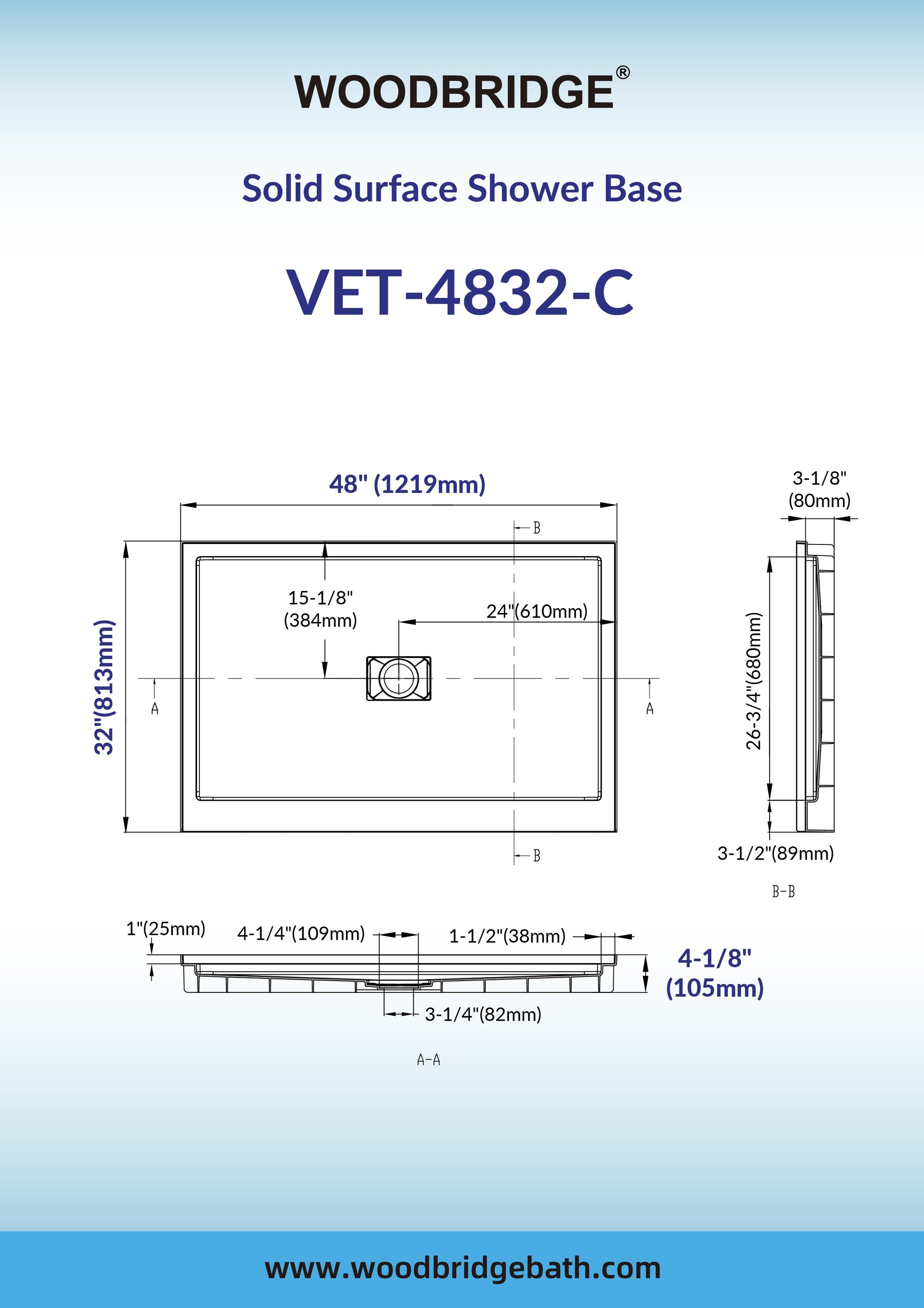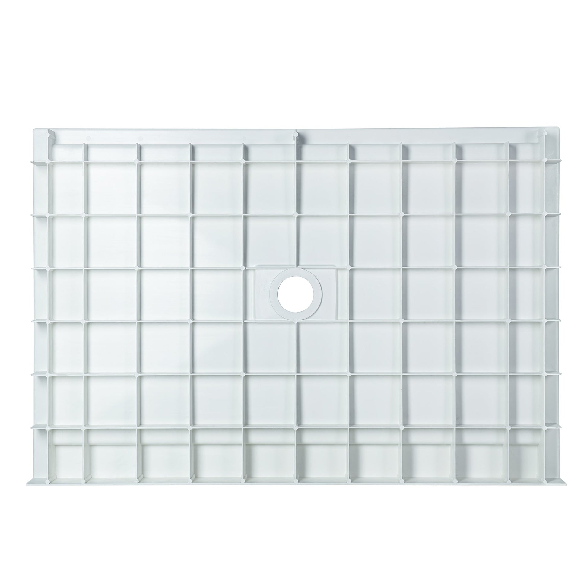 [DIMENSIONS]: Measures 48 in. L x 32 in. W x 4-1/8 in. H with Center drain placement