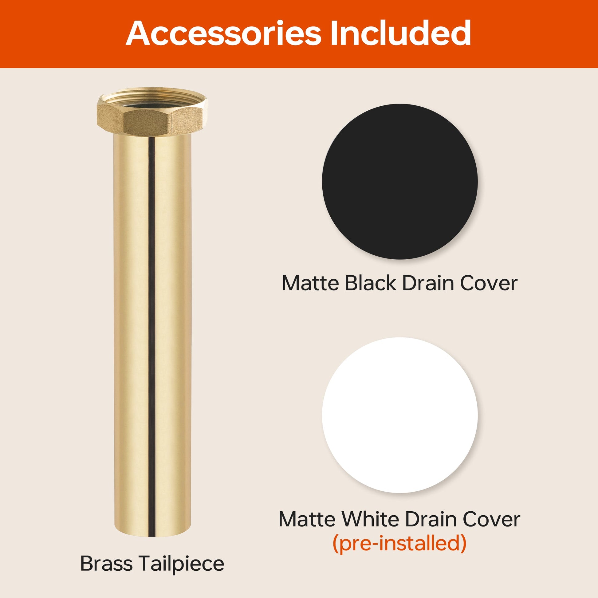 ? [PACKAGE INCLUDED]: An industrial-grade brass tailpiece. Two drain covers (pre-installed matte white and extra chrome) for existing home decor matching