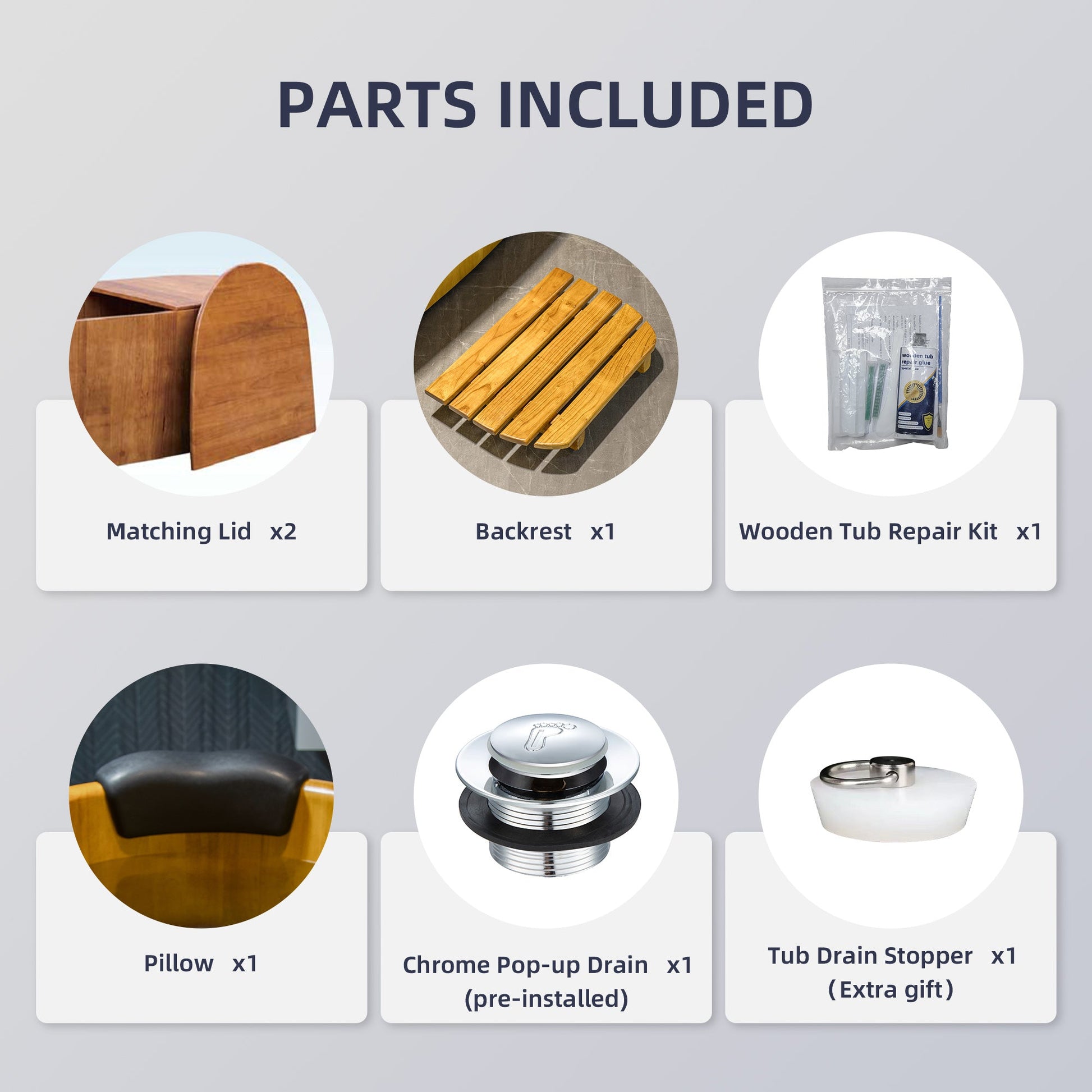 ? [PACKAGE INCLUDED]: A solid rubber wood bathtub, a matching seat, 2-piece design wood tub lid,a pillow and a solid brass pop-up drain in chrome finish and user guide and installation manual.