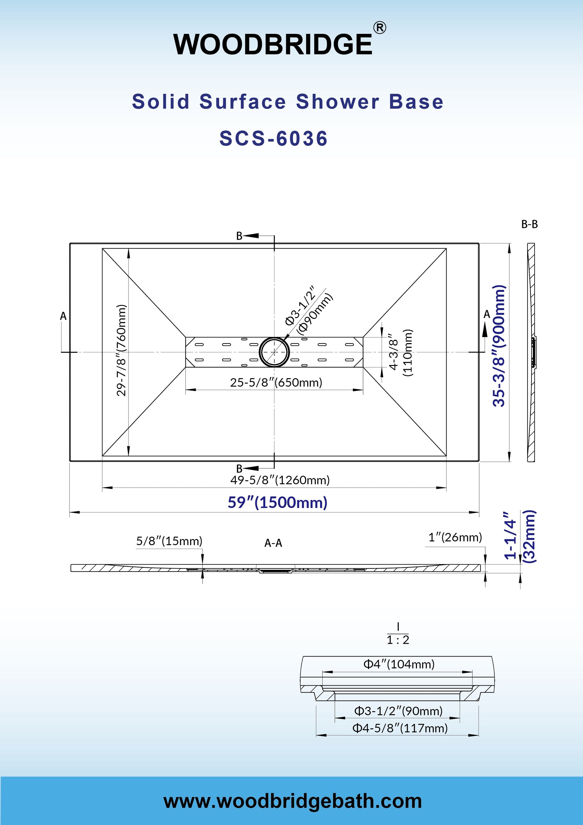 WOODBRIDGE 59 in L x 35.4 in W Zero Threshold End Drain Shower Base with Center Drain Placement, Matching Decorative Drain Plate and Tile Flange, Wheel Chair Access, Low Profile