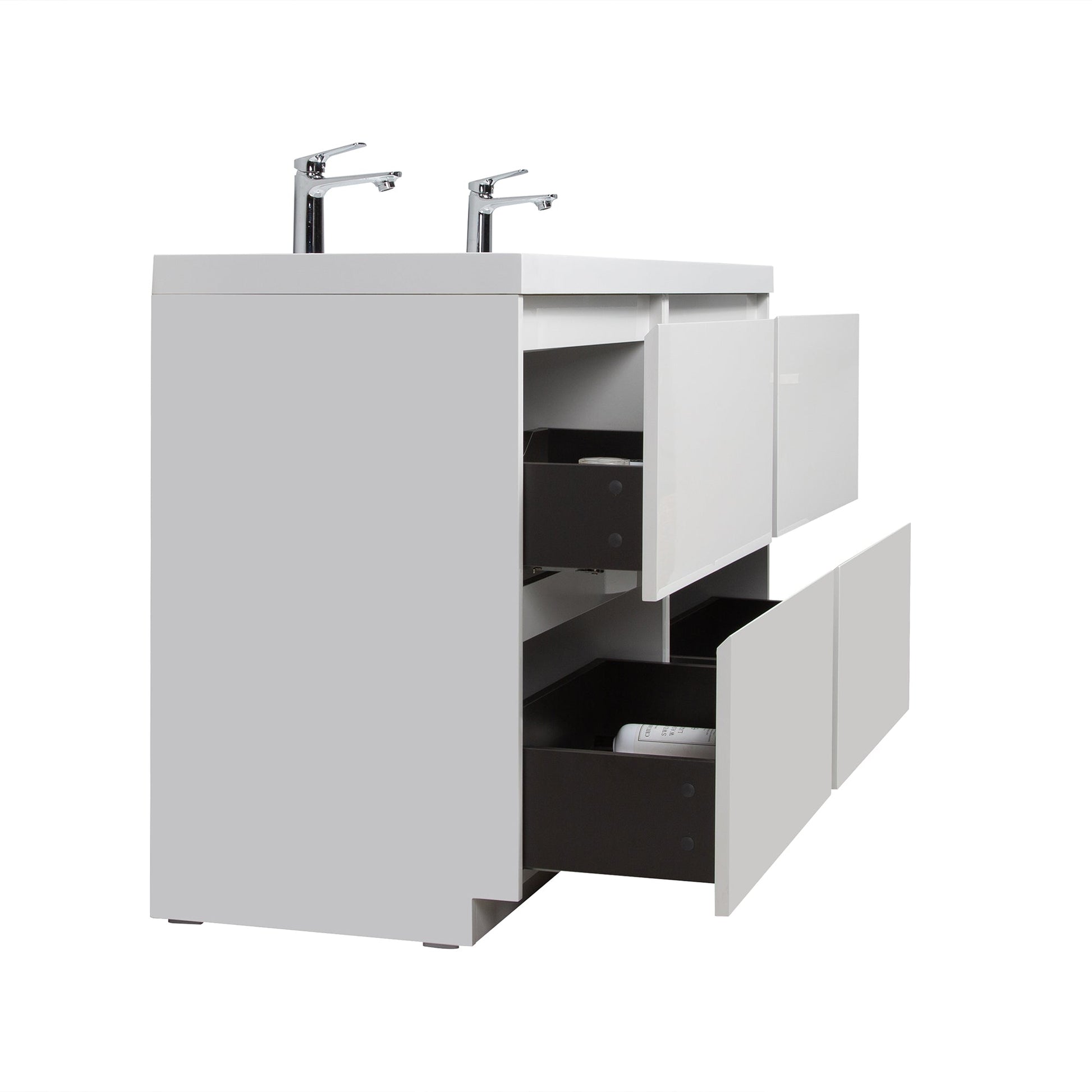 [RESIN INTEGRATED VANITY TOP & SINK]: The vanity top has a white glossy surface covered by DSM brand gel coat that reaches food-safe grade. The integrated sink is easy to clean, has no dead angle, anti-yellowing, and is not easy to scratch.