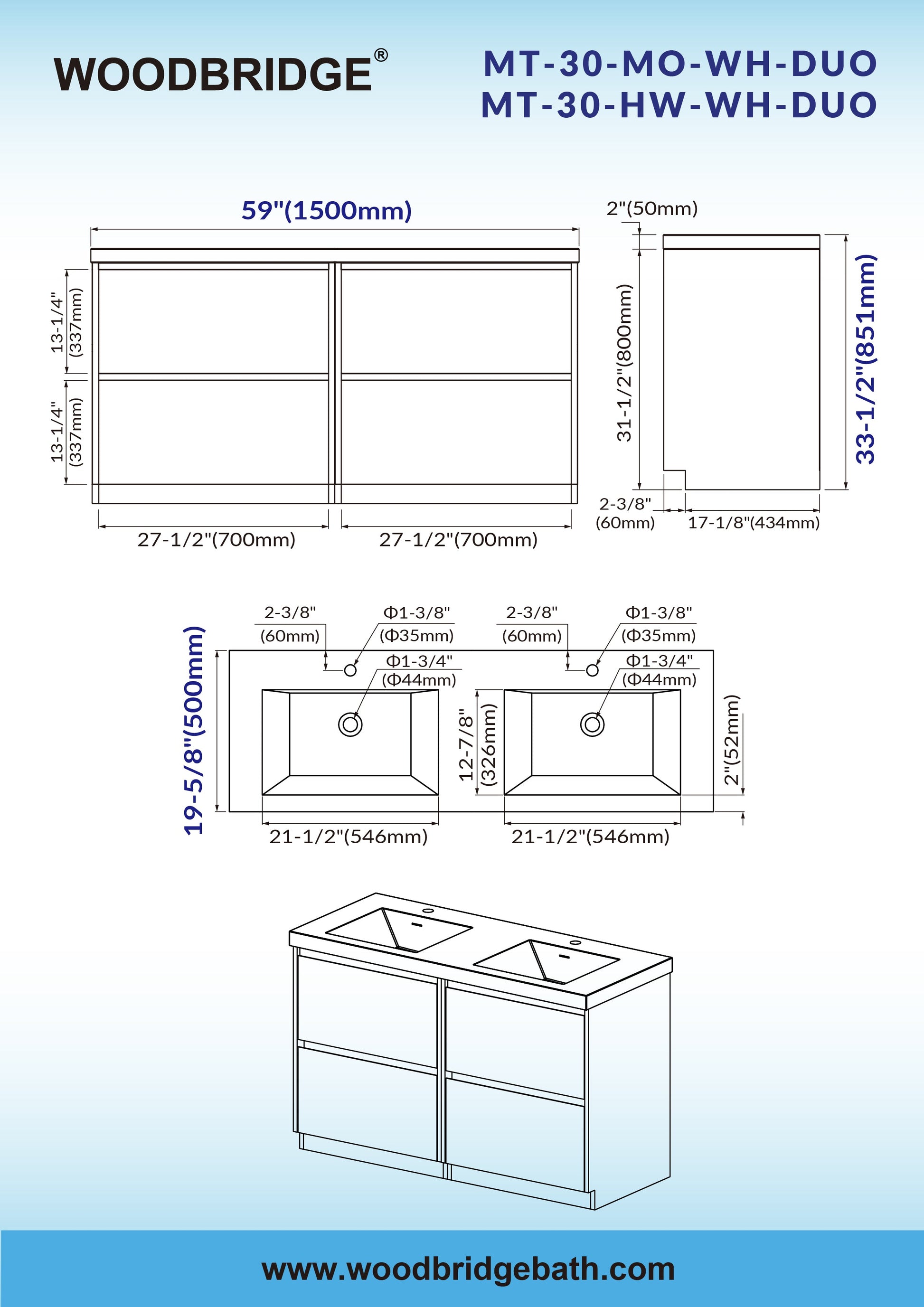 [MODULAR DESIGN]: Combine two vanities into a 59-inch unit (59 in. W x 19-5/8 in. D x 33-1/2 in. H), ideal for double sink tops.