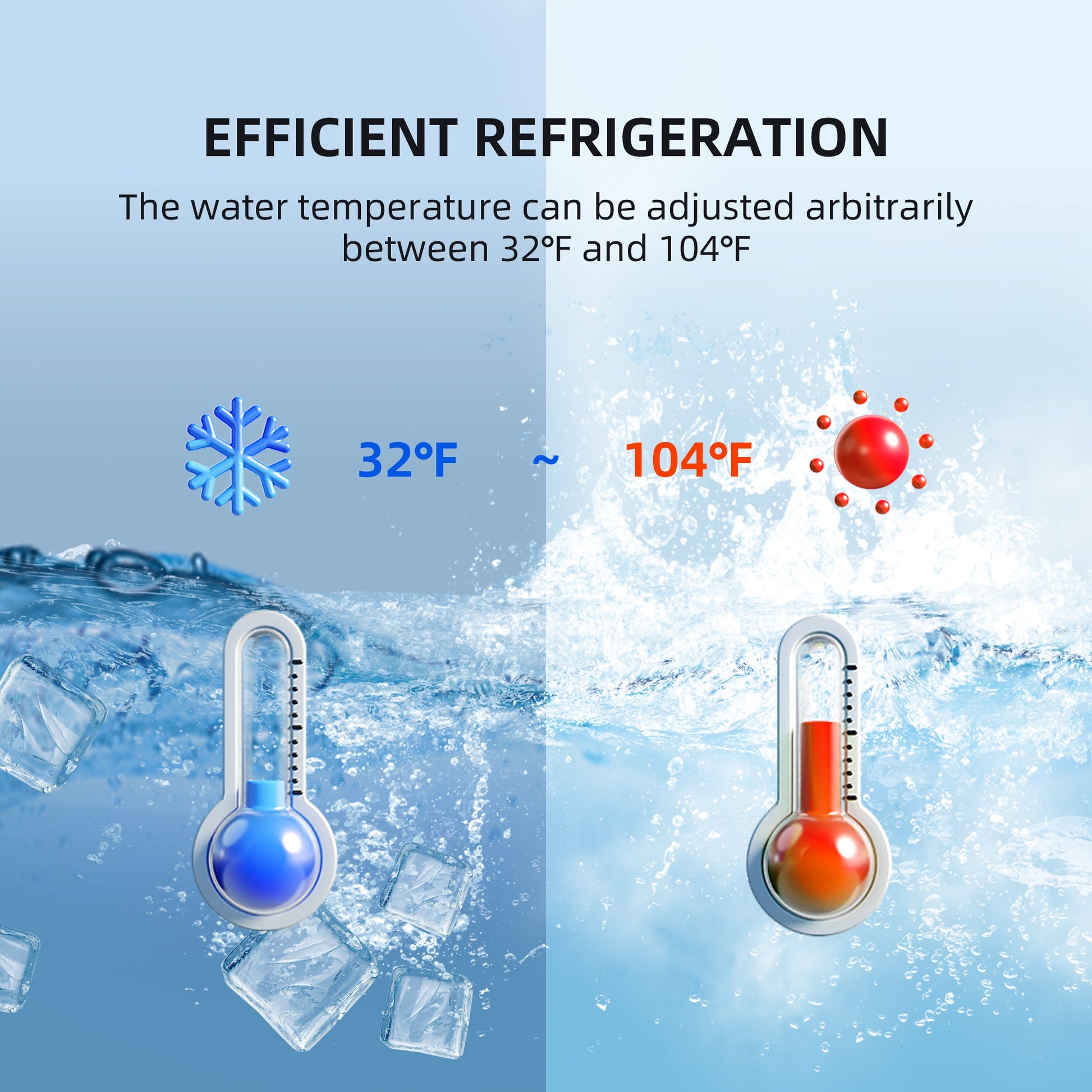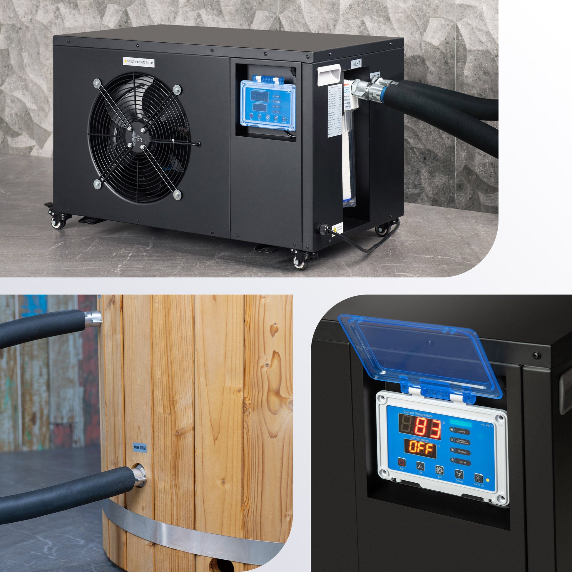 [INTEGRATED CHILLER SYSTEM]: Ultra-Efficient, Integrated Chiller with cooling and heating in one, keeps water temperatures between 40 – 104 ° F and chill down 7 - 10 ° F water temperature per hour. *value can vary depending on starting water temperature , outside temperature and ambient heat.