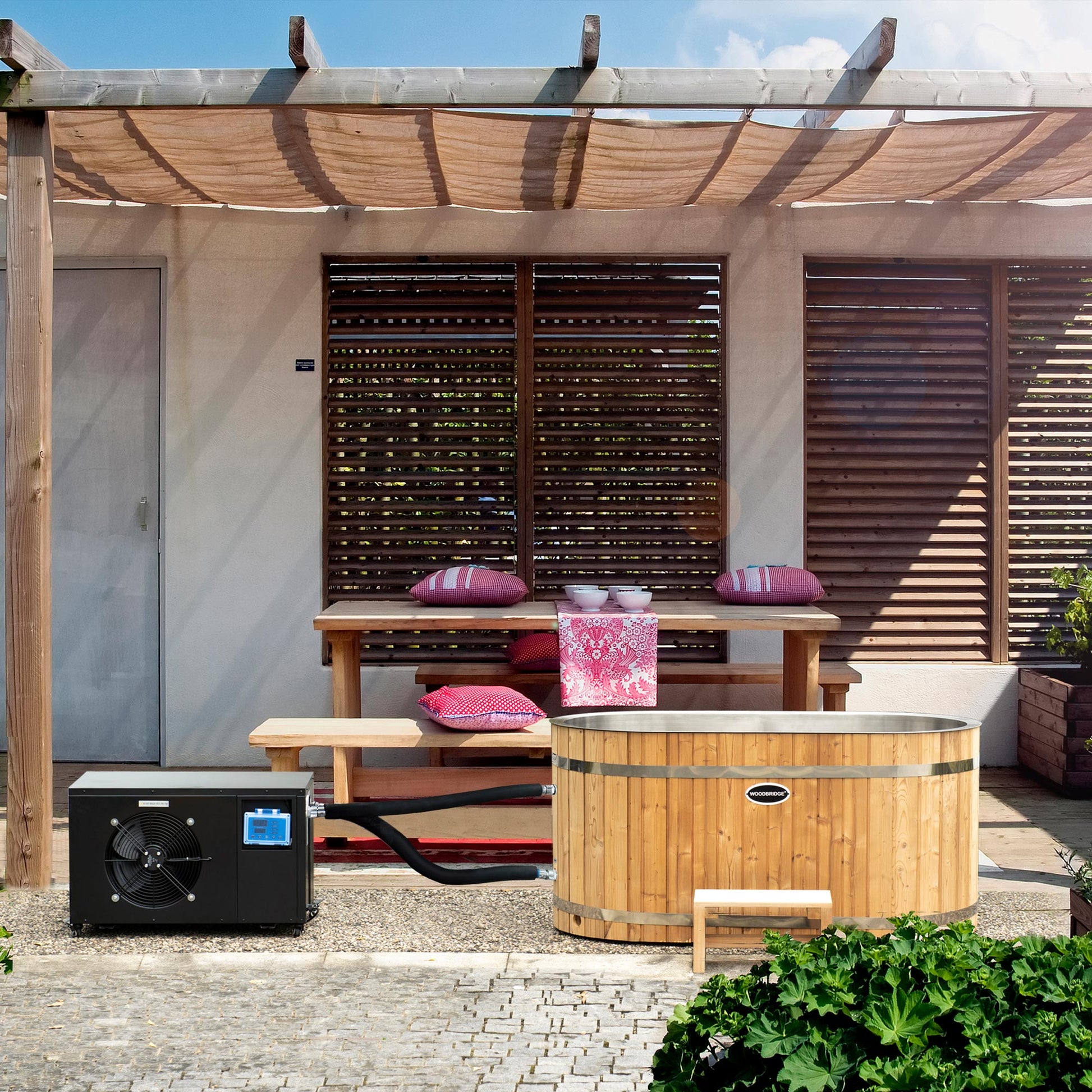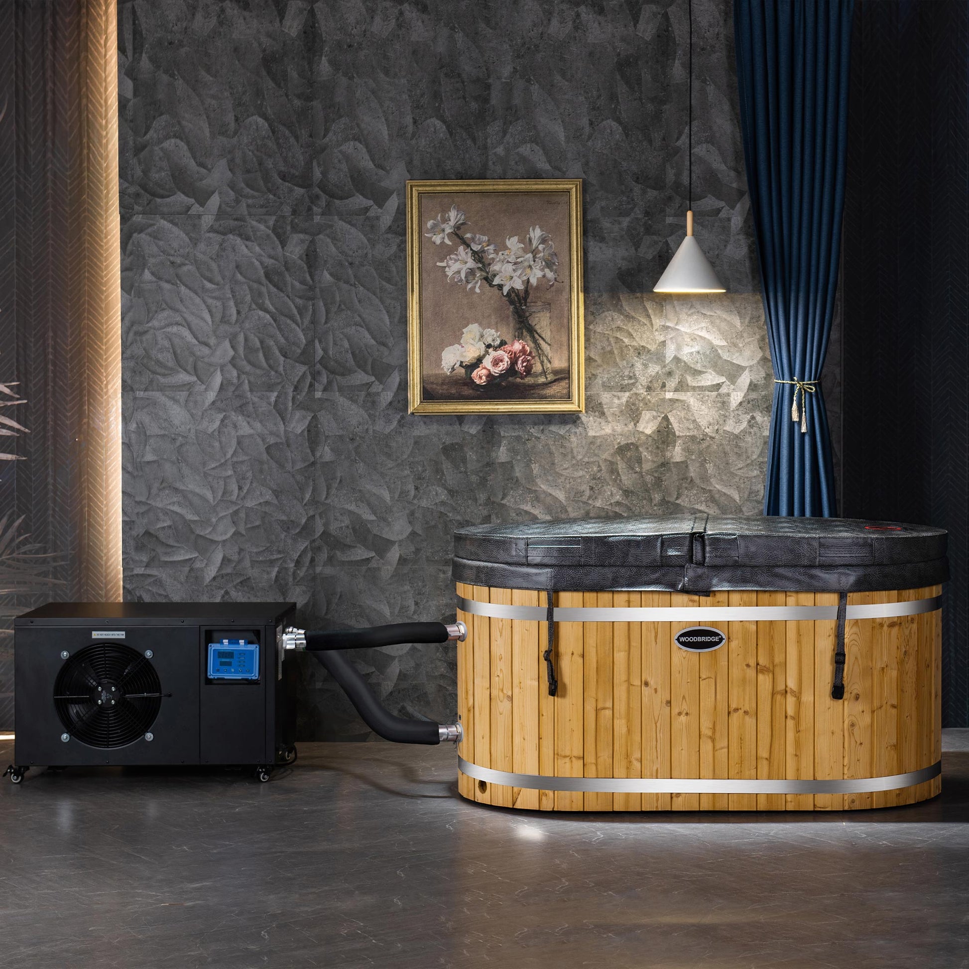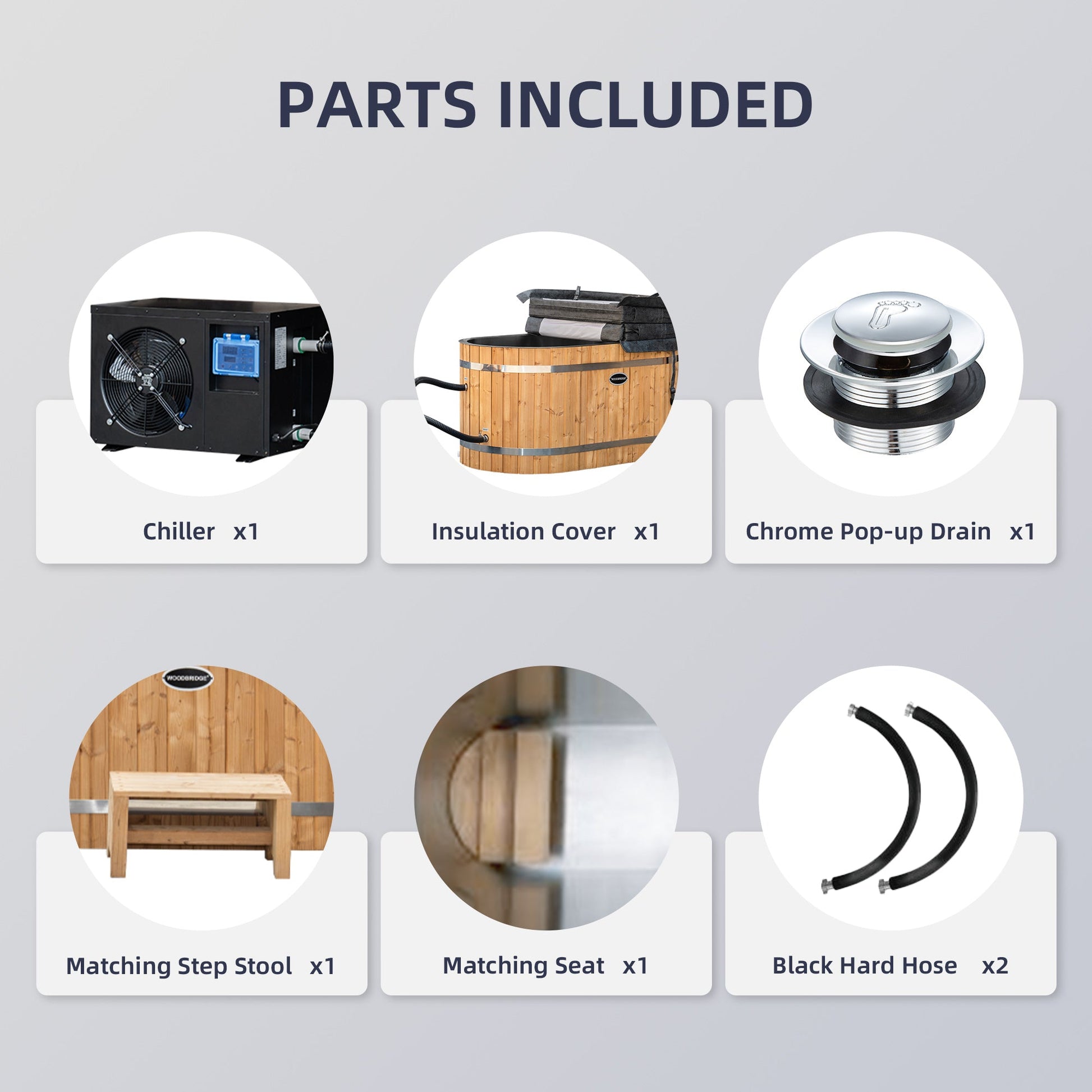? [PACKAGE INCLUDED]: A luxury ice bathtub with stainless steel liner, 1HP Chiller system with cooling and heating function, matching wood stool, matching wood seat, Insulated tub lids, Chrome pop-up drain and connecting hoses.