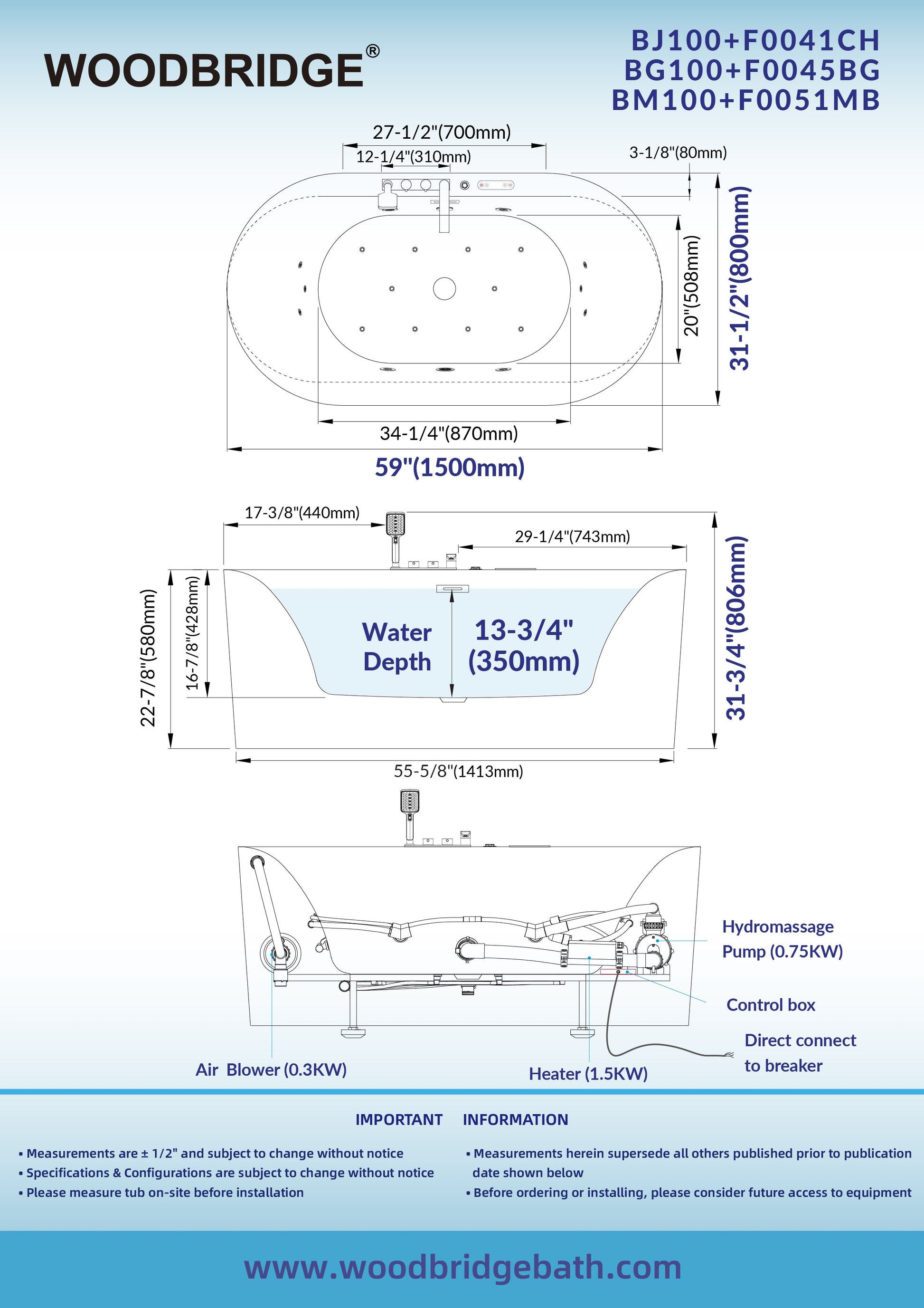 [DIMENSIONS AND SPECIFICATIONS]: Exterior Dimension: 59" L x 31-1/2" W x 22-7/8" H; Seating Dimension: 34-1/4" L x 20" W; Water Depth to Overflow: 13-3/4" D; Capacity: 41 Gallons; Power Requirements: 1 Dedicated 120V 30AMP Breakers