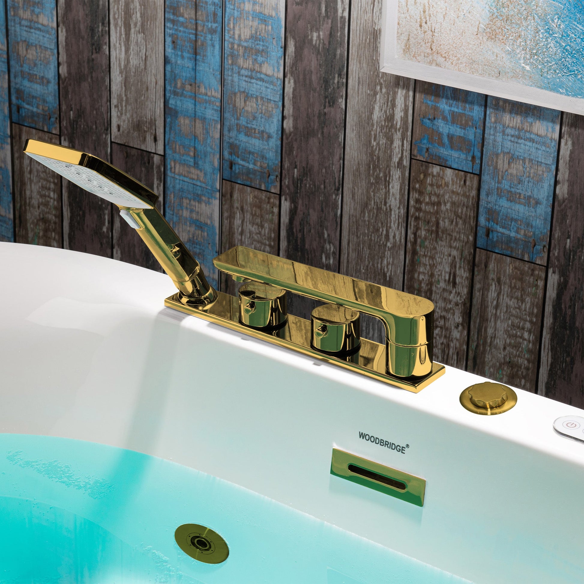 [BRUSHED GOLD JETS]: Luxurious brushed gold sanitary full-draining jets, paired with an underwater chromotherapy light, elegantly designed to enhance the bathing experience with a spacious and deep bathing well.