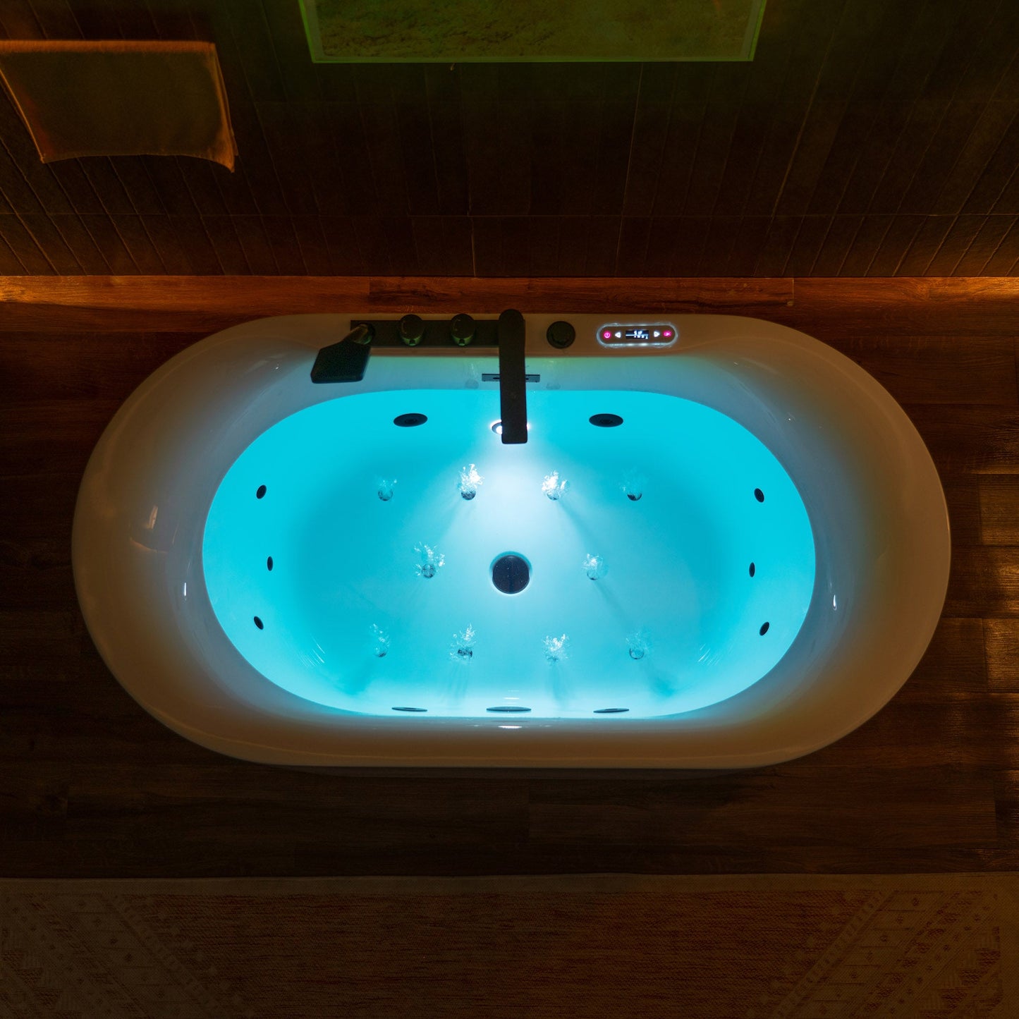 [MATTE BLACK JETS]: Matte Black sanitary full-draining jets, underwater chronotherapy light, Spaciously designed to provide maximum bathing space with a wide and deep bathing well