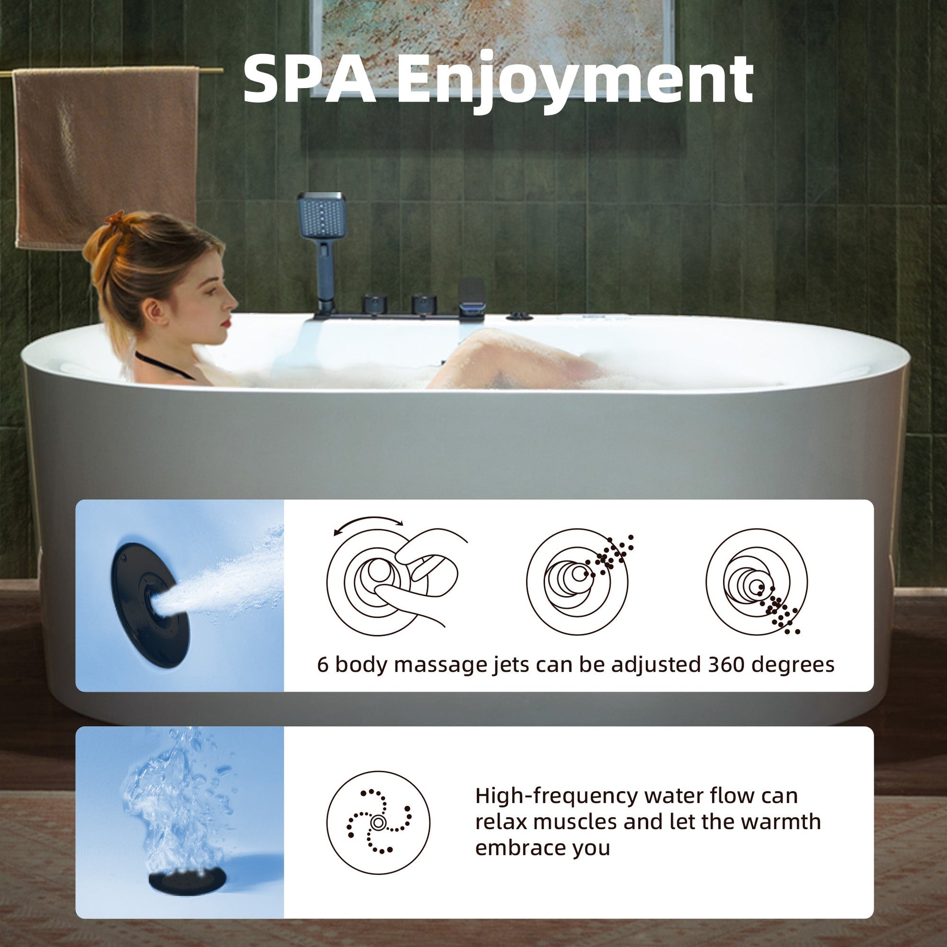 [JETS QUANTITY]: 6 adjustable body massage jets and 10 whirlpool bubble bath jets for maximum bather comfort, The perfect mix of air and water delivers a powerful, yet comfortable hydro massage.