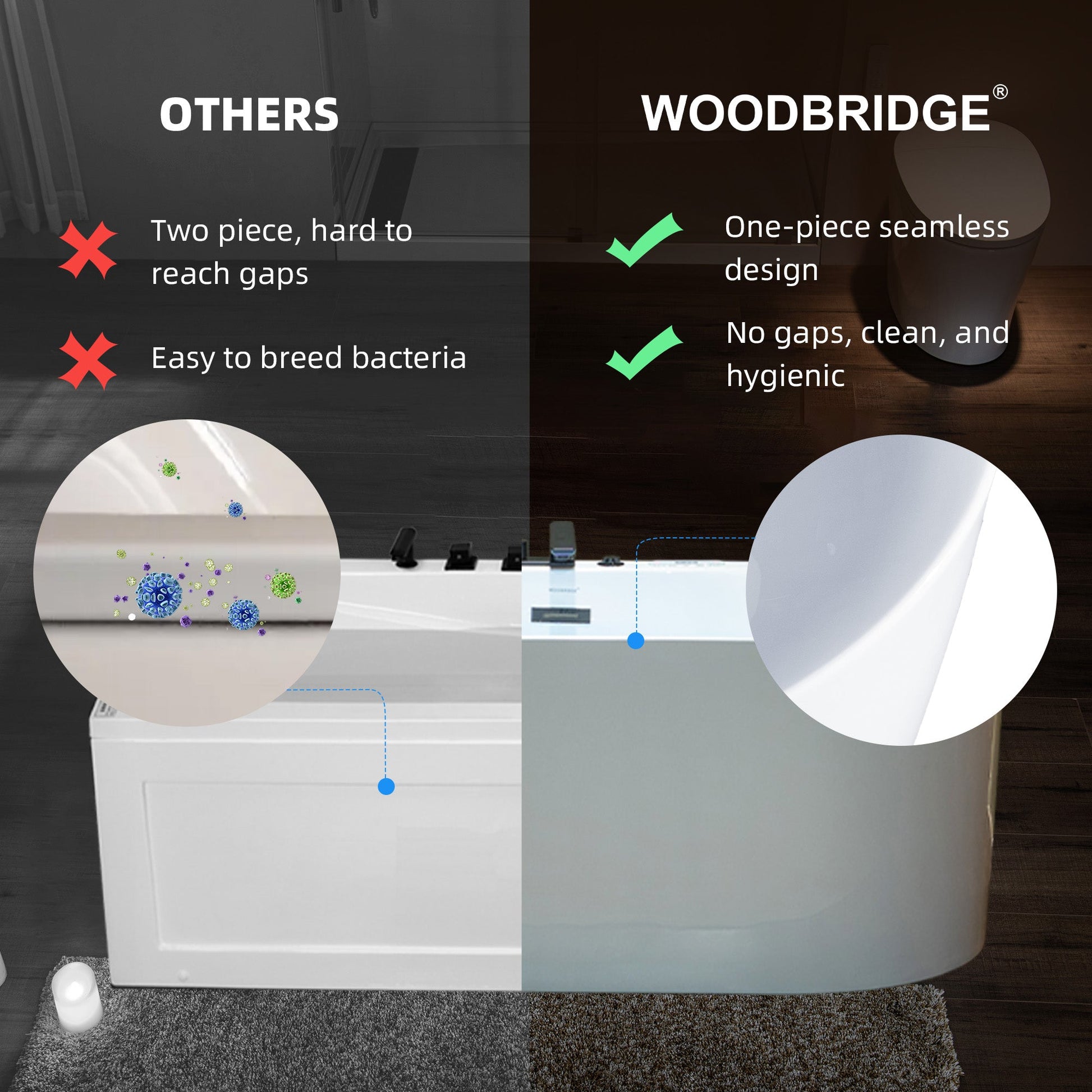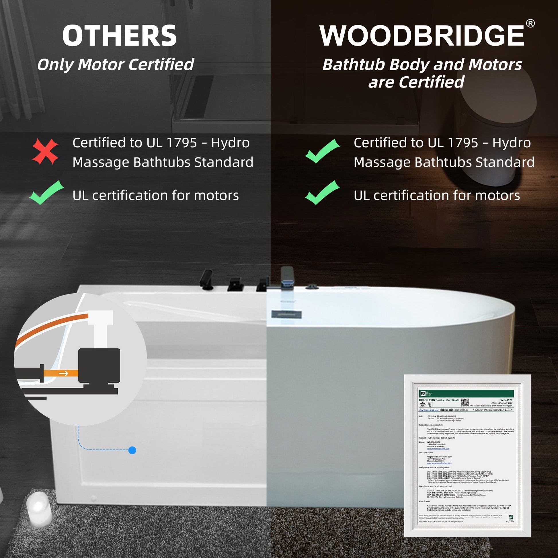 [CERTIFICATION & WARRANTY]: WOODBRIDGE hydromassage bathtub is UL1795 certified and includes a 1-year limited warranty against defects in materials and workmanship. For support, email our U.S. team at help@woodbridgebath.com.