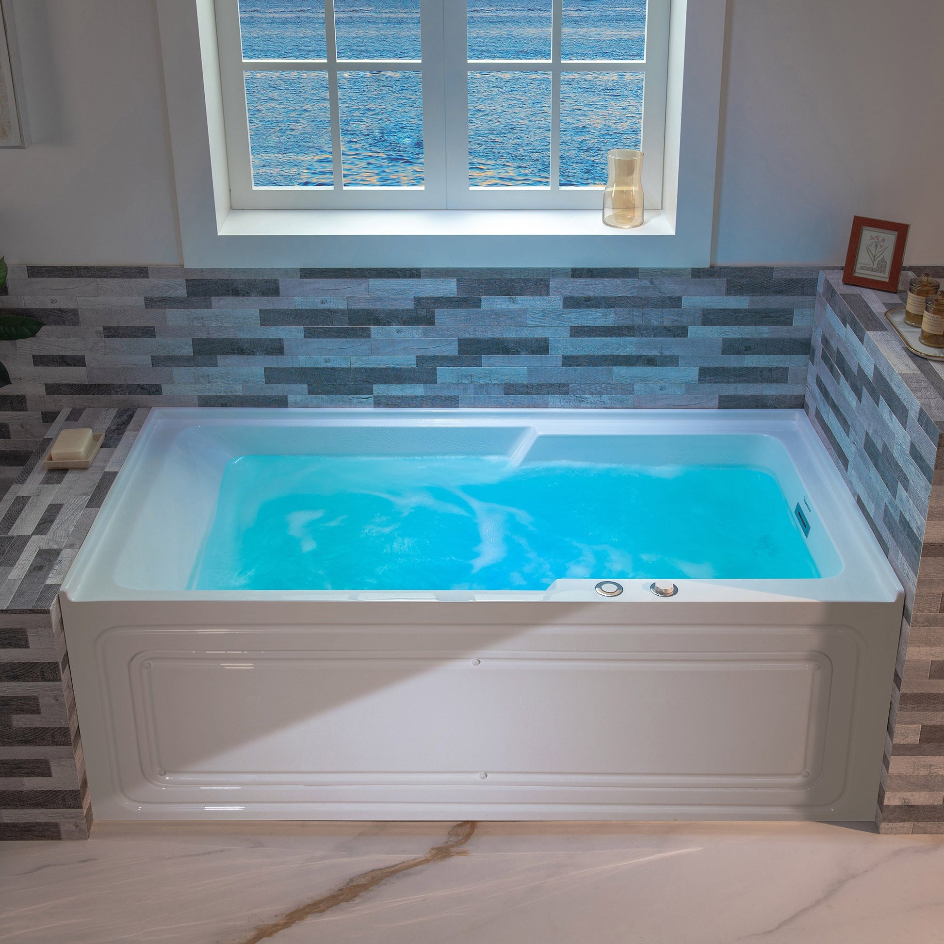 [DESIGN INSPIRATION]: Spaciously design providing maximum bathing space; integral three-sided tiling flange to prevent water damage to wall; 7 color LED lights offer a relaxing Chromotherapy experience, easily transform your bathroom into a personal spa.