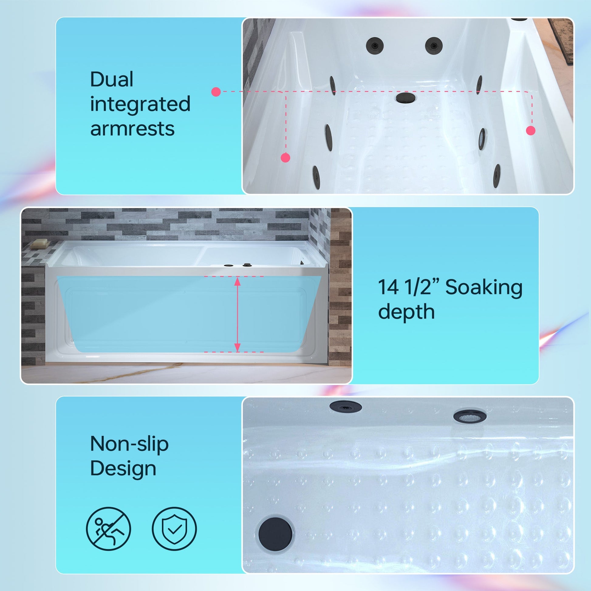 WOODBRIDGE 60" Alcove Acrylic Rectangular Whirlpool Heated Jetted Tub in White with Right Drain,
