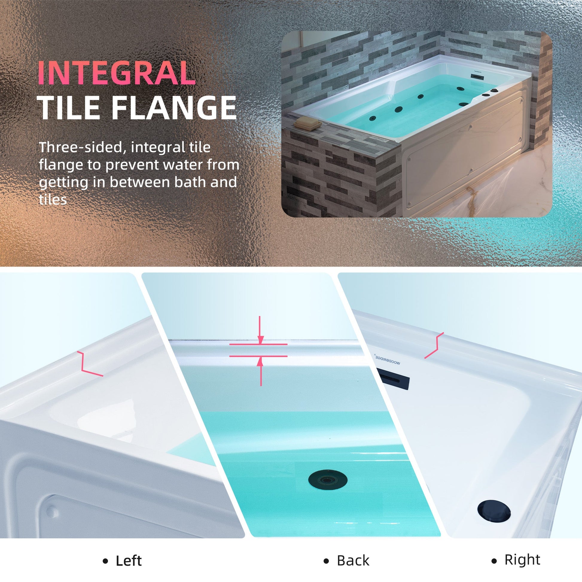 [DESIGN INSPIRATION]: Spaciously design providing maximum bathing space; integral three-sided tiling flange to prevent water damage to wall; 7 color LED lights offer a relaxing Chromotherapy experience, easily transform your bathroom into a personal spa.