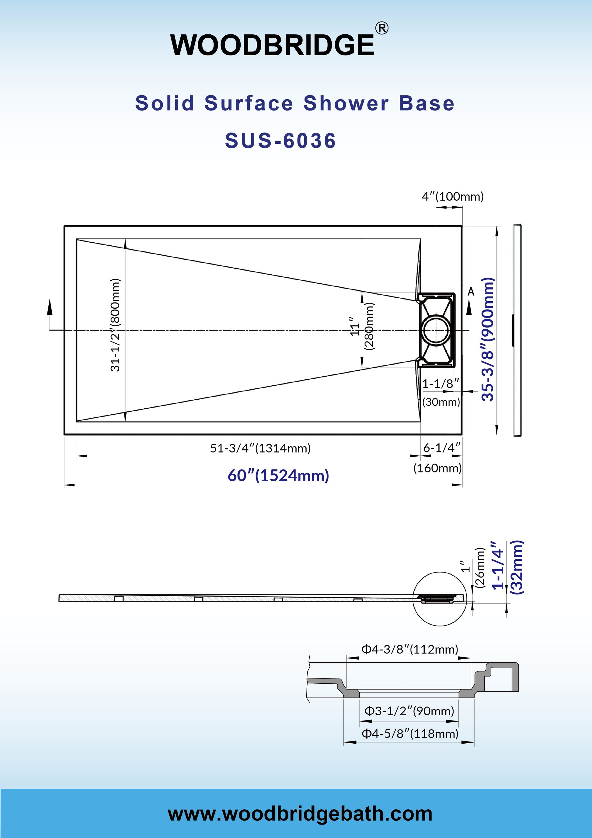WOODBRIDGE 60 in L x 35.4 in W Zero Threshold End Drain Shower Base with Reversible Drain Placement, Matching Decorative Drain Plate and Tile Flange, Wheel Chair Access, Low Profile