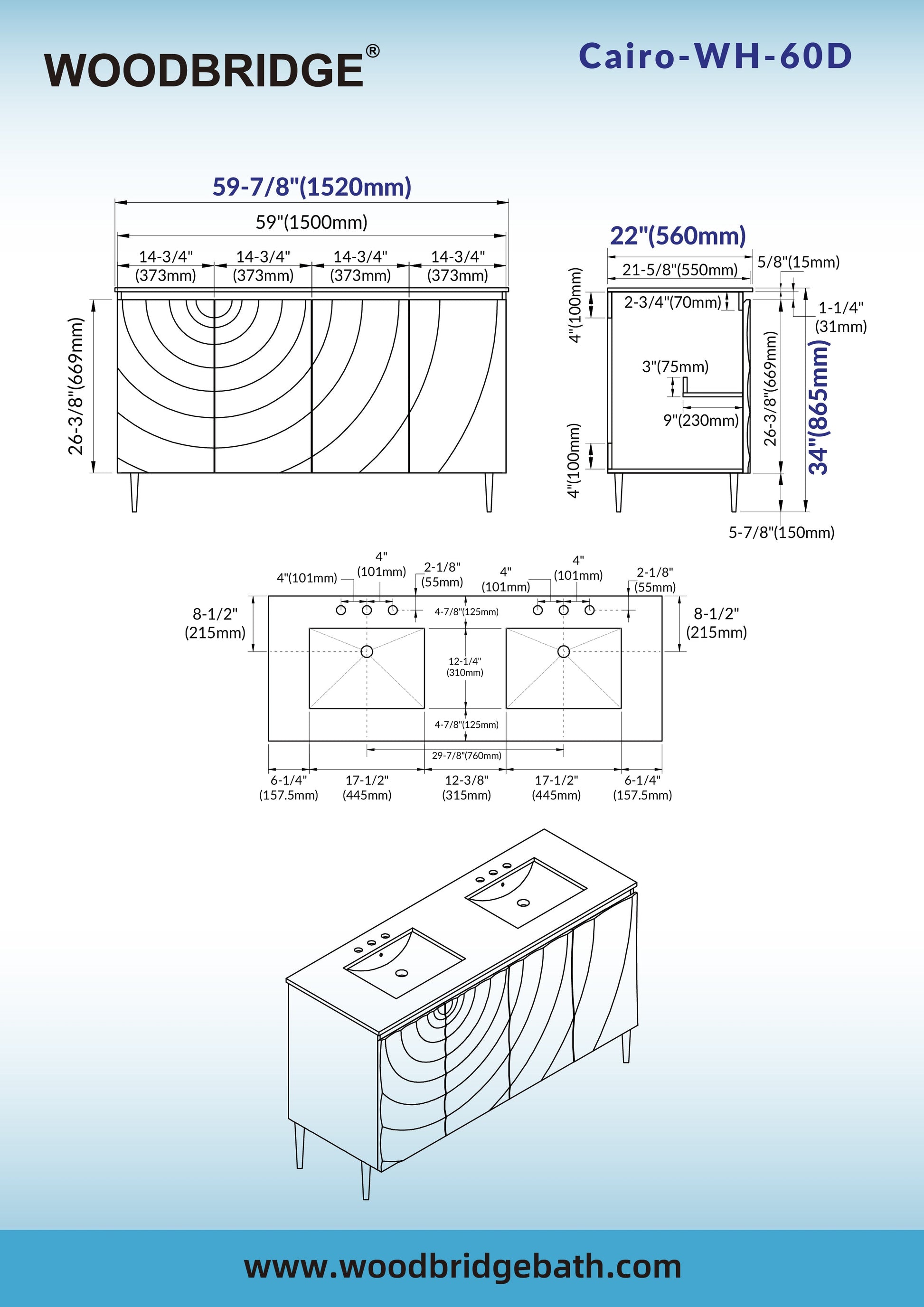 WOODBRIDGE 60"X22" Bathroom Vanity in White with Double Ceramic Undermount Sinks, White Engineered Stone Vanity Top– 3D Wave Pattern Doors, Sleek Thin-Leg Frame, Space-Saving for Modern Living