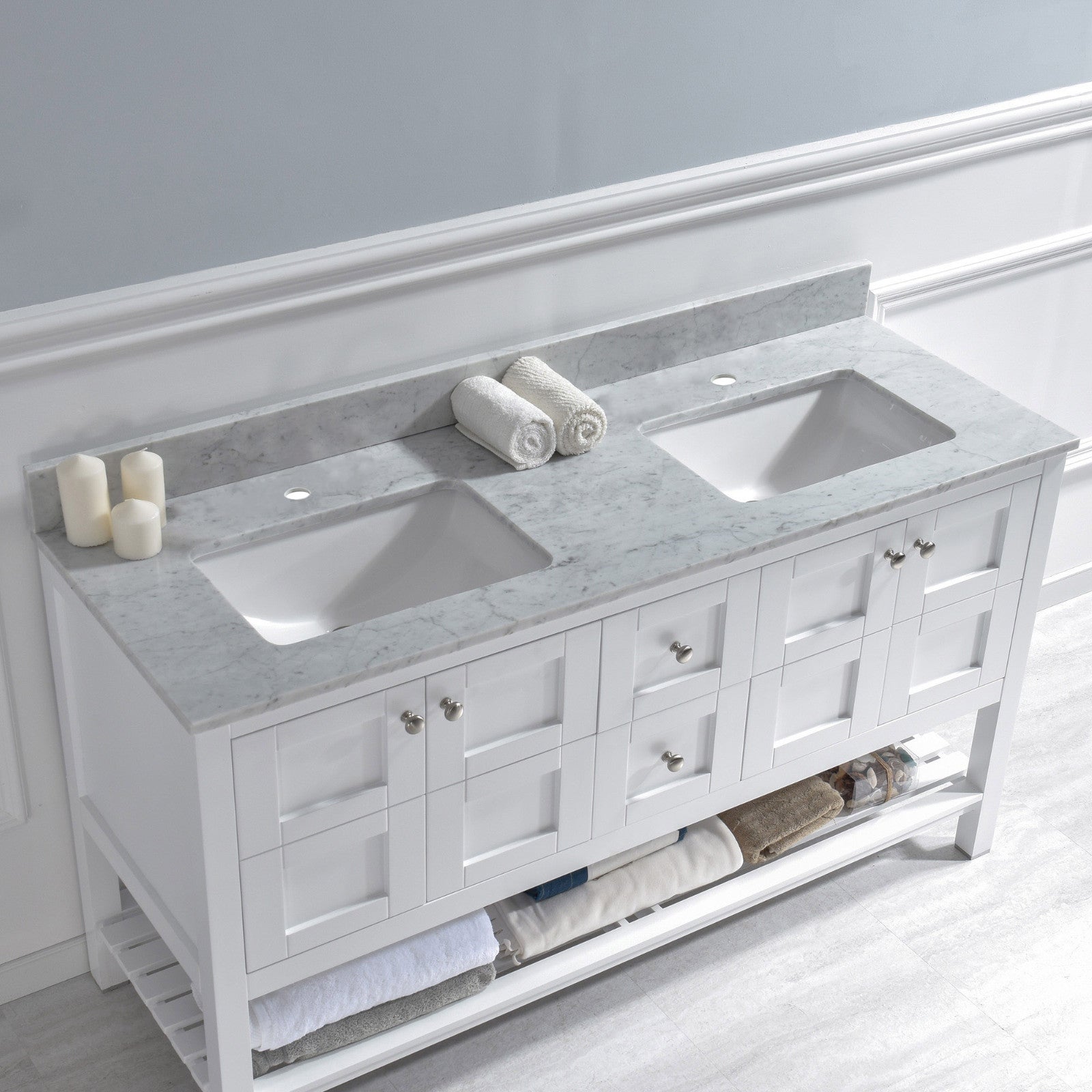WOODBRIDGE 61" x 22" Vanity Top with Double Under Mount Rectangle Bowls, Carrara White Marble, Pre-drilled with Single hole Faucet set up Option