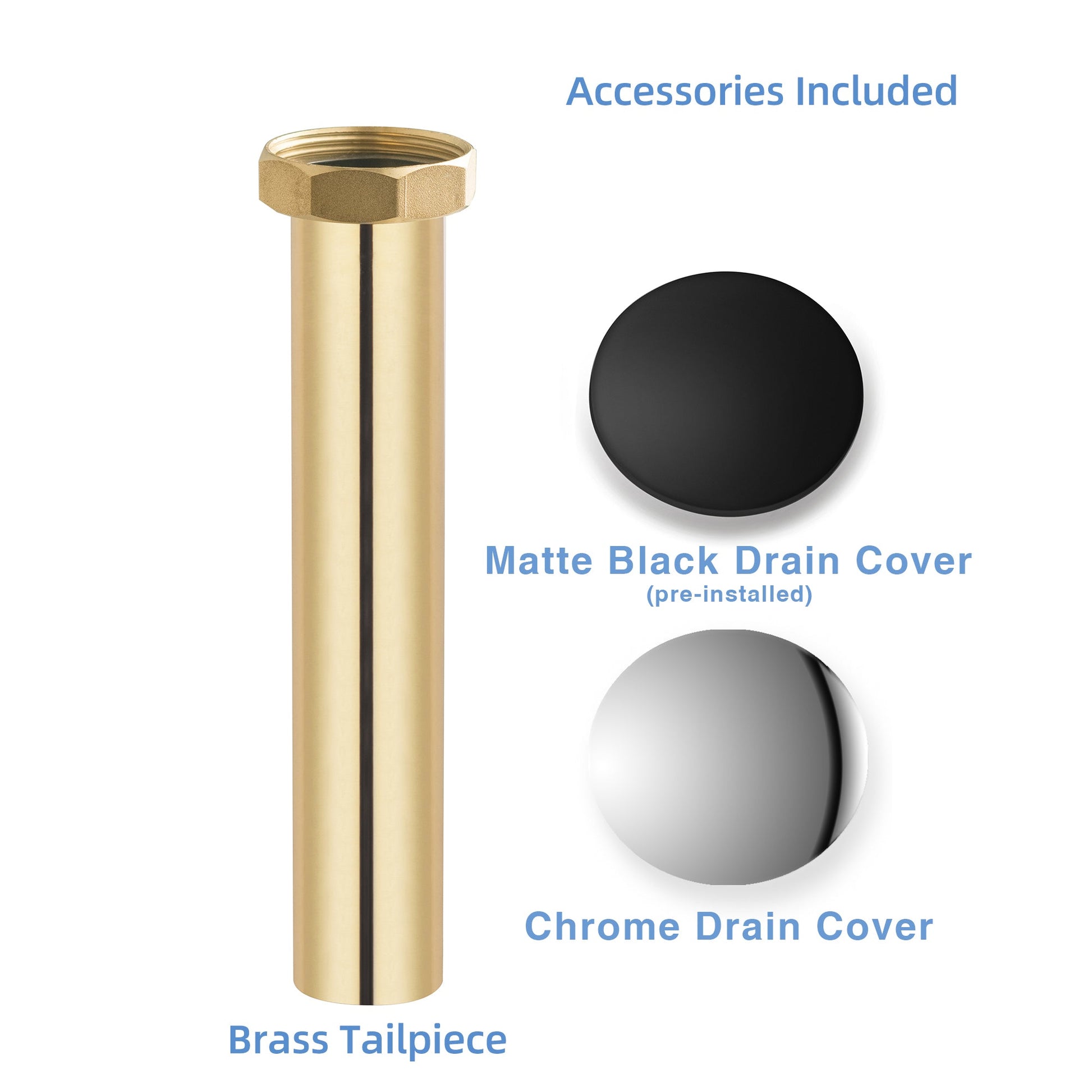 [Included]: Industrial-grade brass tailpiece and two drain covers (matte black pre-installed, extra chrome)