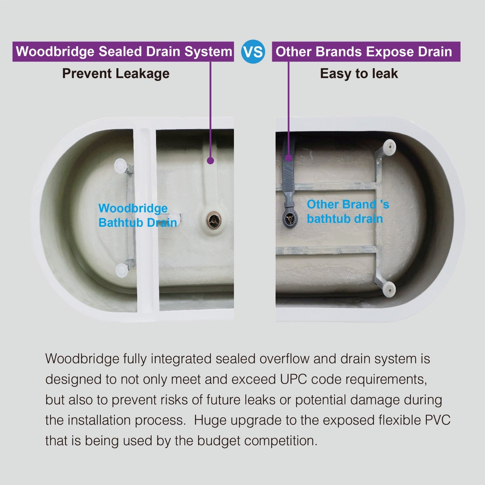 [PREMIUM QUALITY CONSTRUCTION]: Woodbridge bathtub is made out of 100% high gloss white LUCITE acrylic and reinforced with ASHLAND resin & fiberglass . All of these are top quality material which are rarely used by others due to a relatively high cost.