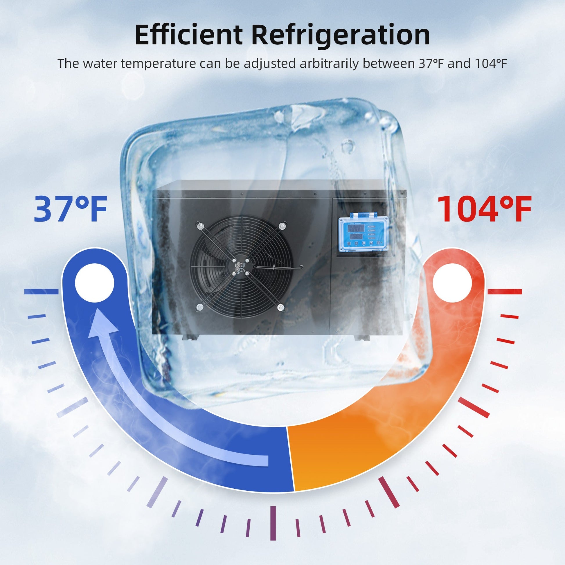 [INTEGRATED CHILLER SYSTEM]: Ultra-efficient chiller cools and heats, keeping water between 40–104°F, cooling by 7–10°F per hour. Values may vary based on conditions.