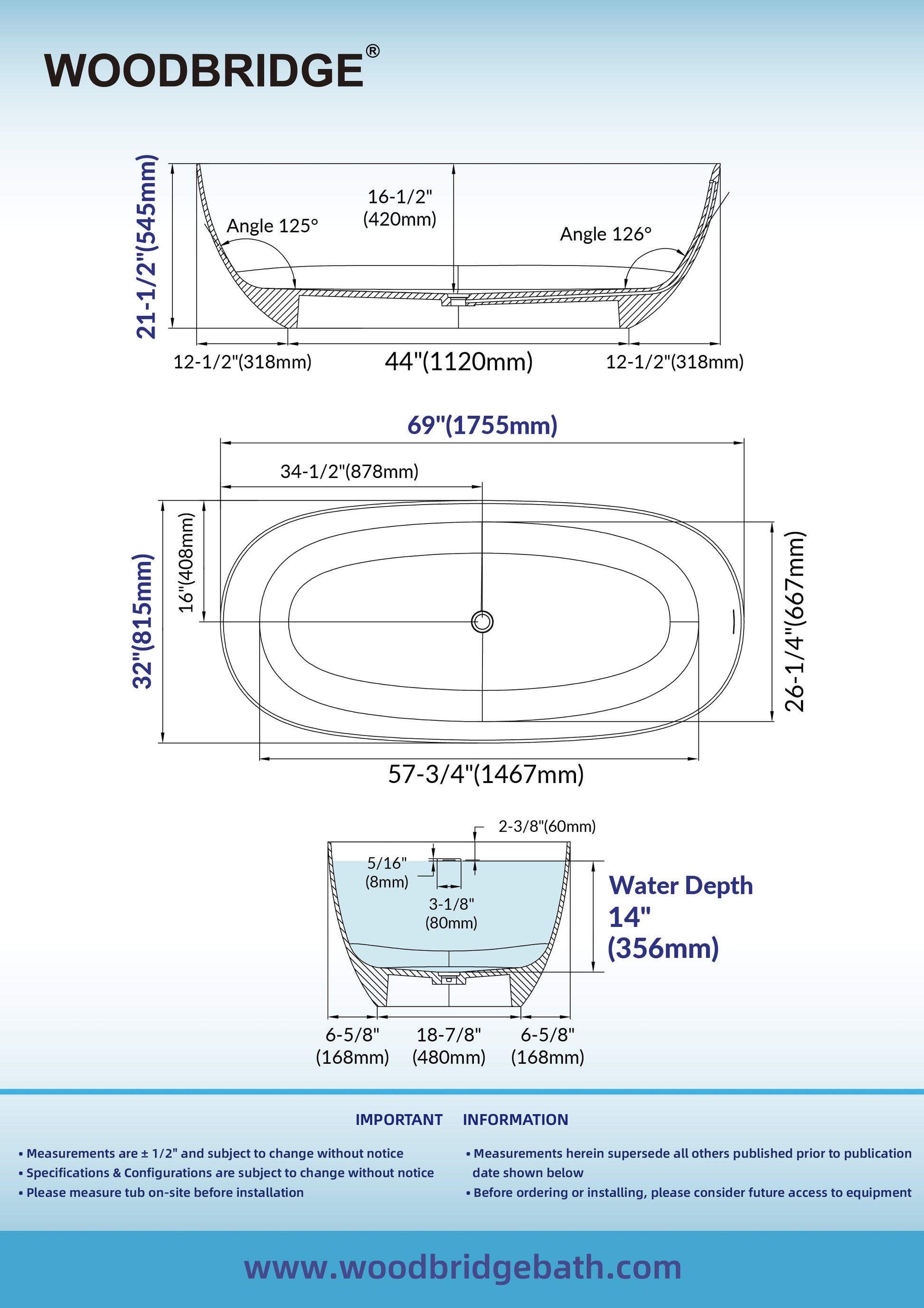 WOODBRIDGE 69" L x 32" W Luxury Contemporary Solid Surface Stone Resin Freestanding Bathtub