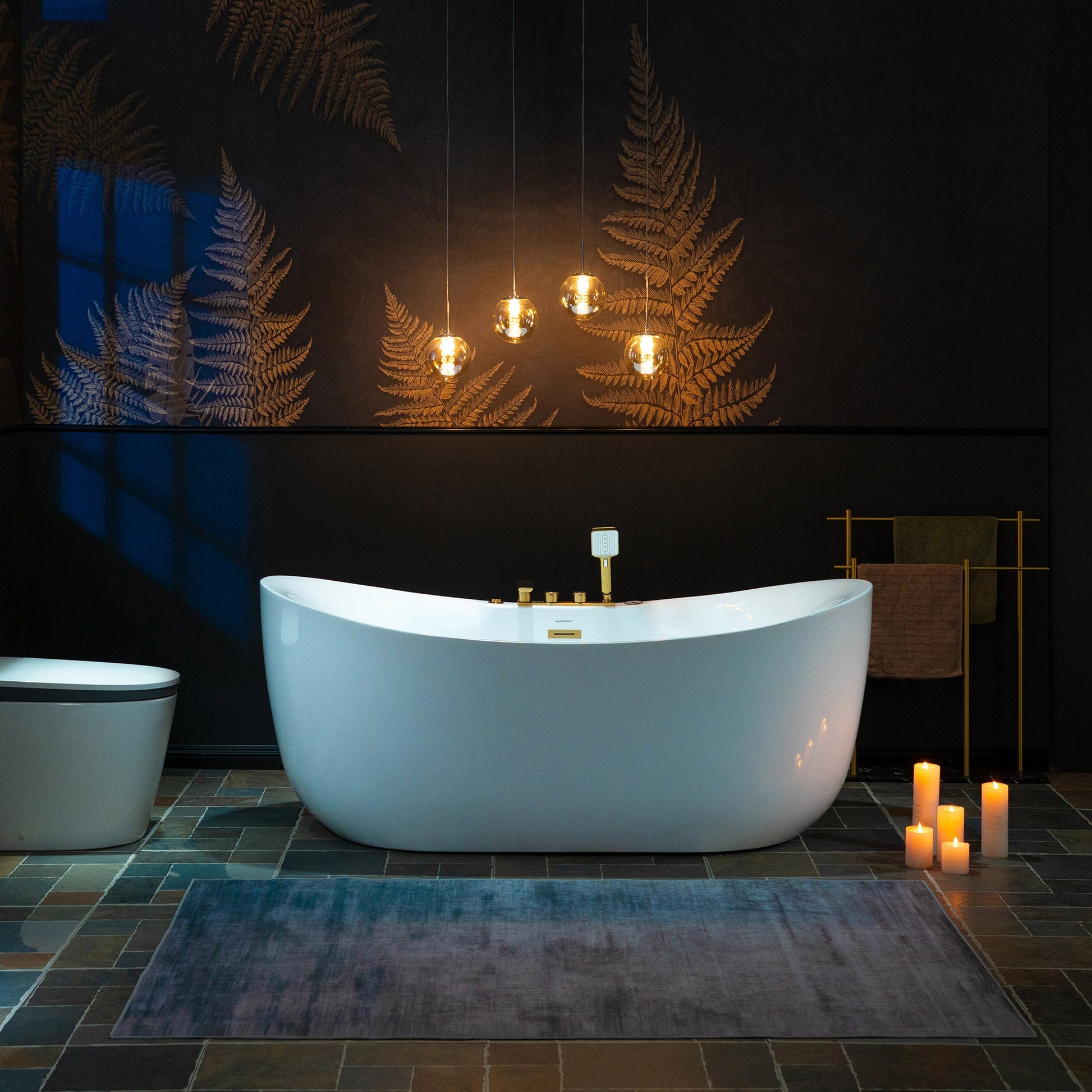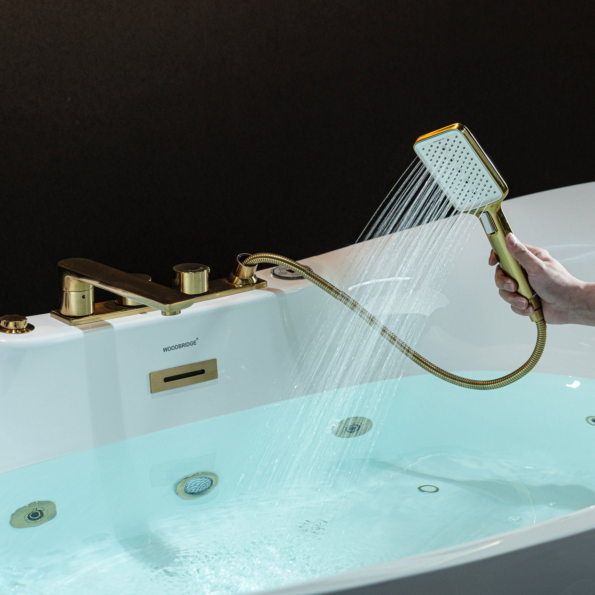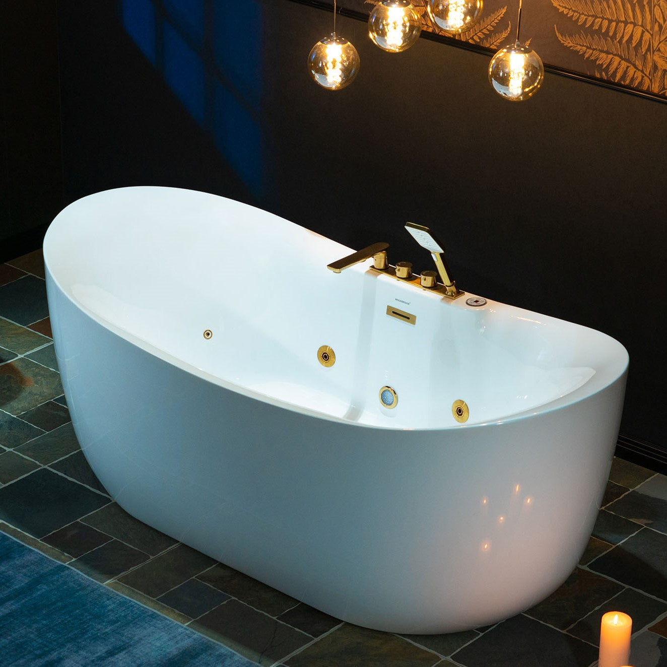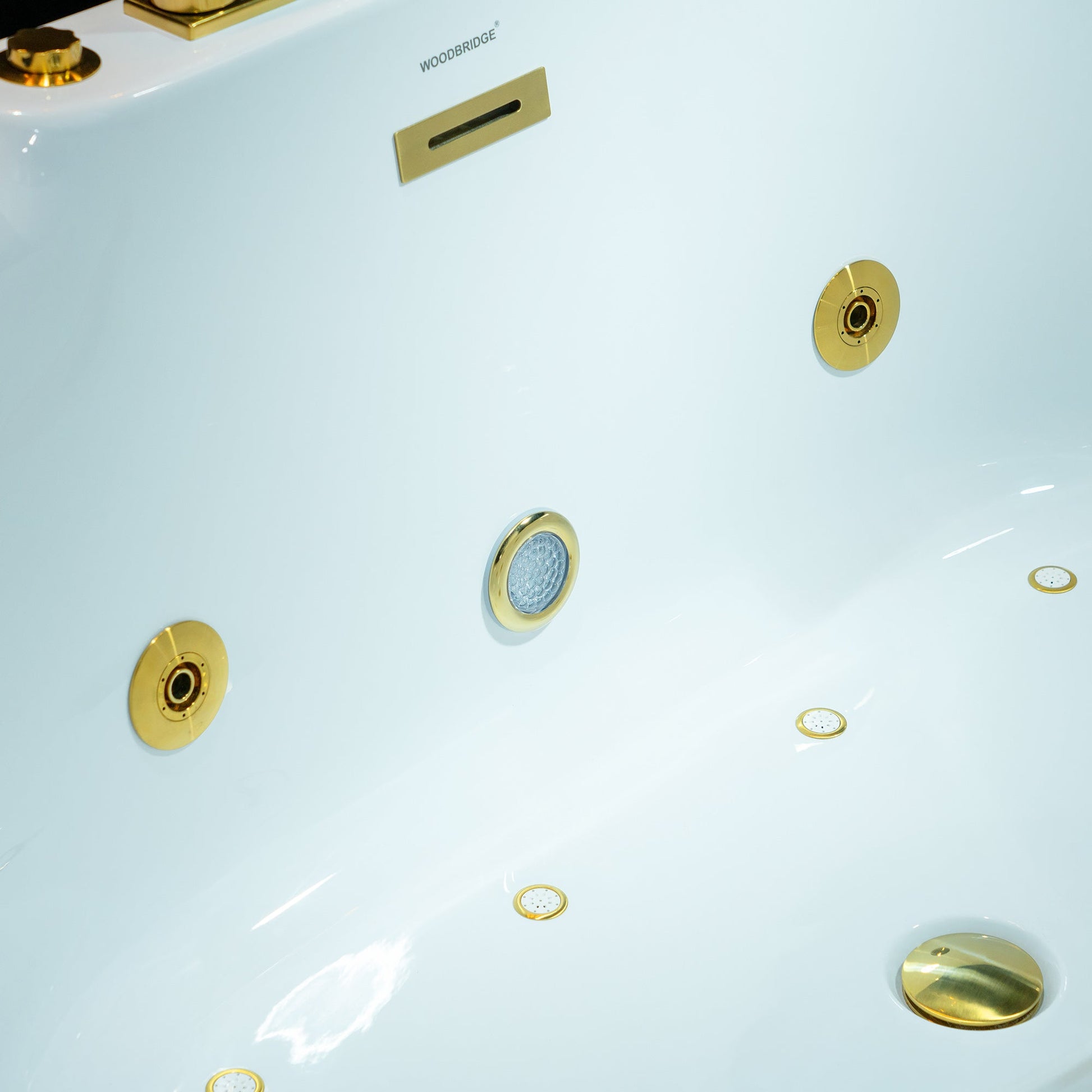 ? [BRUSHED GOLD JETS]: Luxurious brushed gold sanitary full-draining jets, paired with an underwater chromotherapy light, elegantly designed to enhance the bathing experience with a spacious and deep bathing well.
