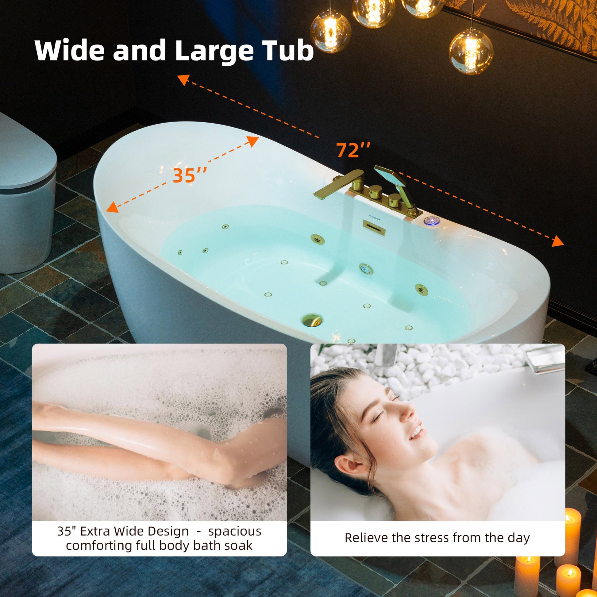 WOODBRIDGE 72" x 35-3/8" Whirlpool and Air Bath Heated Soaking Combination Tub with Adjustable Speed Air Blower and Display Control Panel, Brushed Gold Finish Trim and Drain Kit