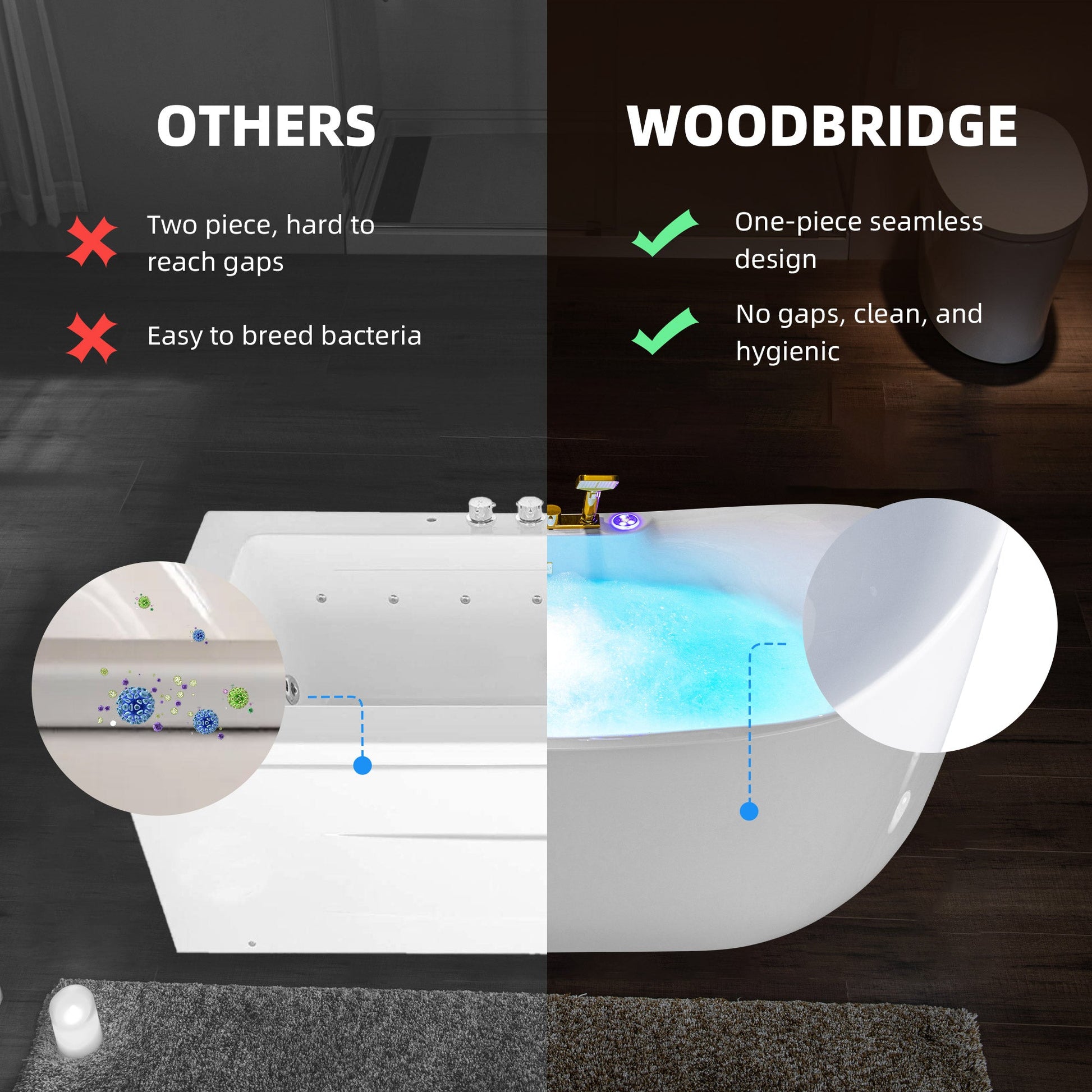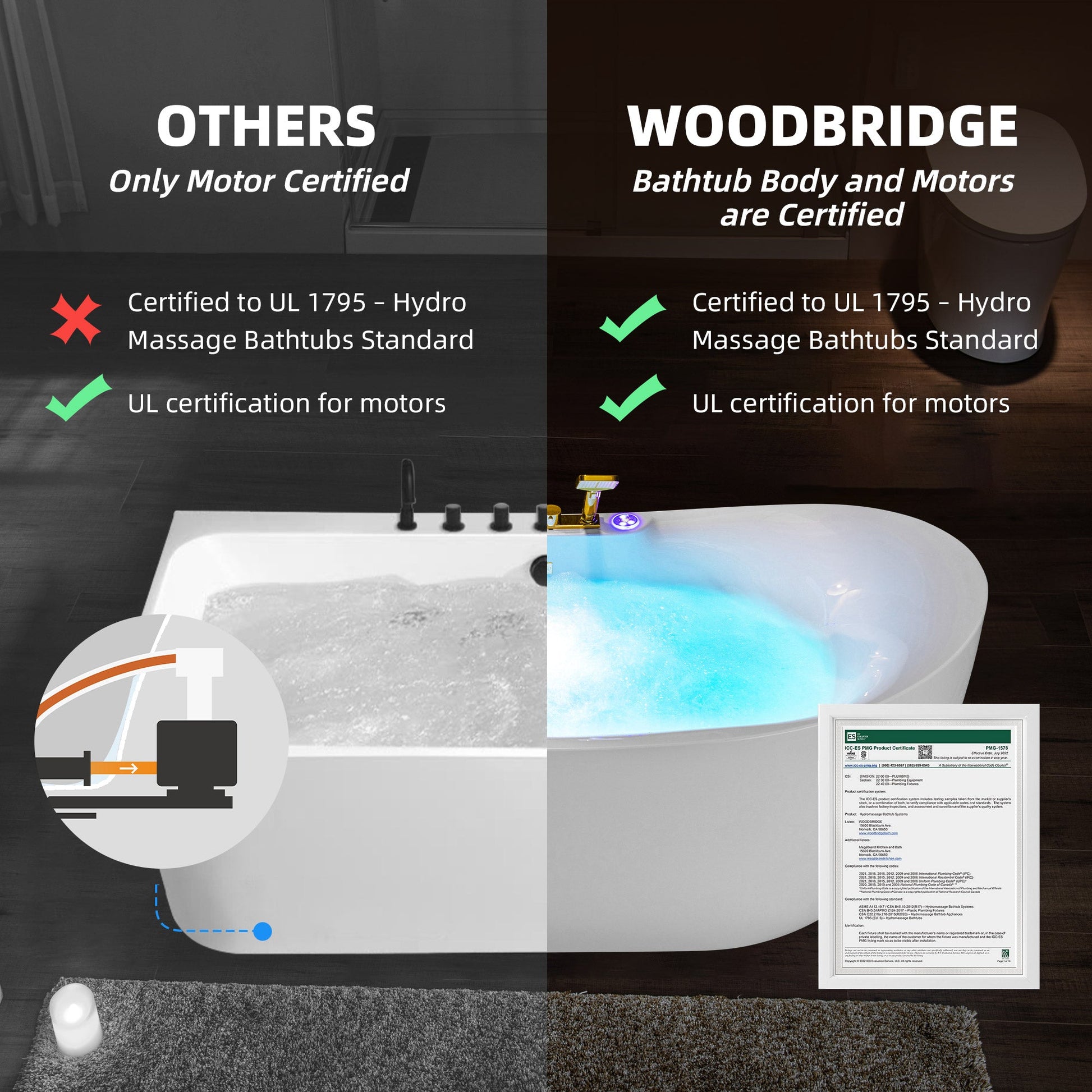 [CERTIFICATION & WARRANTY]: WOODBRIDGE Hydromassage bathtub is certified to UL1795. WOODBRIDGE warrants 1 Year limited warranty to be free of defects in material and workmanship from date of purchase.