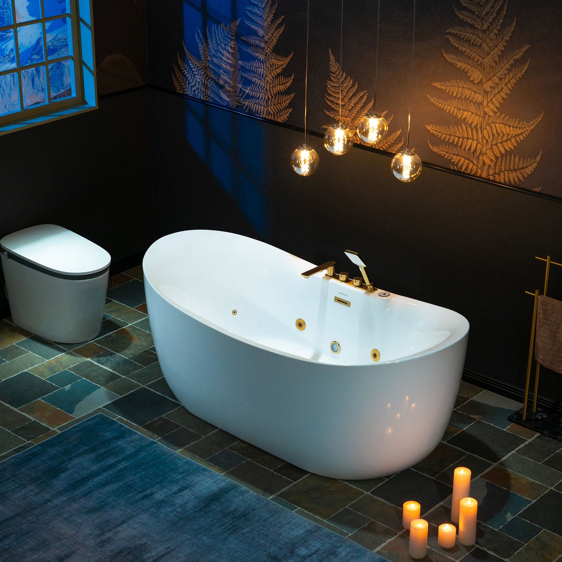 [PACKAGE INCLUDED]: Bathtub x 1, Pre-installed faucet x 1, Pre-assembled Brushed Gold finish drain and overflow x 1, user guide and installation manual x 1. Excellent package - a substantial carton box is used to transport bathtubs, ensuring a safe delivery.
