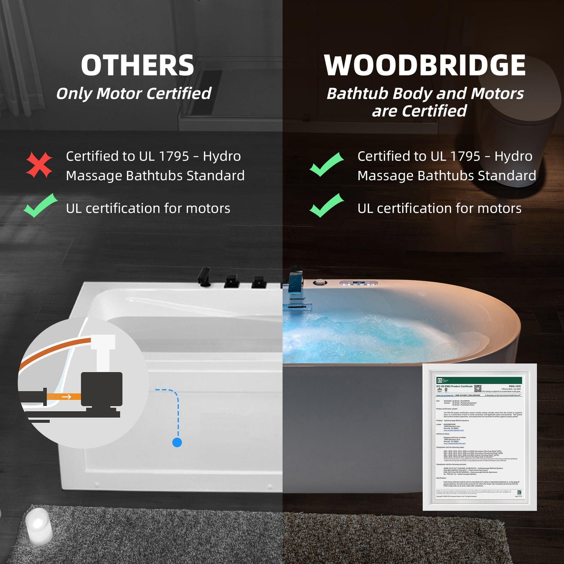 ? [CERTIFICATION & WARRANTY]: WOODBRIDGE Hydromassage bathtub is certified to UL1795. Complies with ASME A112.19.7/CSA B45.10, CSA B45.5/IAPMO Z124, CSA C22.2 No.218. IPC and NPC.