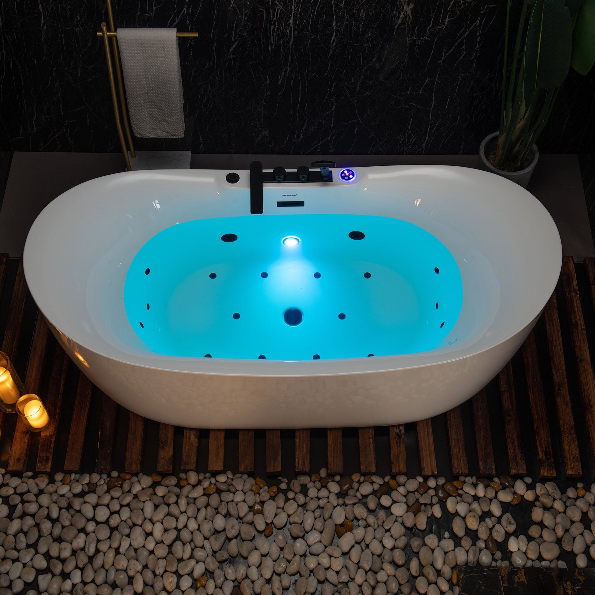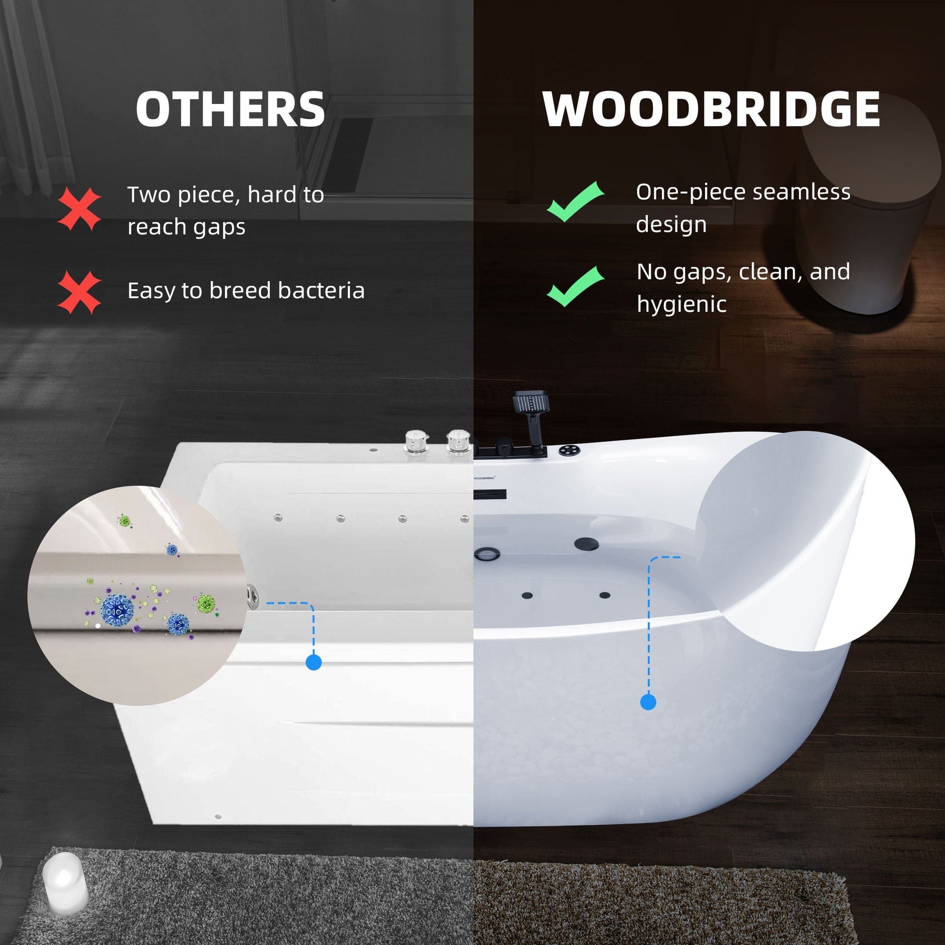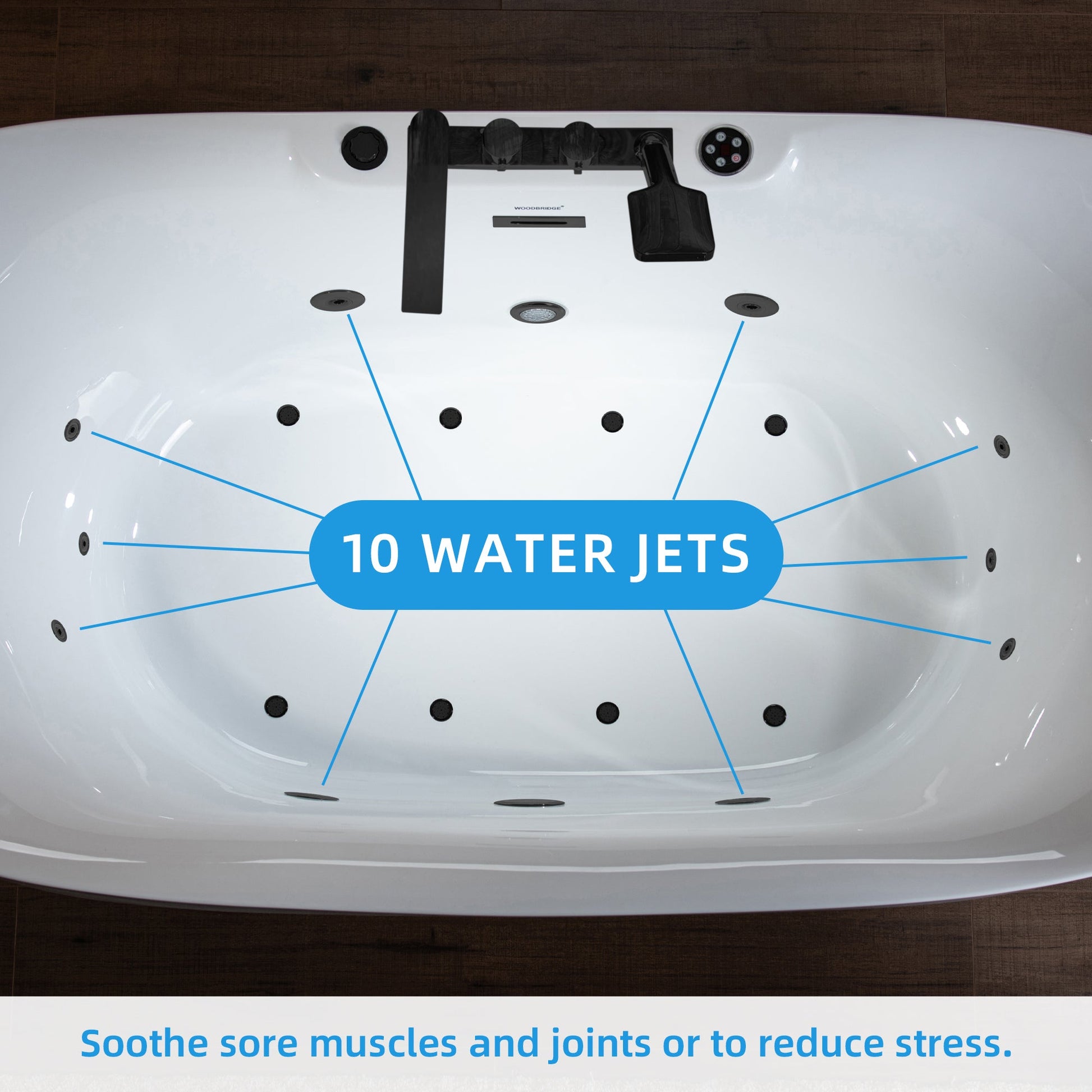 [WHIRLPOOL AND AIR BUBBLE]: The WOODBRIDGE Deluxe acrylic freestanding bathtub seamlessly integrates whirlpool and air bubble jets into a single tub. It includes a pop-up drain, overflow cover, and features jets and nozzles in a stylish matte black finish.