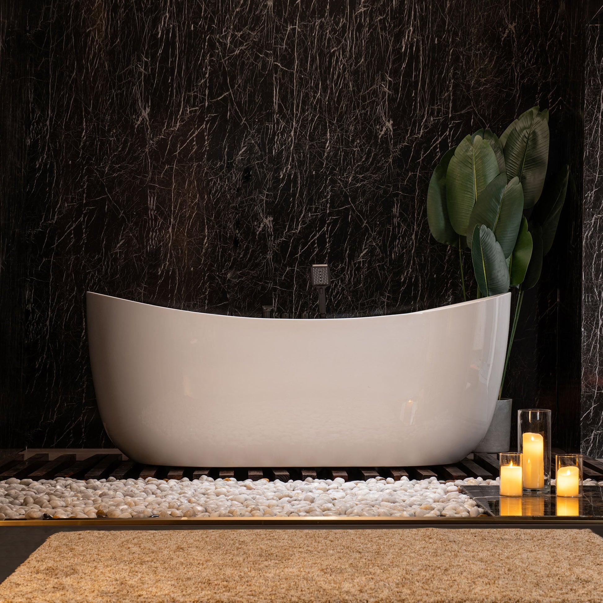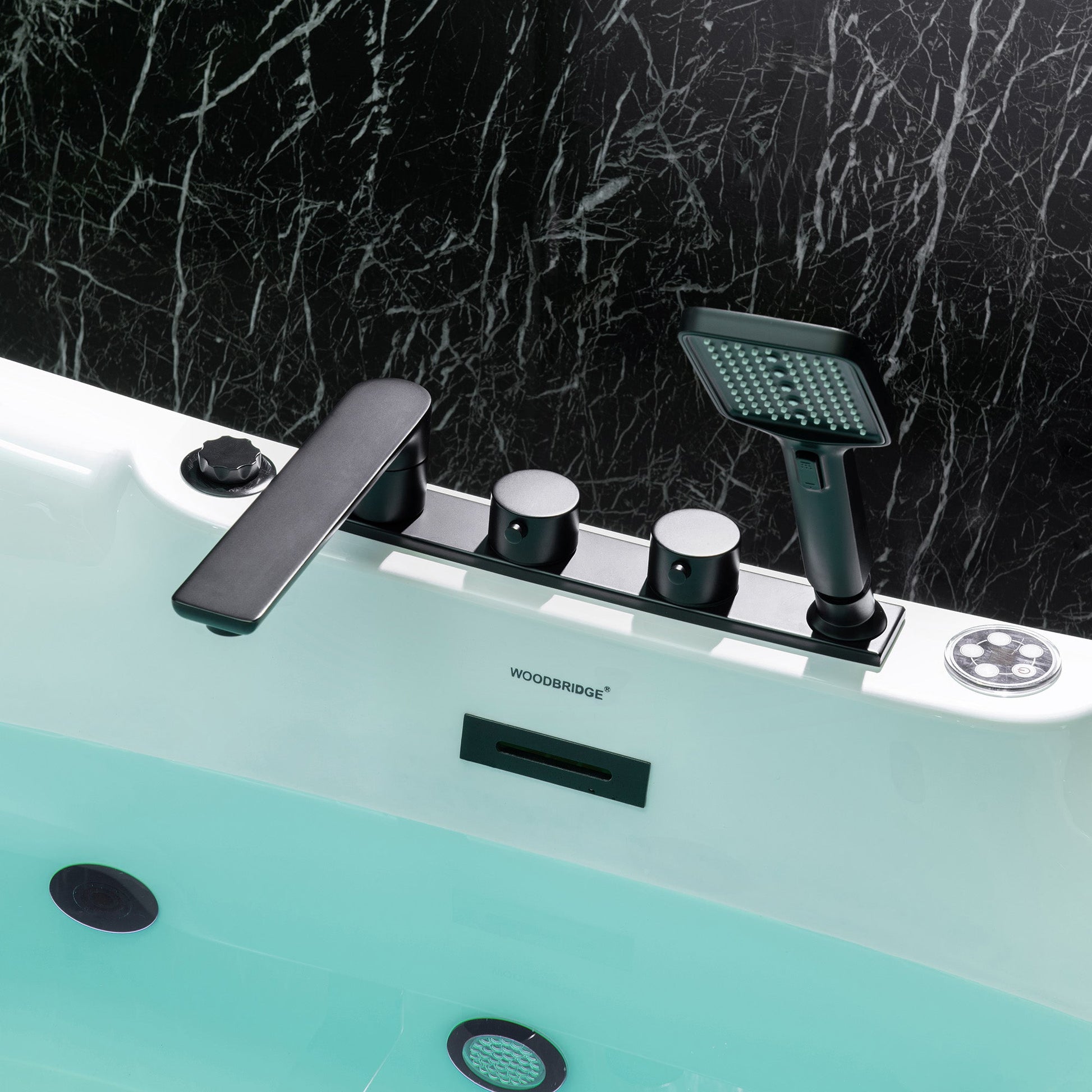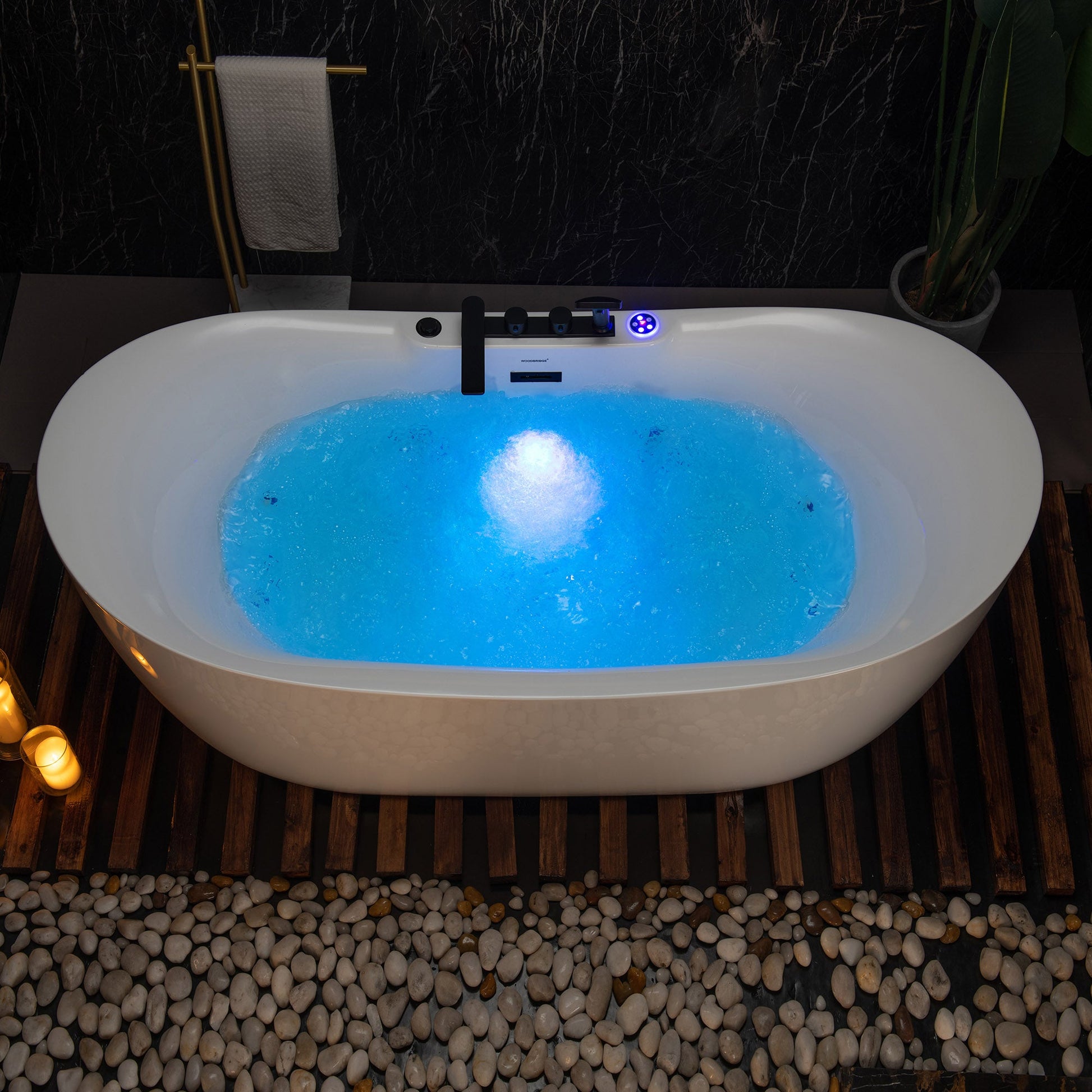 [WHIRLPOOL AND AIR BUBBLE]: The WOODBRIDGE Deluxe acrylic freestanding bathtub seamlessly integrates whirlpool and air bubble jets into a single tub. It includes a pop-up drain, overflow cover, and features jets and nozzles in a stylish matte black finish.