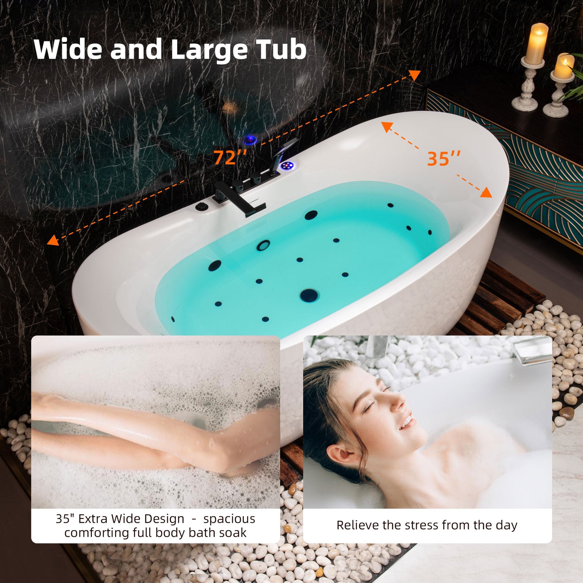 WOODBRIDGE 72" x 35-3/8" Whirlpool and Air Bath Heated Soaking Combination Tub with Adjustable Speed Air Blower, Tub Filler, and LED control panel, Matte Black Finish Trim and Drain Kit
