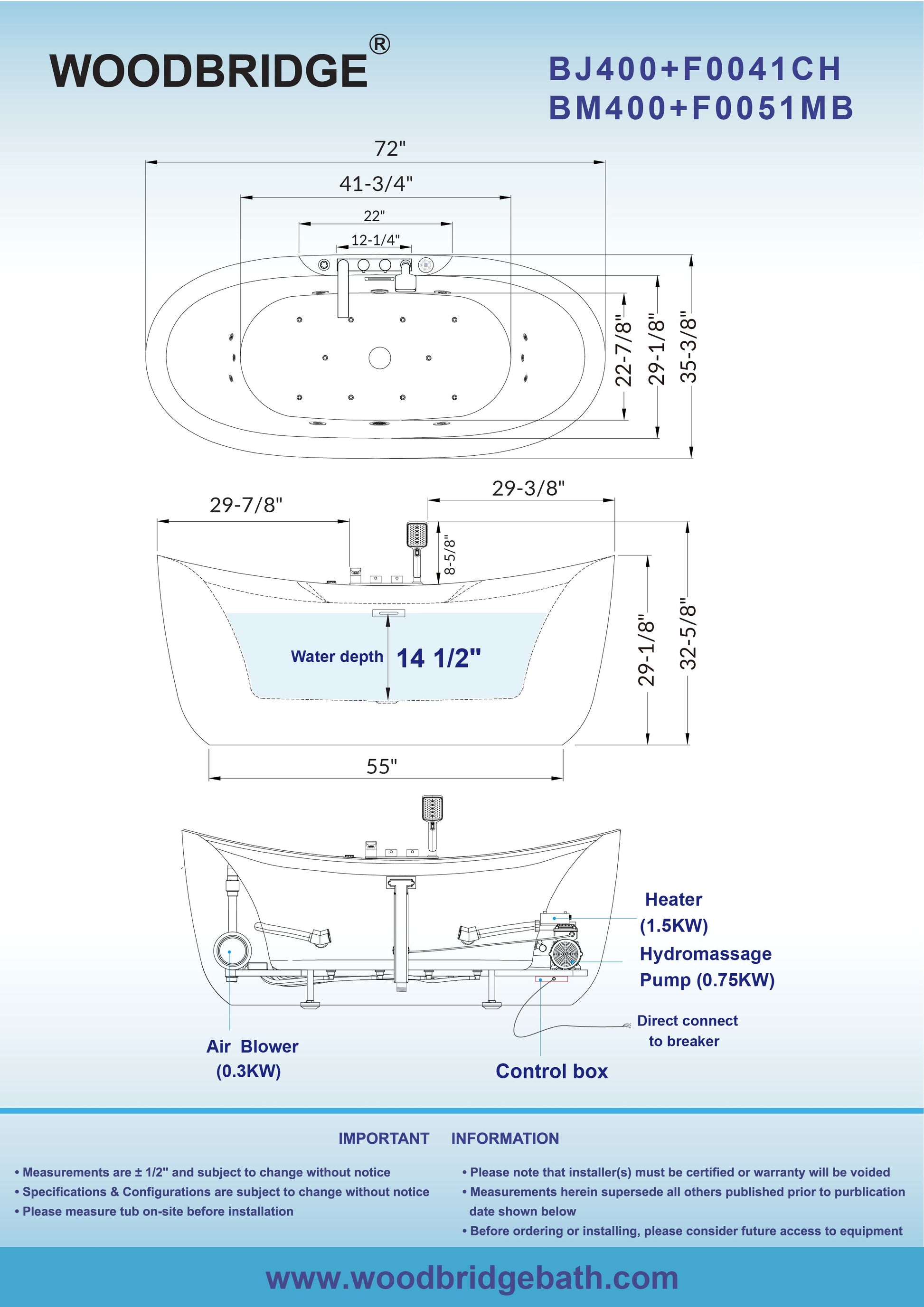 [DIMENSIONS AND SPECIFICATIONS]: Exterior Dimension: 72" L x 35-3/8" W x 32-5/8" H – Effective Tub Capacity: 65 Gallons; Seating Dimension: 41-3/4" L x 22-7/8" W, Water Depth to Overflow: 14-1/2". Power Requirements: 1 Dedicated 120V 30AMP Breakers