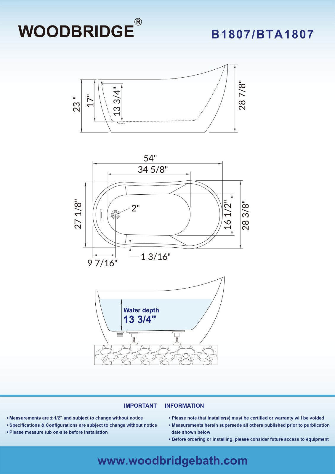 ? [DIMENSIONS AND SPECIFICATIONS]: Exterior Dimension: 54" Long x 28 3/8" Wide x 28 7/8" Deep – Effective Tub Capacity: 55 Gallons , Brushed Nickel Drain and Overflow.