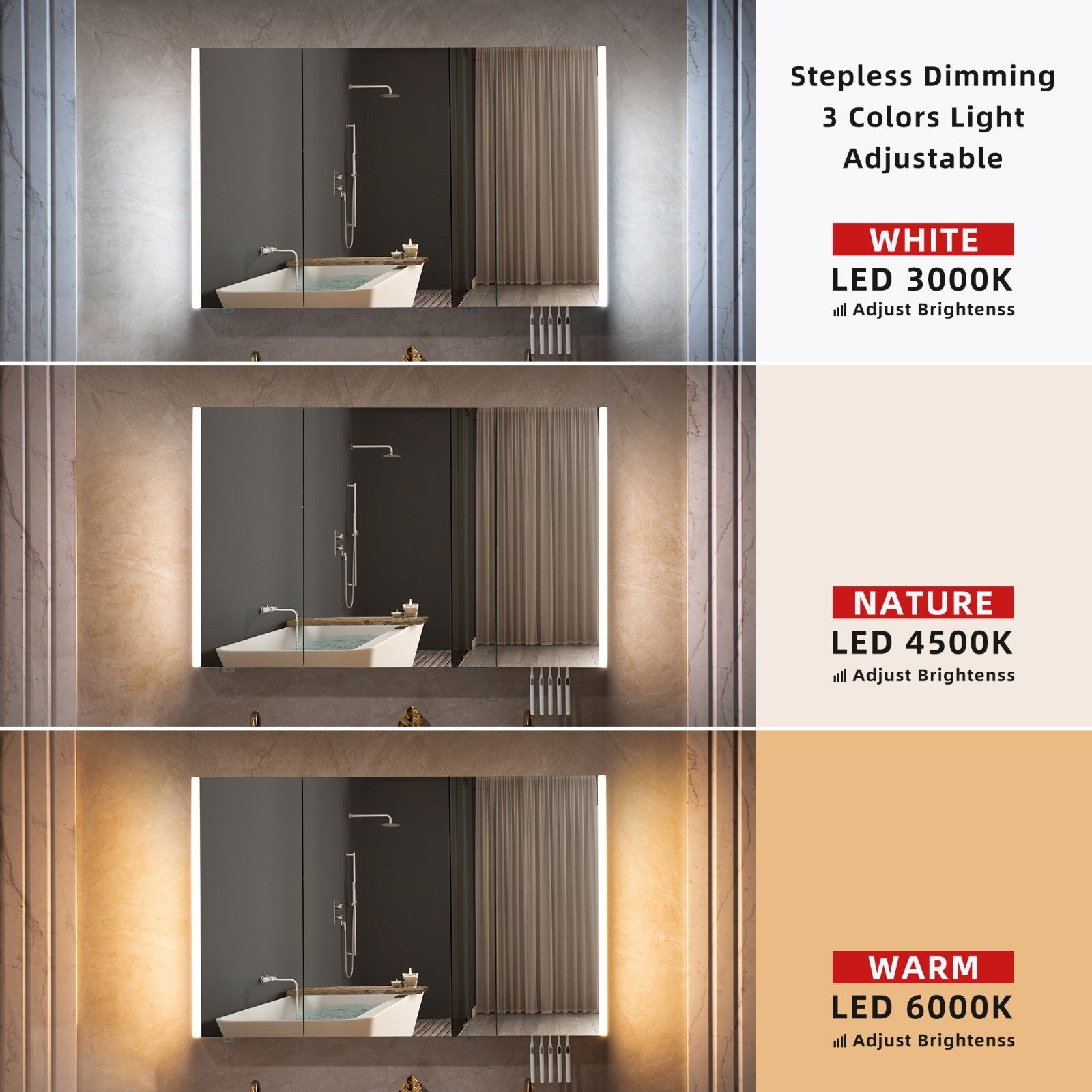 ? [DIMMABLE LED ILLUMINATION LIGHT]: Dimmable 3000K/4500K/6000K LED lighted frame provides a natural feel daytime color and brightens on both sides of the mirror, bringing light to your room and enriching details in the mirrors reflection.