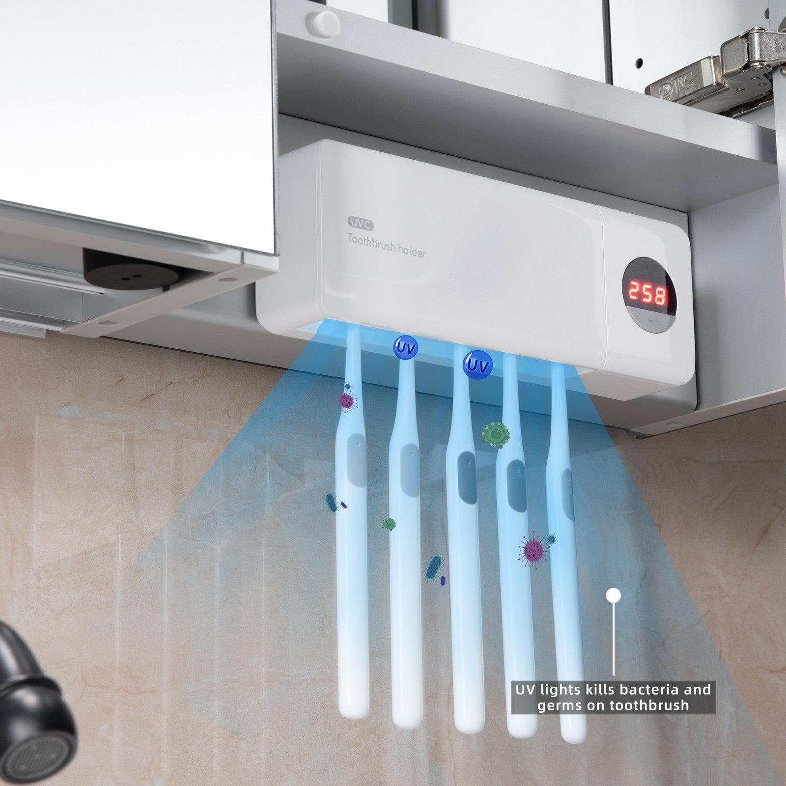 ? [ UV STERILIZATION]: Build in UV Sterilization to kill germs and bacteria on hand towels and toothbrush, keep the countertop clean and organized; detachable toothbrush sanitizer uv light will auto stop when the cover is opened.