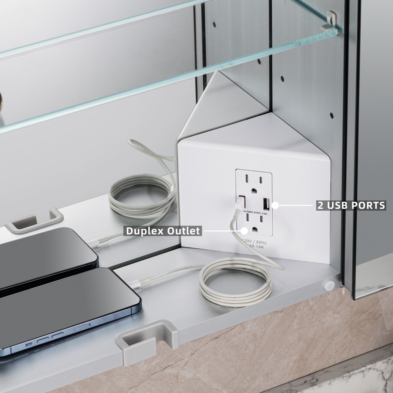 ? [ELECTRICAL & USB OUTLET ]: Build-in two power outlet (14A, 3-Hole)and two USB charging port (3.6A)for shavers and phone charging inside the cabinet while bathing and save your time.