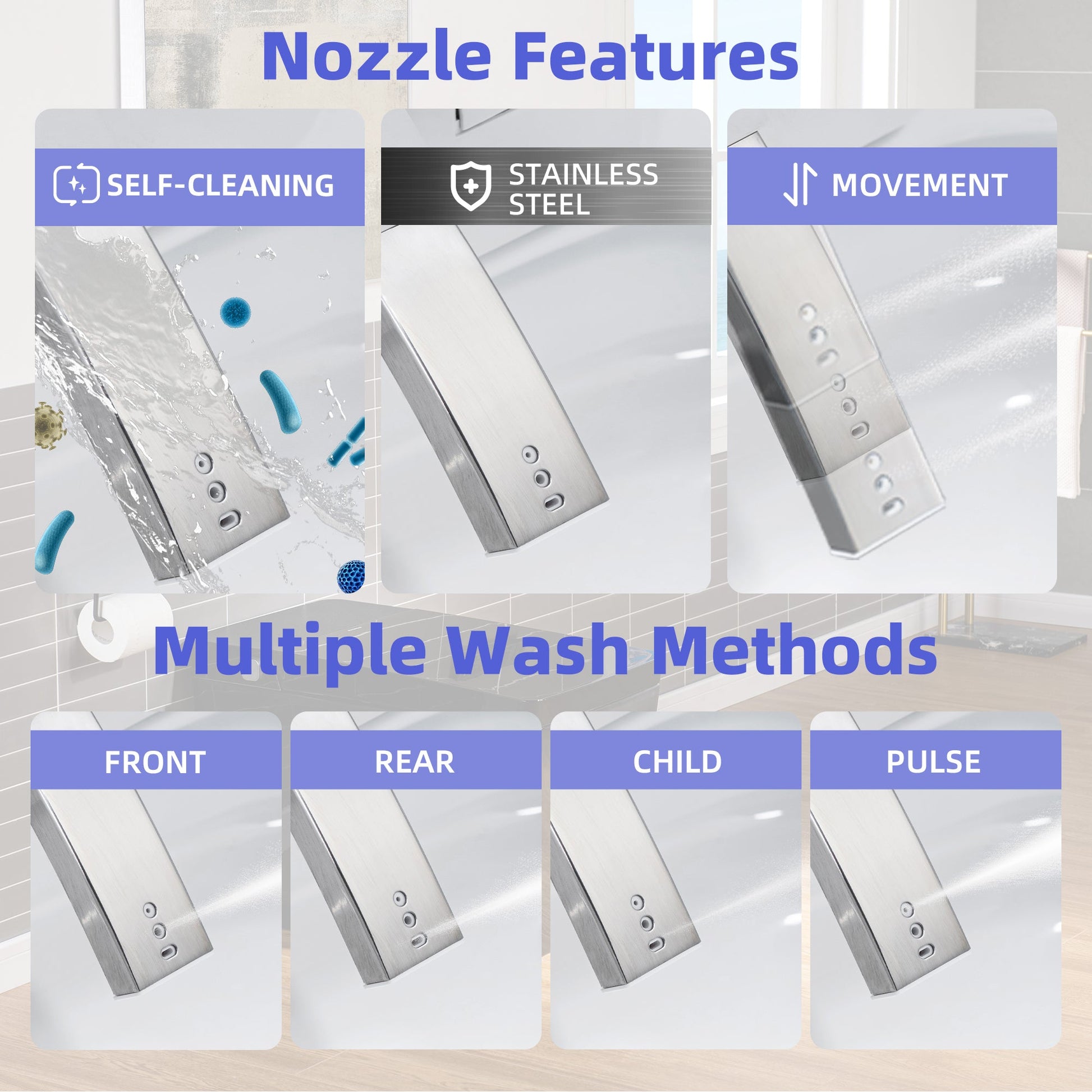 ? [COMPLETE HYGIENE]: Enjoy total cleanliness with Posterior wash, Feminine wash, Pulsating wash, Child wash, and Enema wash options, all with adjustable water pressure and filtered water for hygiene.