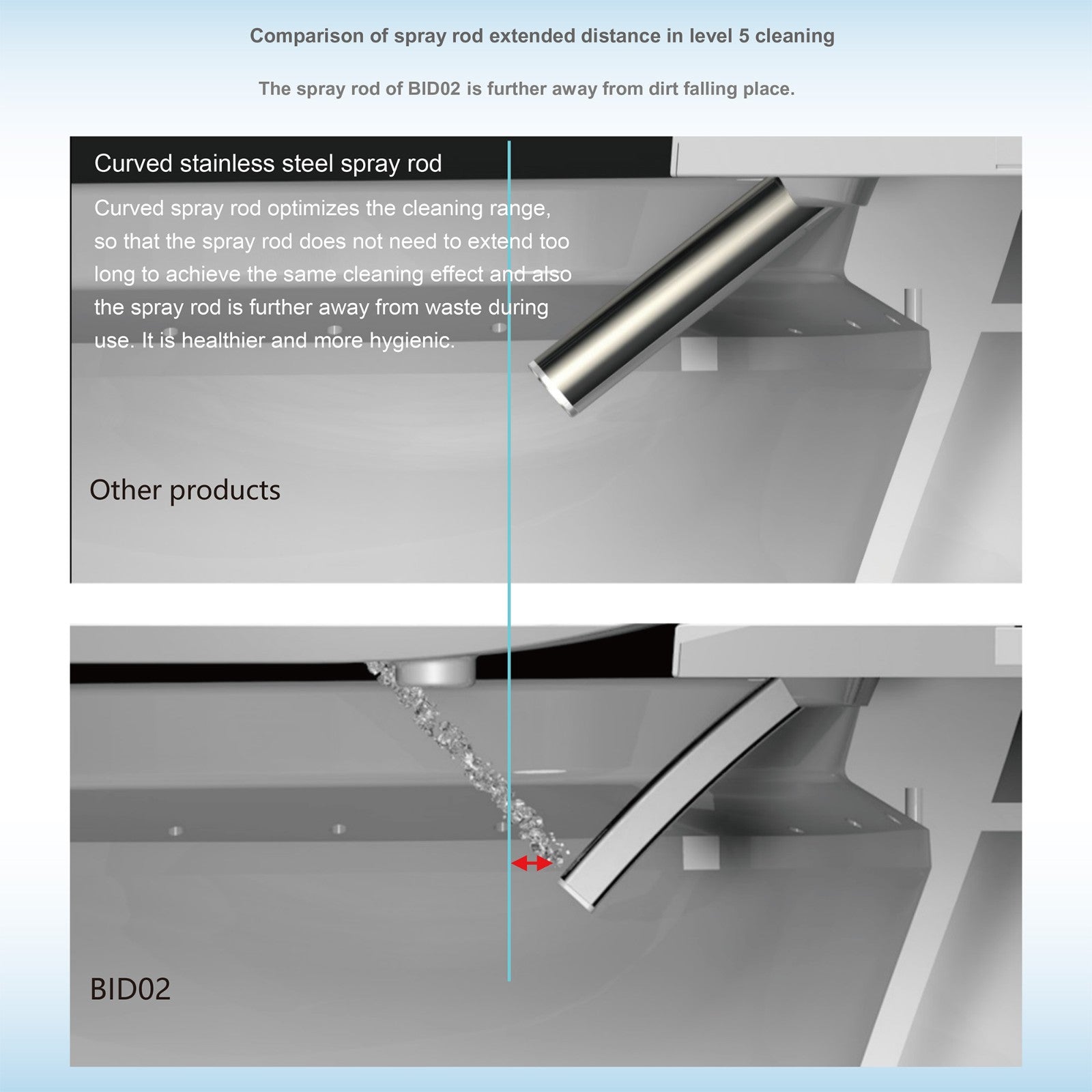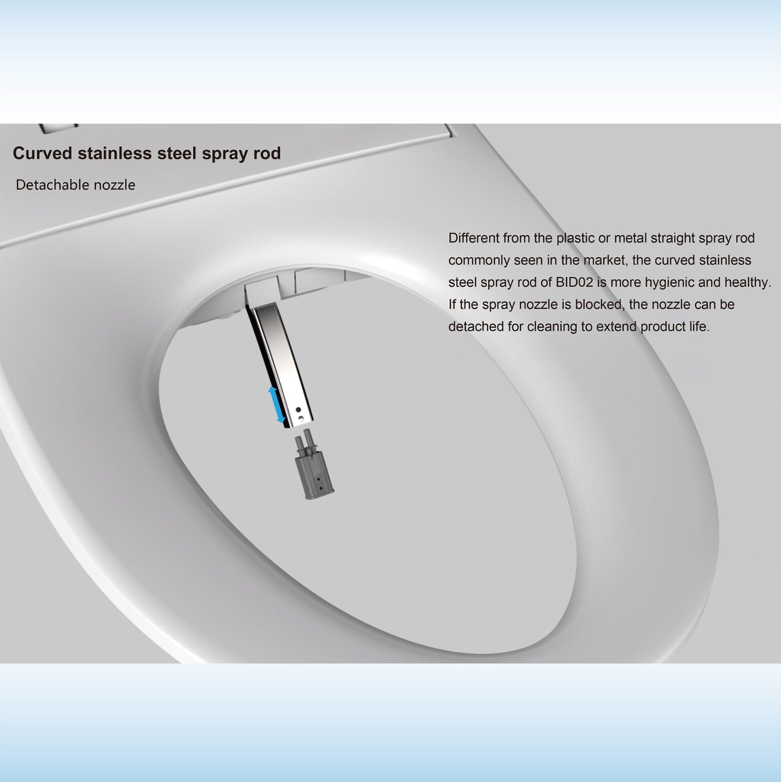 ? [STAINLESS STEEL NOZZLE]: Stainless-steel self-cleaning nozzle for maximum hygiene and durability, with both positional rear and front washes. Curved stainless steel spray rod & Detachable nozzle Design.