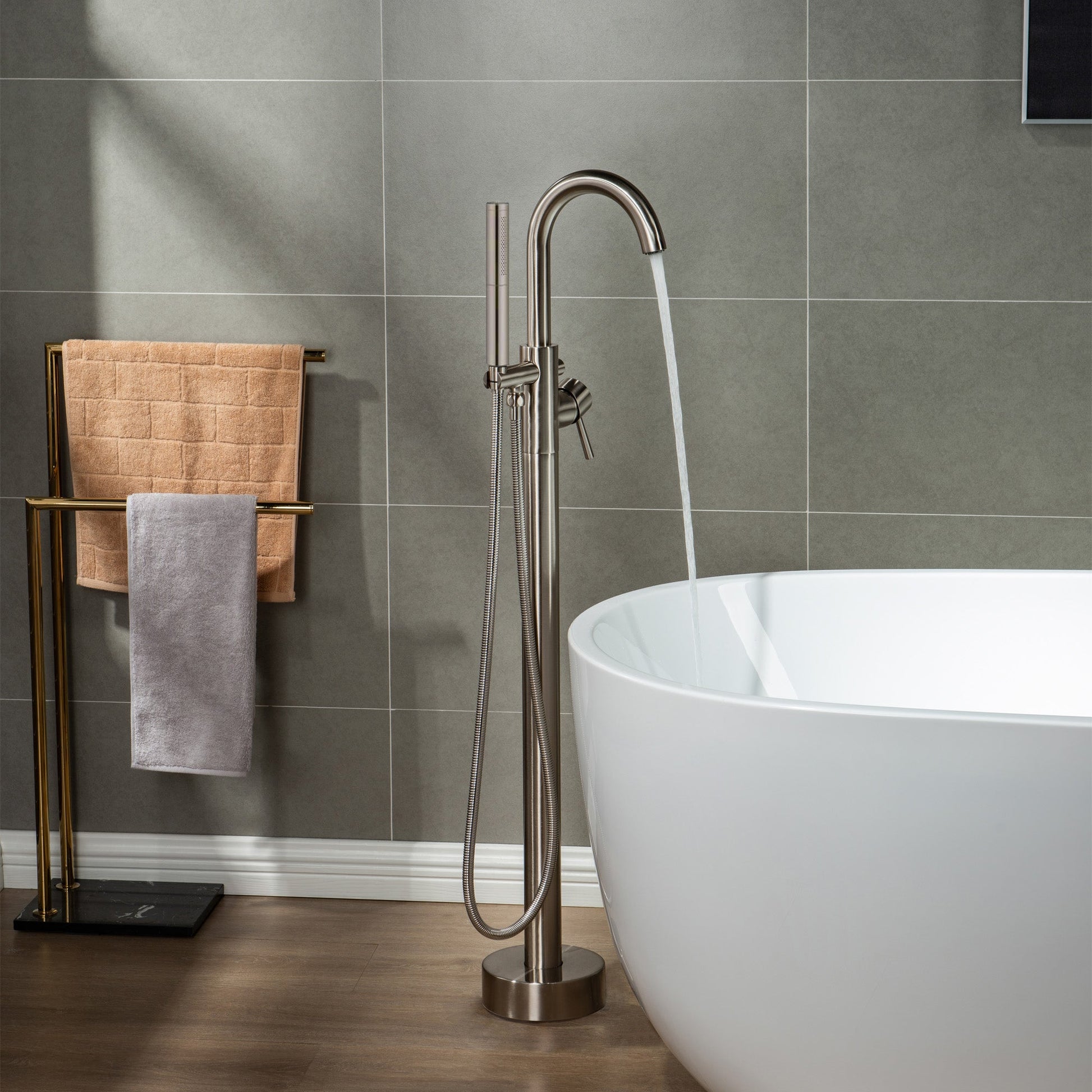 ? [DESIGN INSPIRATION]: Quick freestanding mount to floor design with high and rigid tripod mounting bracket and hardware included. Easy operation single handle design allows flow rate and temperature control in single hand. High Arch 360 Degree Swivel Spout.